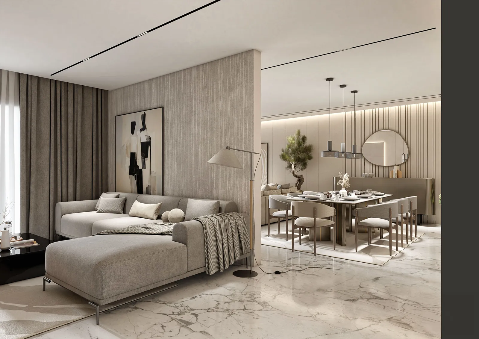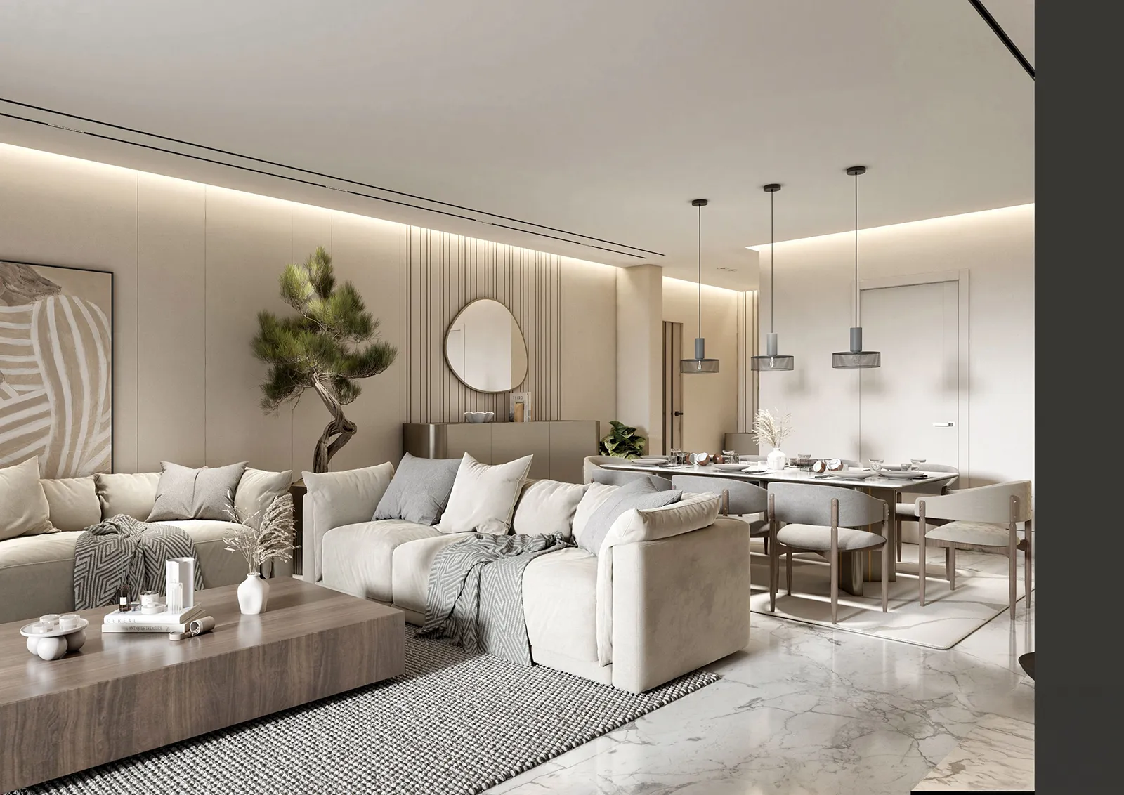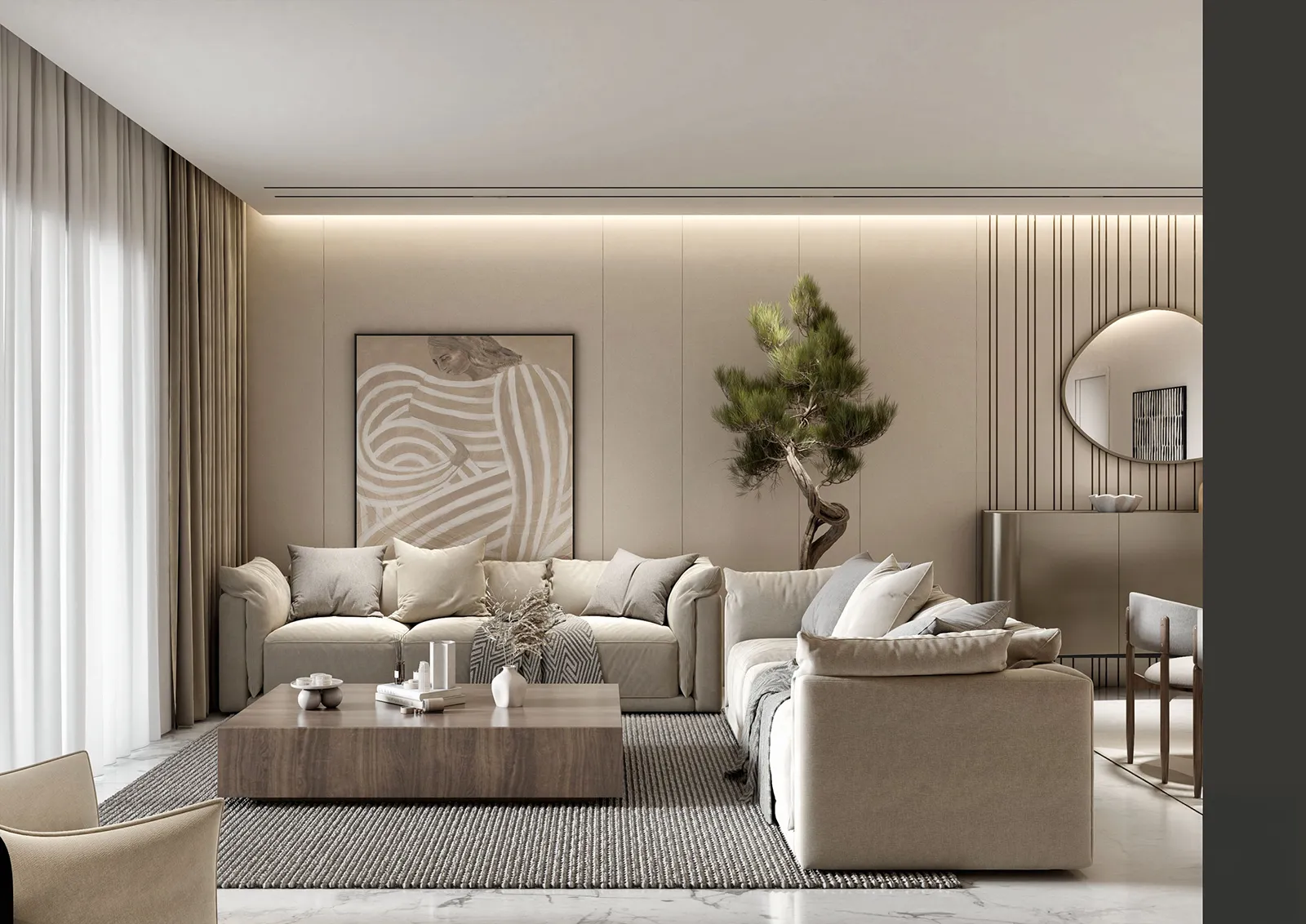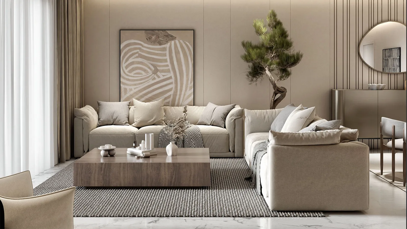 - Foundation: The palette is built on a foundation of soft grays, off-whites, and muted taupes, which creates a harmonious and serene atmosphere throughout the space.