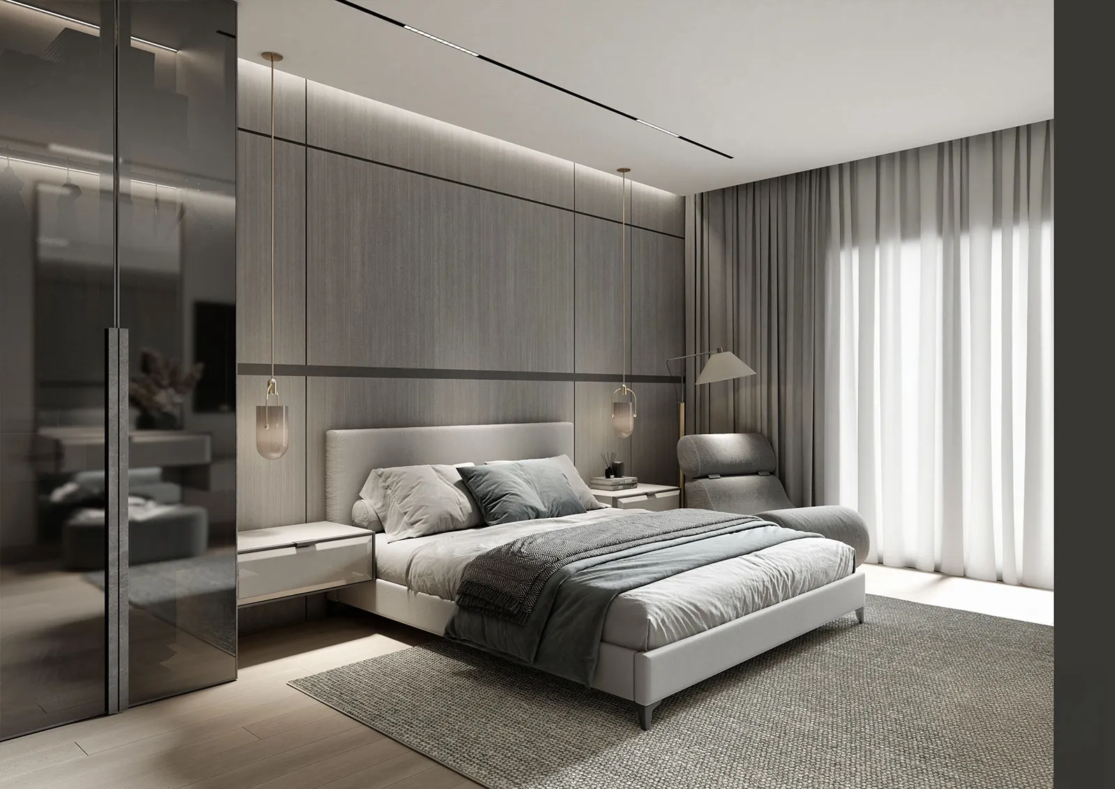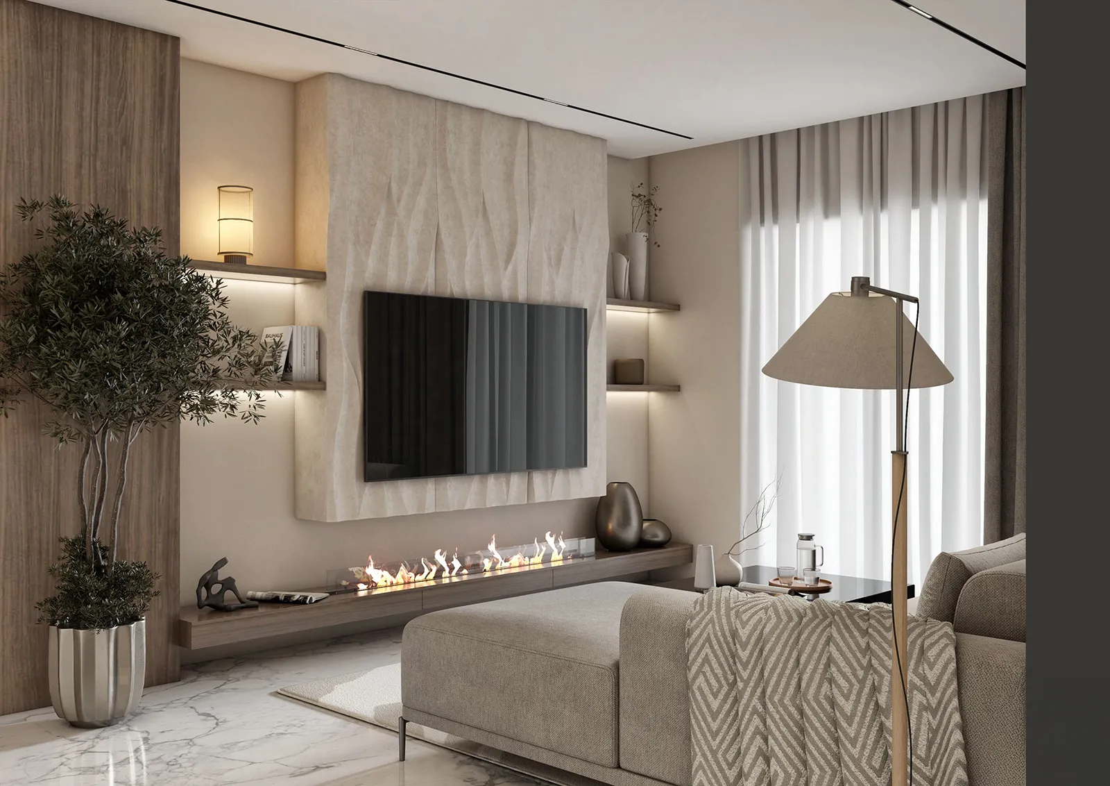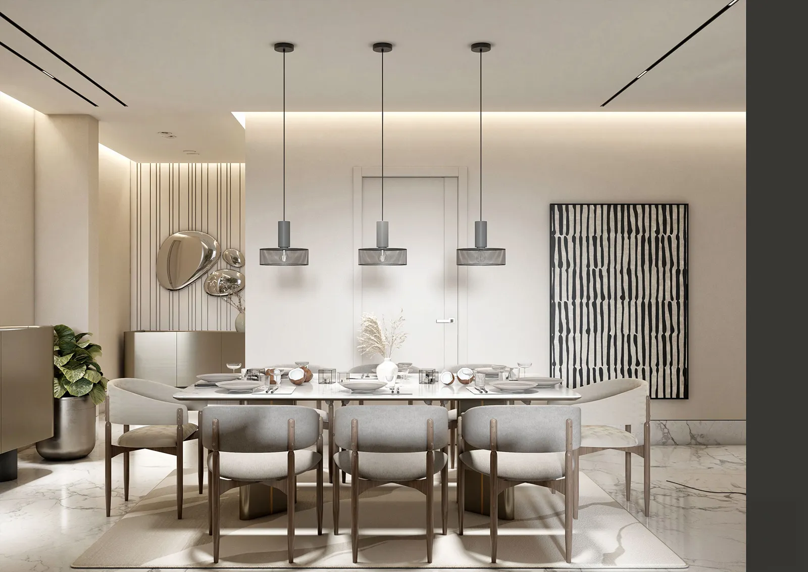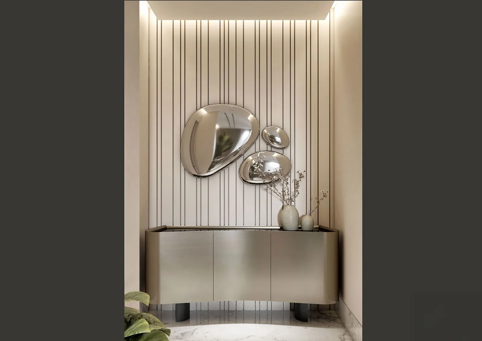 - Primary Surfaces: The walls are a canvas of soft, neutral tones, with a feature wall of textured, vertically-striped wallpaper that adds visual depth and a sense of linear order. The flooring is a polished, light-colored tile that enhances the feeling of spaciousness and serves as a clean base for the design.