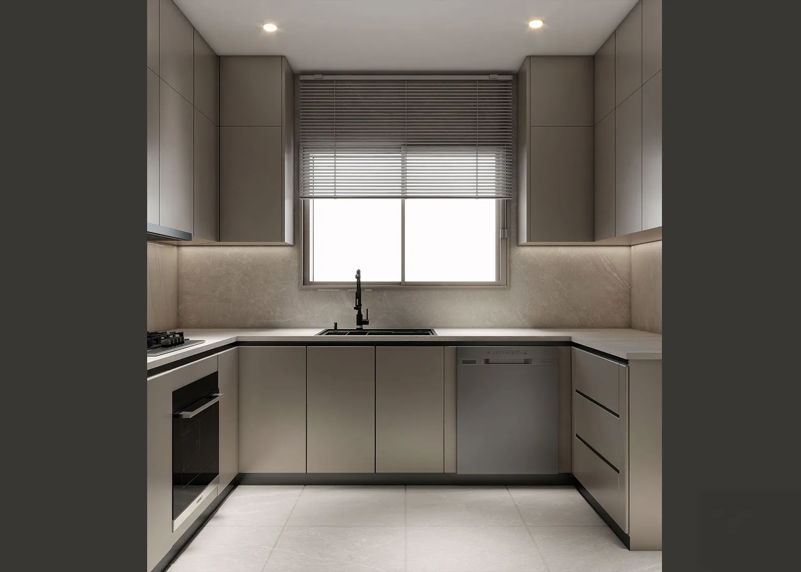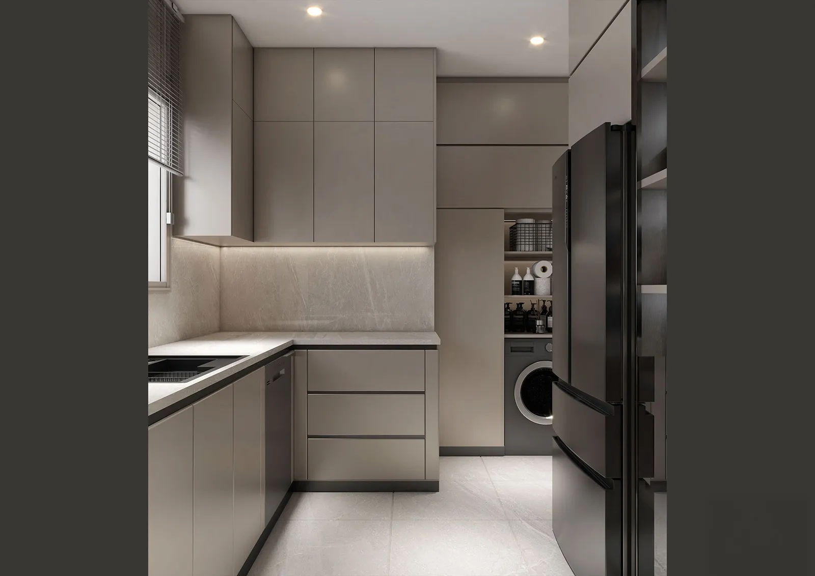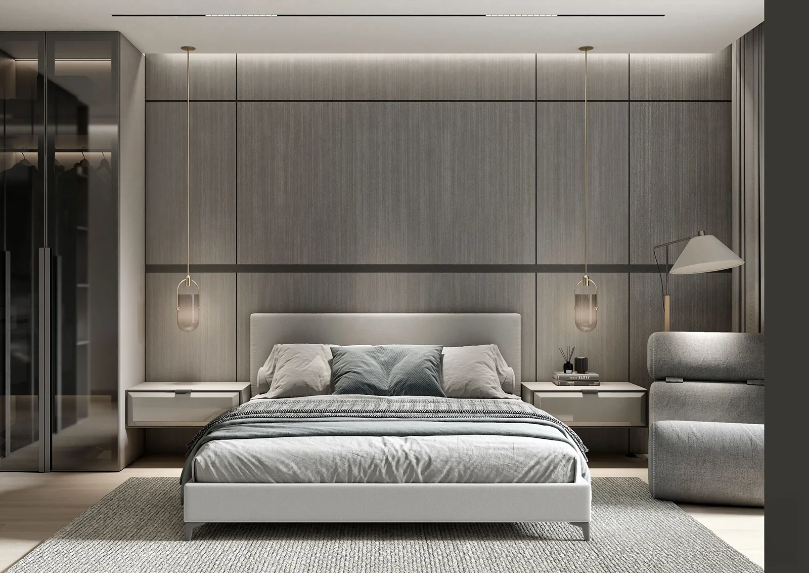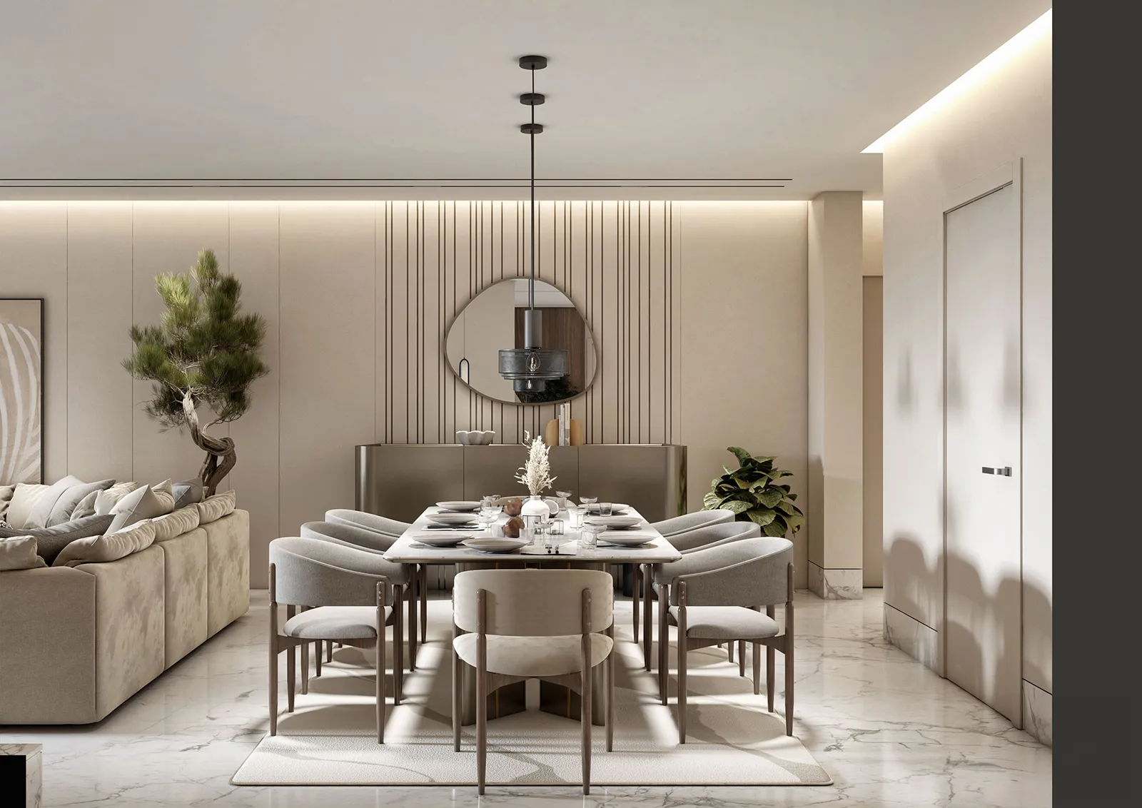 - Primary Surfaces: The walls are a canvas of soft, neutral tones, with a feature wall of textured, vertically-striped wallpaper that adds visual depth and a sense of linear order. The flooring is a polished, light-colored tile that enhances the feeling of spaciousness and serves as a clean base for the design.