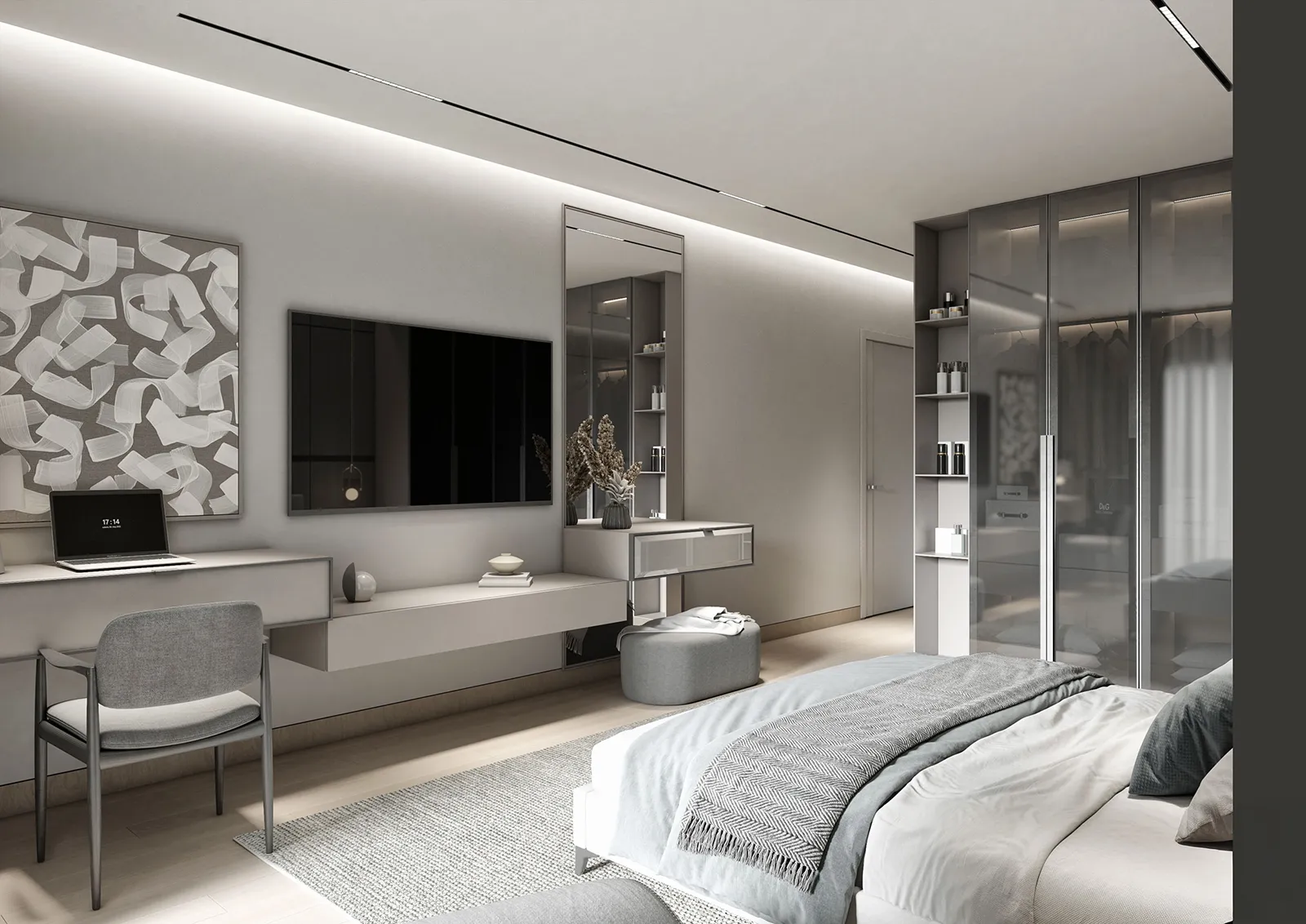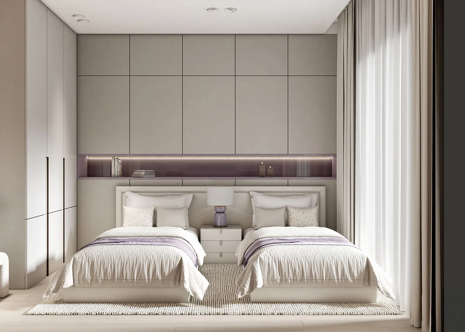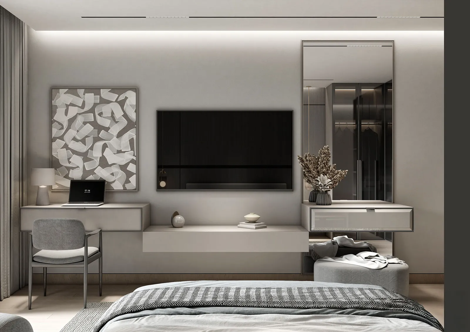 - Custom Solutions: To address the client’s core need for more storage, we designed a discreet and highly functional custom storage unit. This solution was ingeniously integrated above the bed, utilizing vertical space to provide ample room for organization without disrupting the room’s footprint or requiring any Color Palette: A Study in Variations