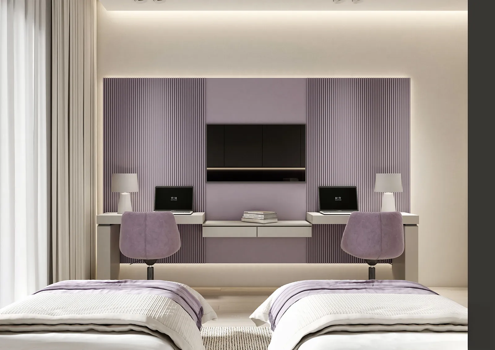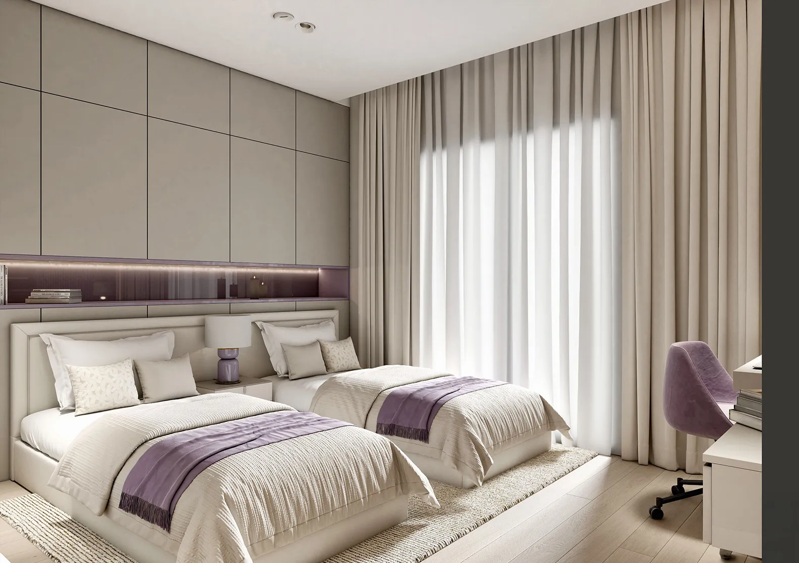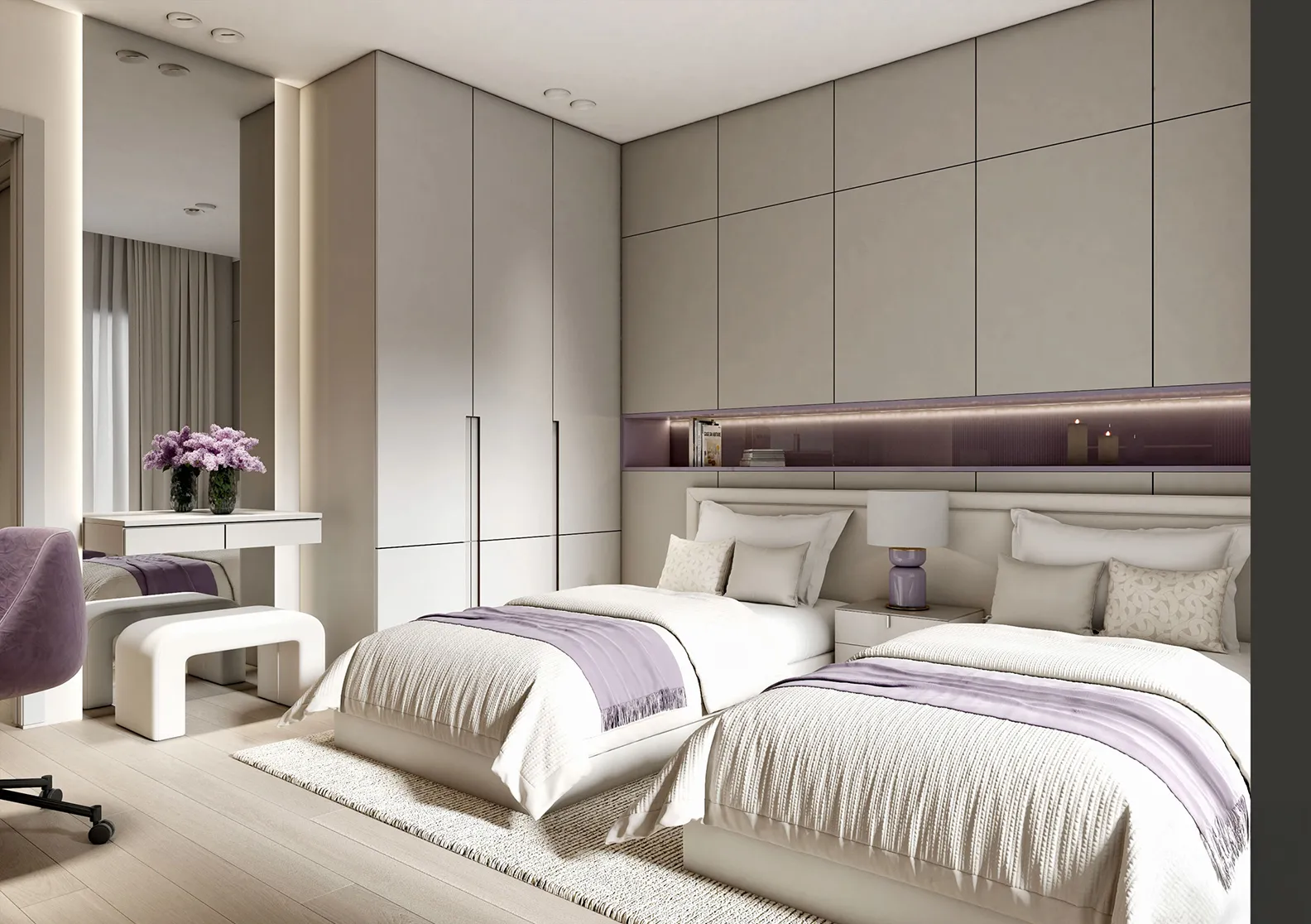 - Custom Solutions: To address the client’s core need for more storage, we designed a discreet and highly functional custom storage unit. This solution was ingeniously integrated above the bed, utilizing vertical space to provide ample room for organization without disrupting the room’s footprint or requiring any Color Palette: A Study in Variations
