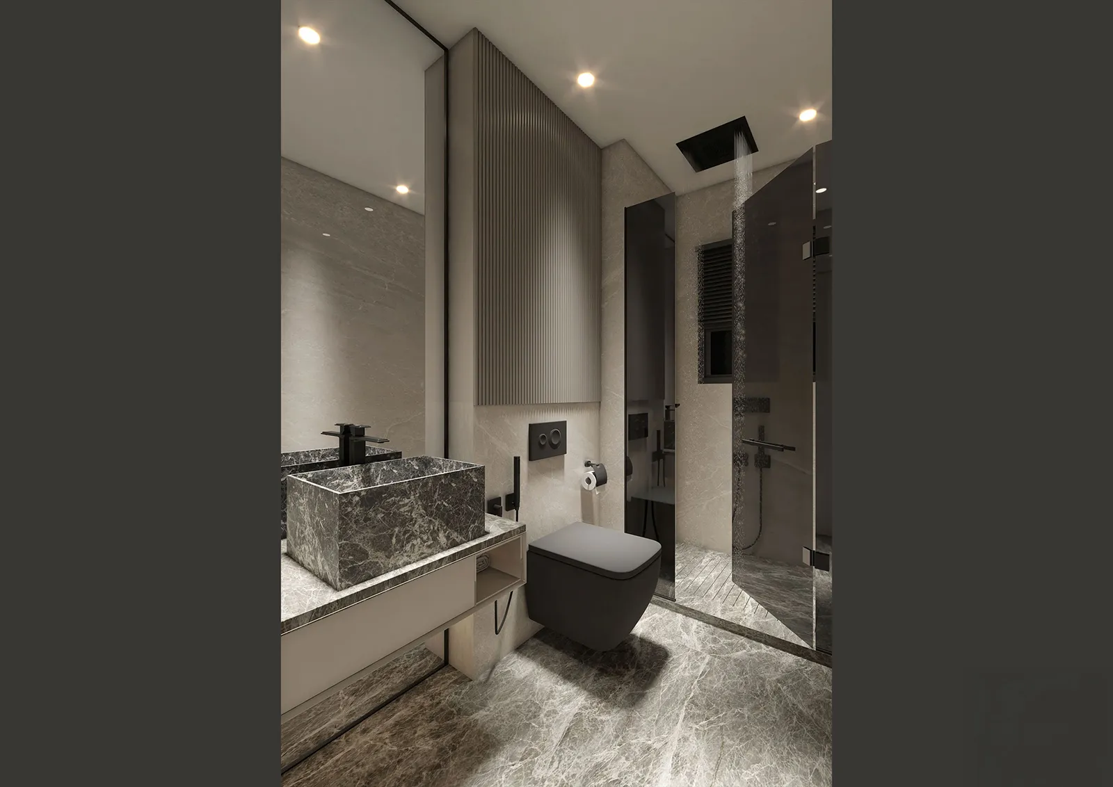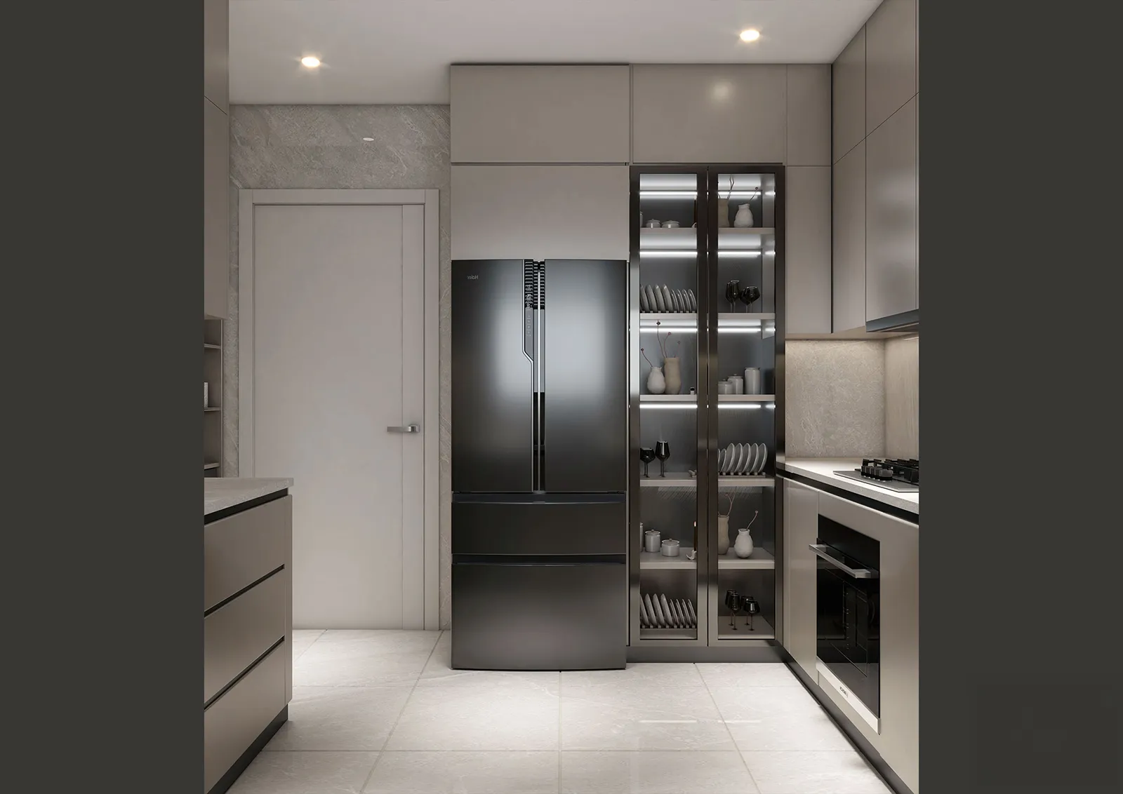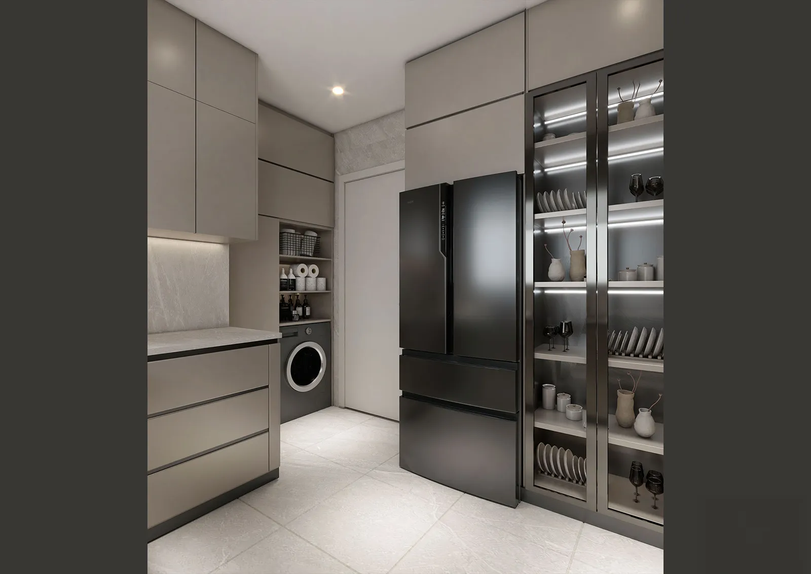 The material language of this apartment is a careful composition of clean and elegant textures, chosen to create a sophisticated yet livable atmosphere.