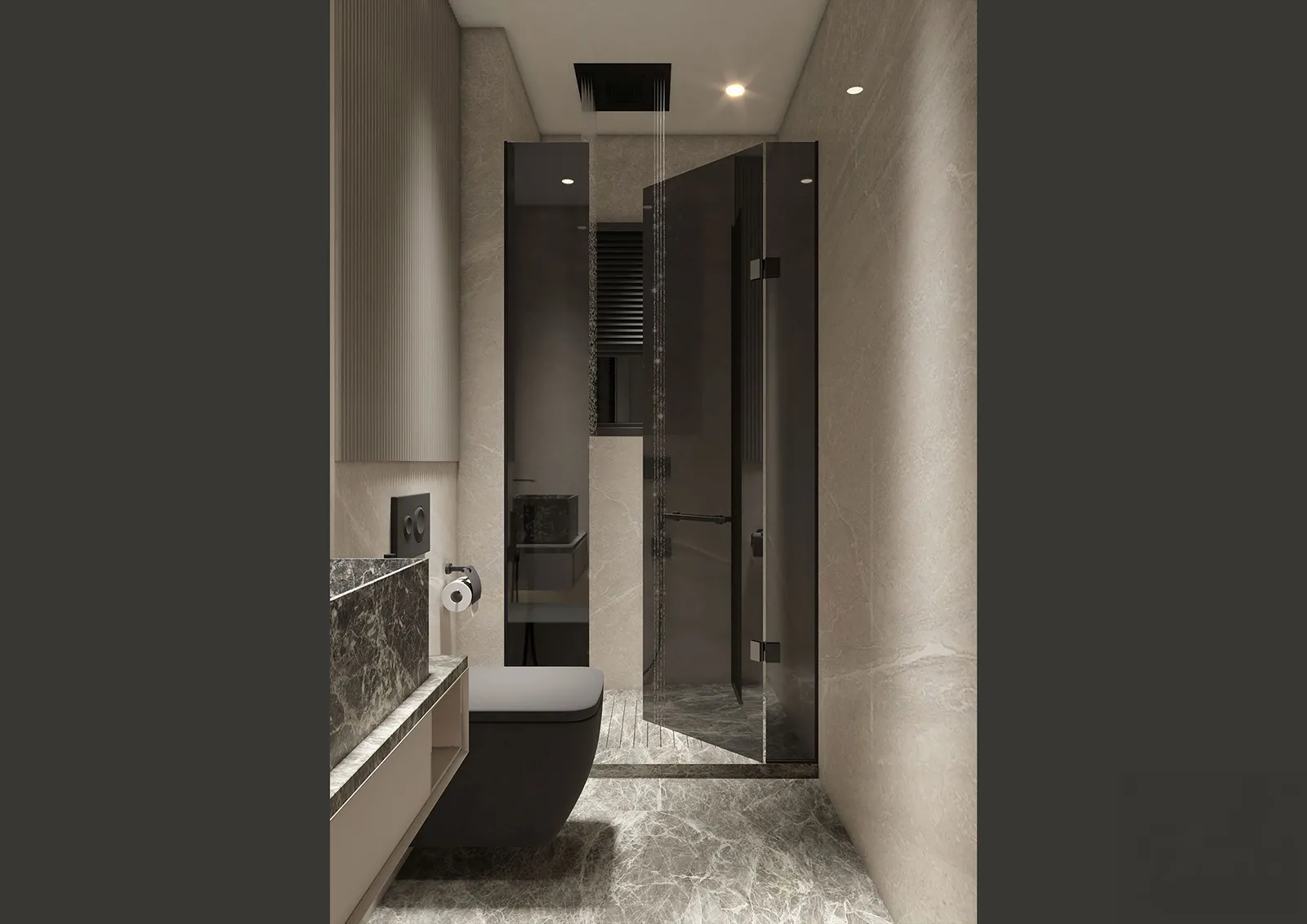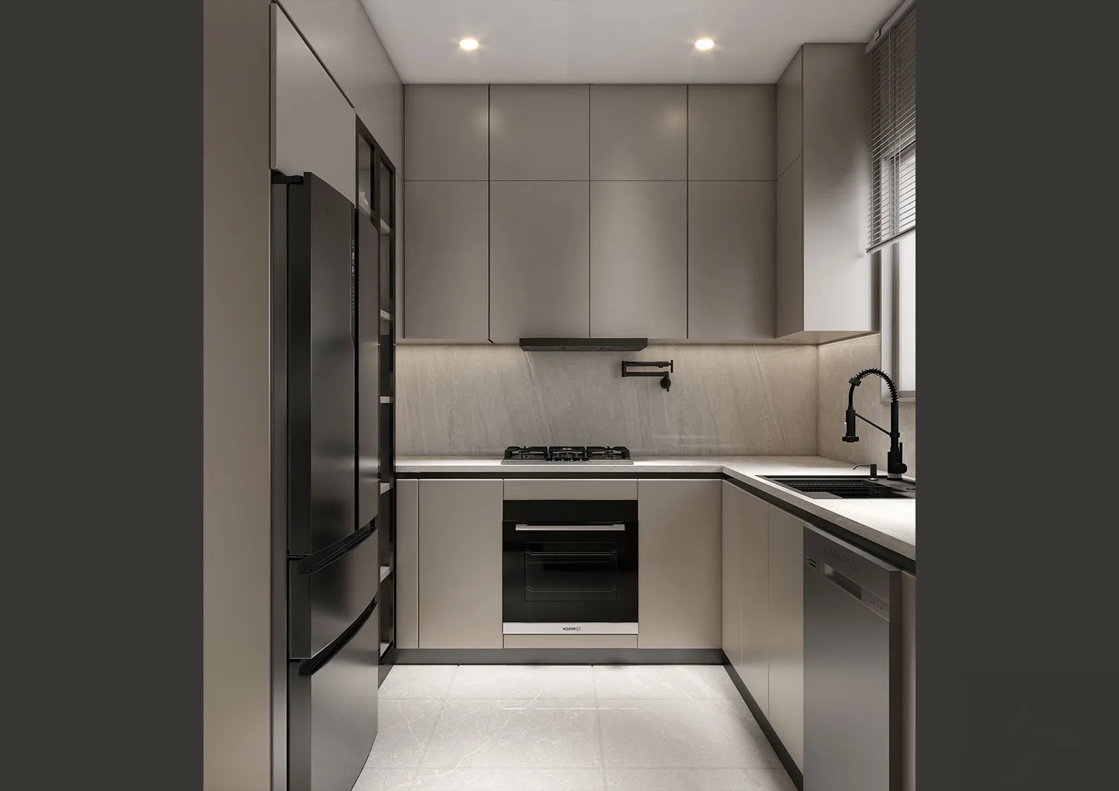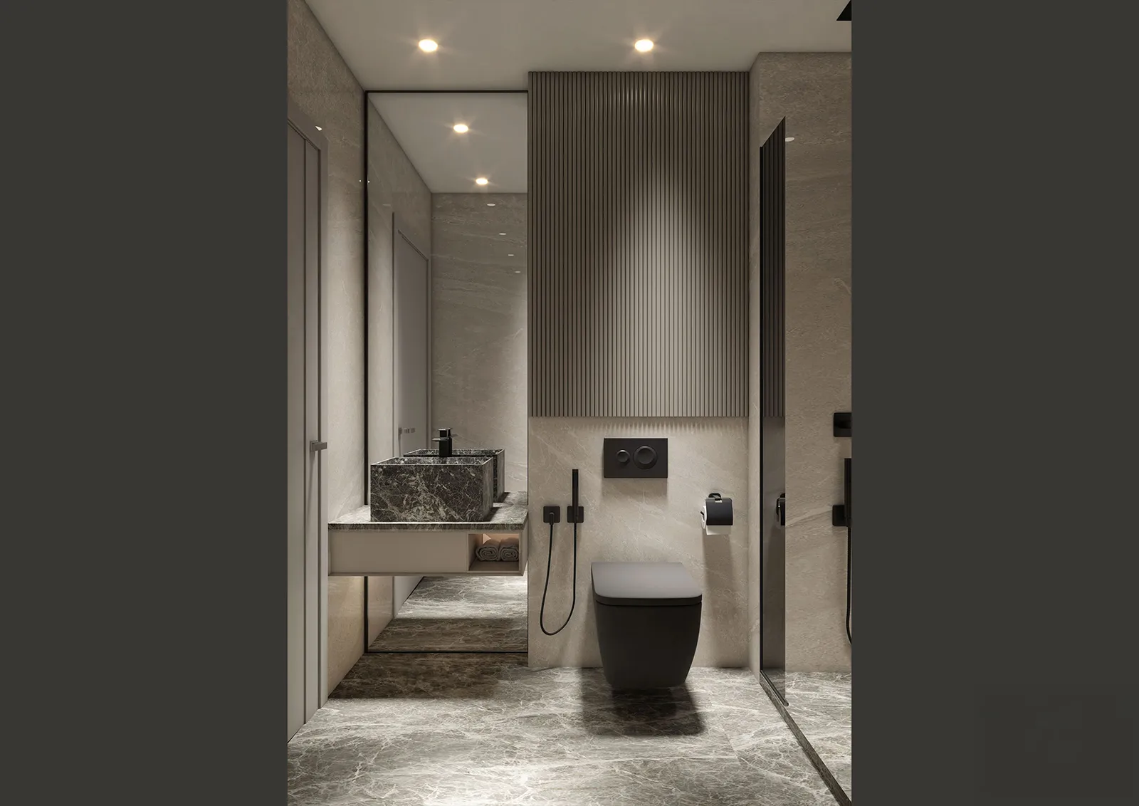 The material language of this apartment is a careful composition of clean and elegant textures, chosen to create a sophisticated yet livable atmosphere.