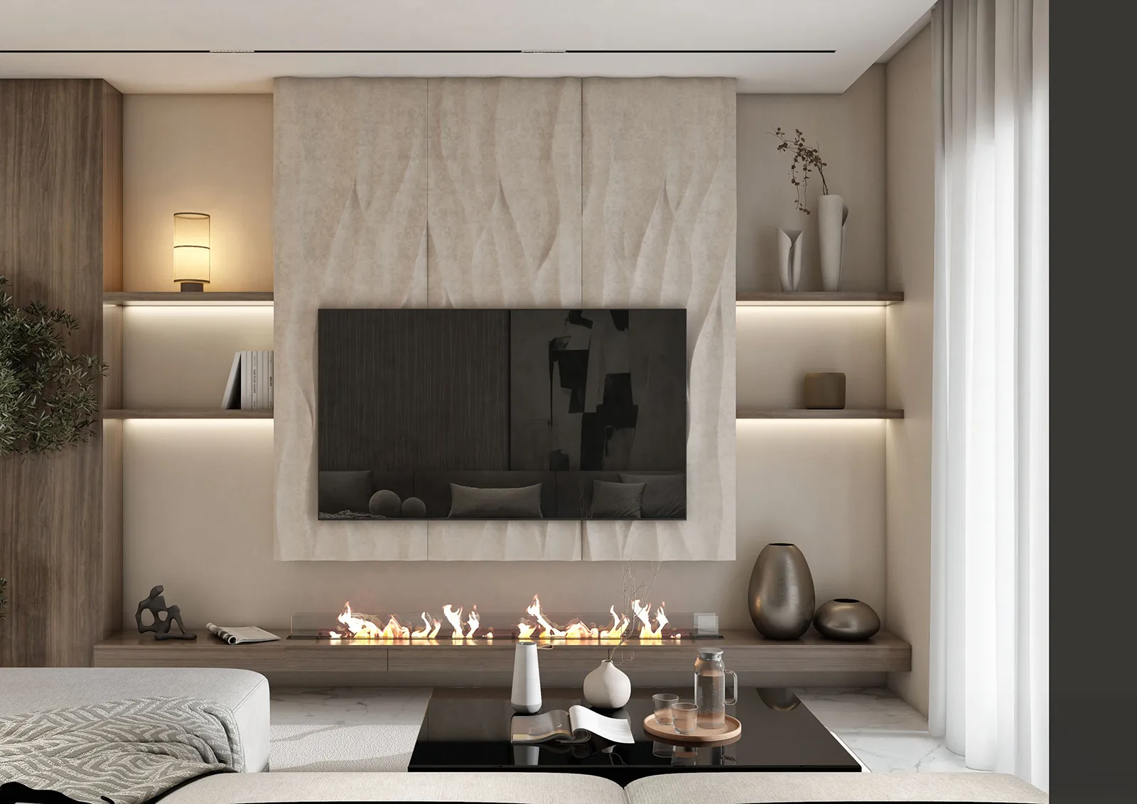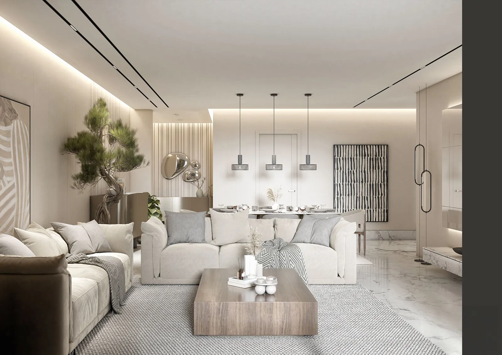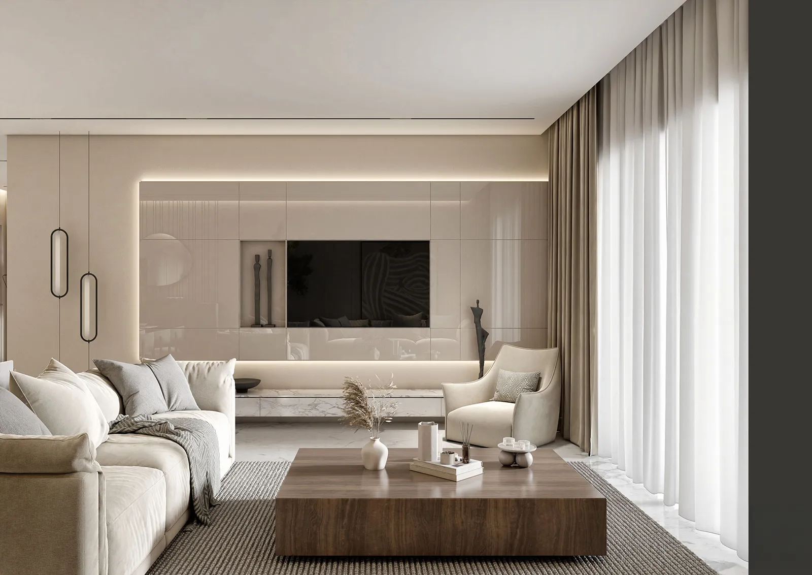 - Accents: A single, sharp contrast is provided by the elegant use of black in key furniture pieces, which adds a powerful, grounded feel to the room’s light palette.