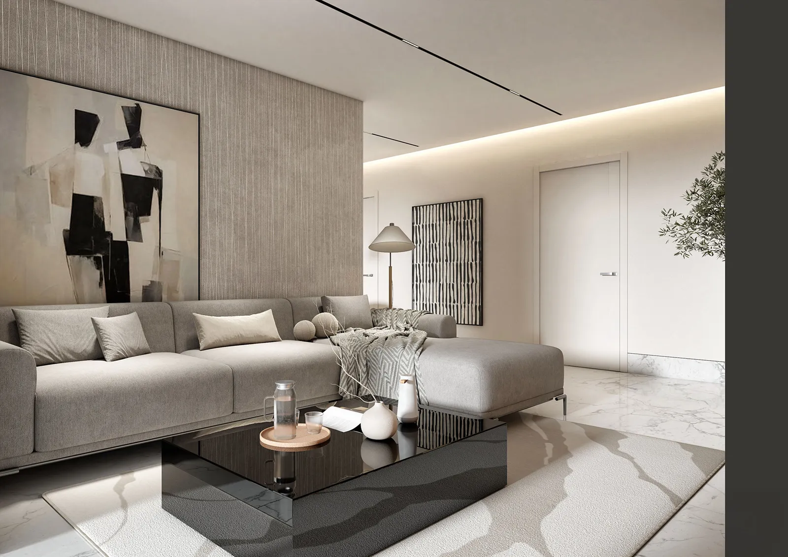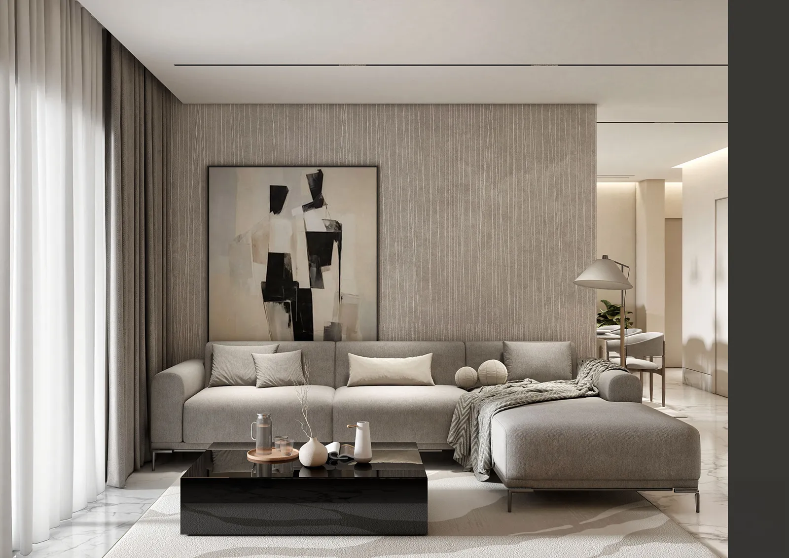 - Furniture & Details: The main seating area is grounded by a large, comfortable gray sectional sofa that balances the room’s clean lines with a sense of welcoming warmth. The central coffee table is a sleek, black polished piece, its reflective surface providing a modern contrast and a touch of high-end finish. The area is softened by a large, plush rug in a light, neutral tone.