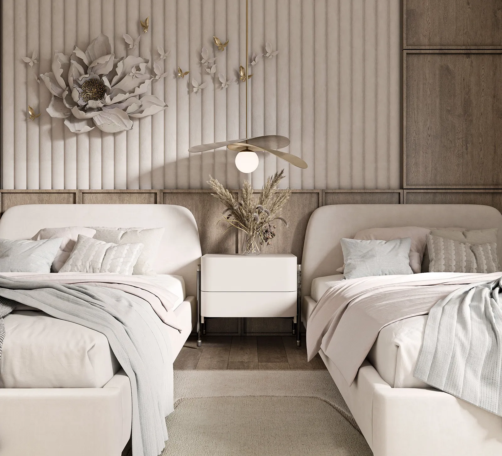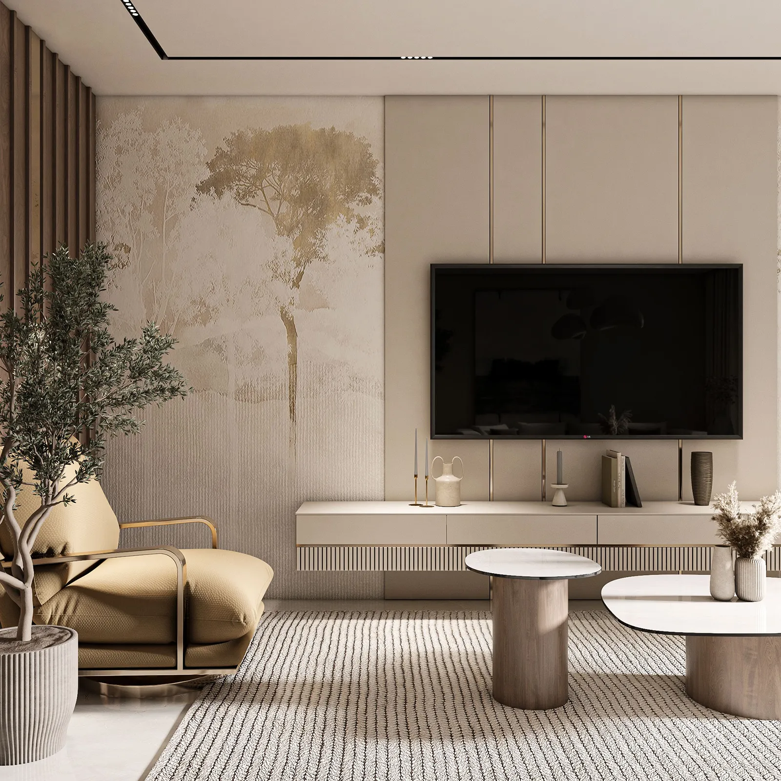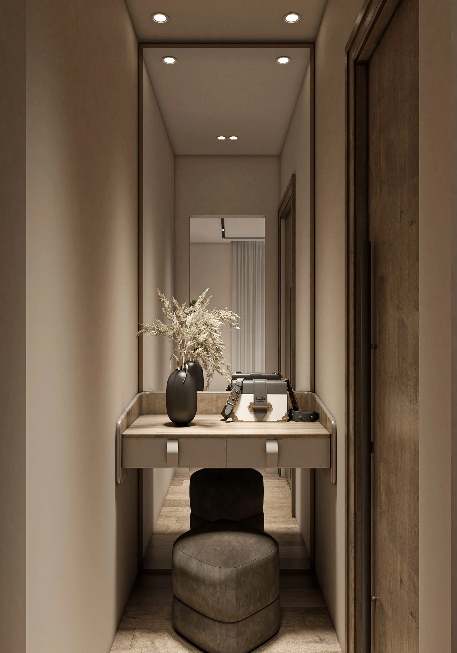 The design brief was clear: a sleek, modern, and elegant apartment. The client had a very precise vision, detailing everything from the exact shades of beige and wood to the specific placement of gold elements in the wallpaper and accent furniture. The extensive use of wooden cladding and carefully selected tinted mirrors contributed to the apartment’s sophisticated and warm ambiance. This level of detailed input from the client presented our greatest challenge: translating his exact desires into a cohesive and functional design while maintaining the highest standards of elegance and modern aesthetics. Every color choice, every piece of art, and every functional element was a direct reflection of his personal taste and requirements.