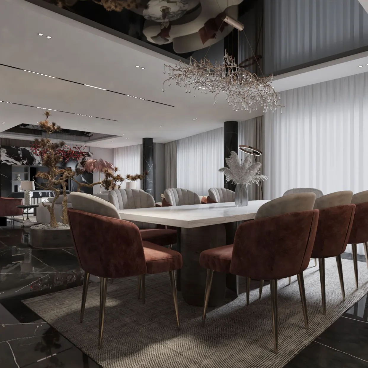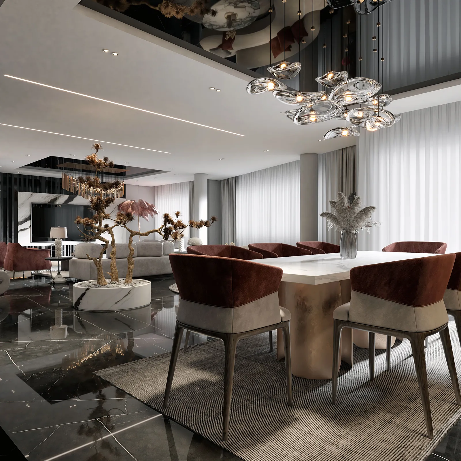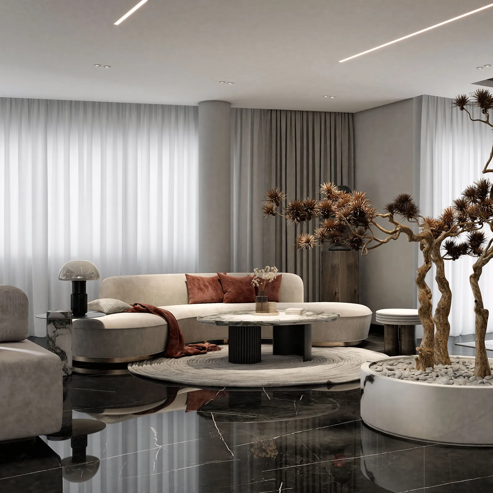Refined Luxury with Modern Touches — a sophisticated and serene aesthetic that balances bold contrasts with warm, inviting elements, designed for comfort and smart living.