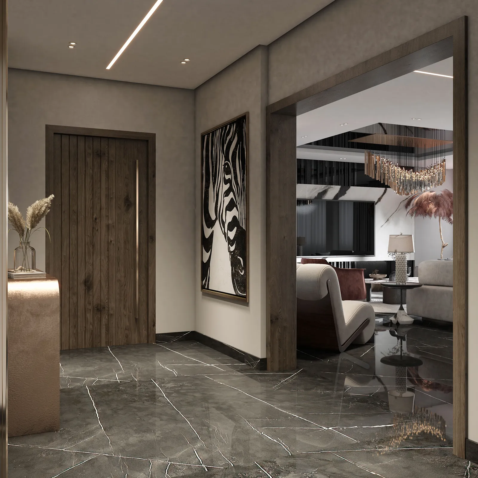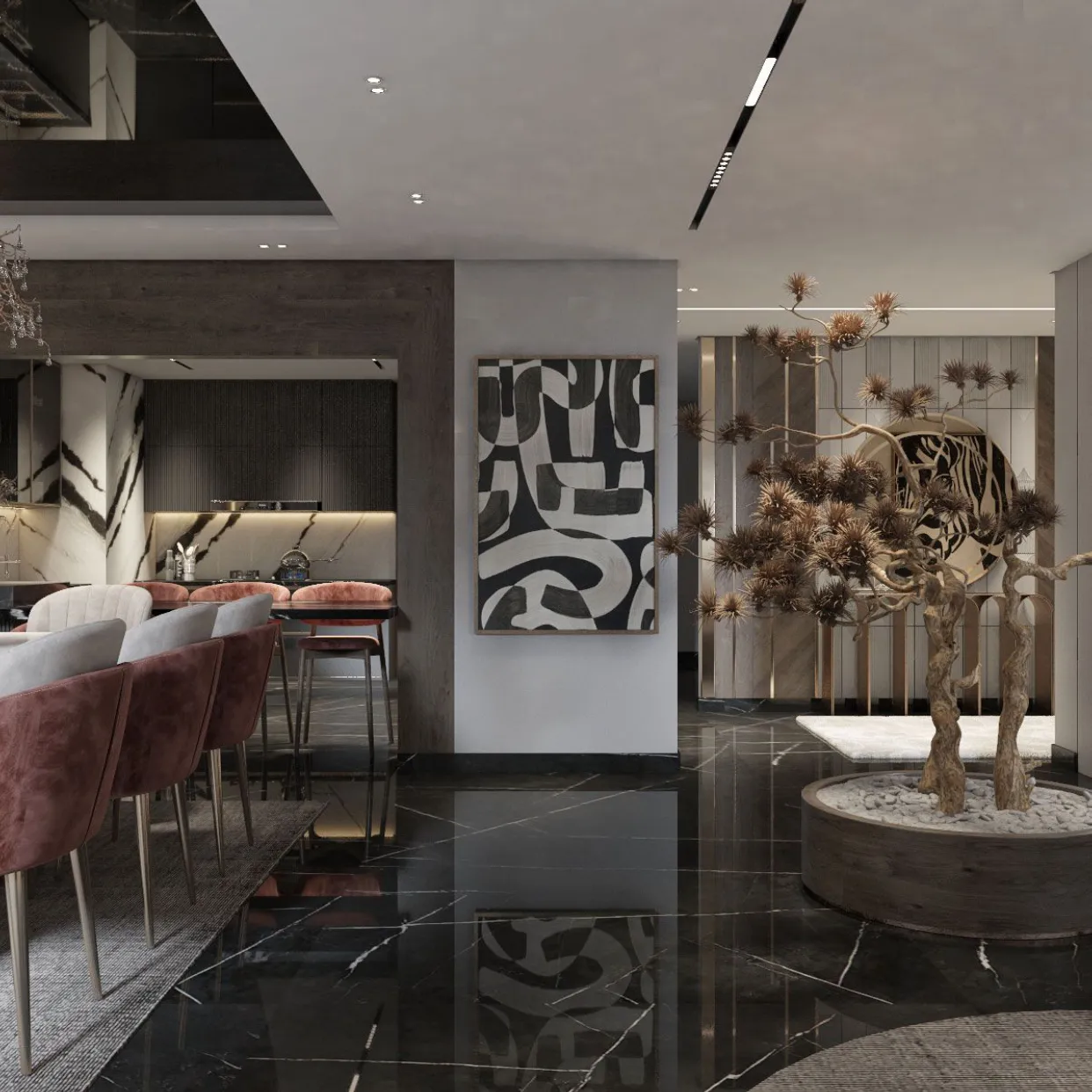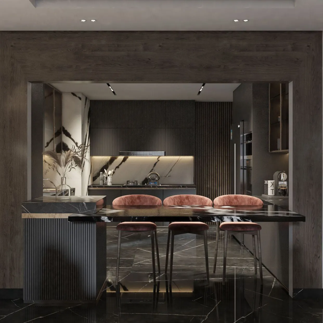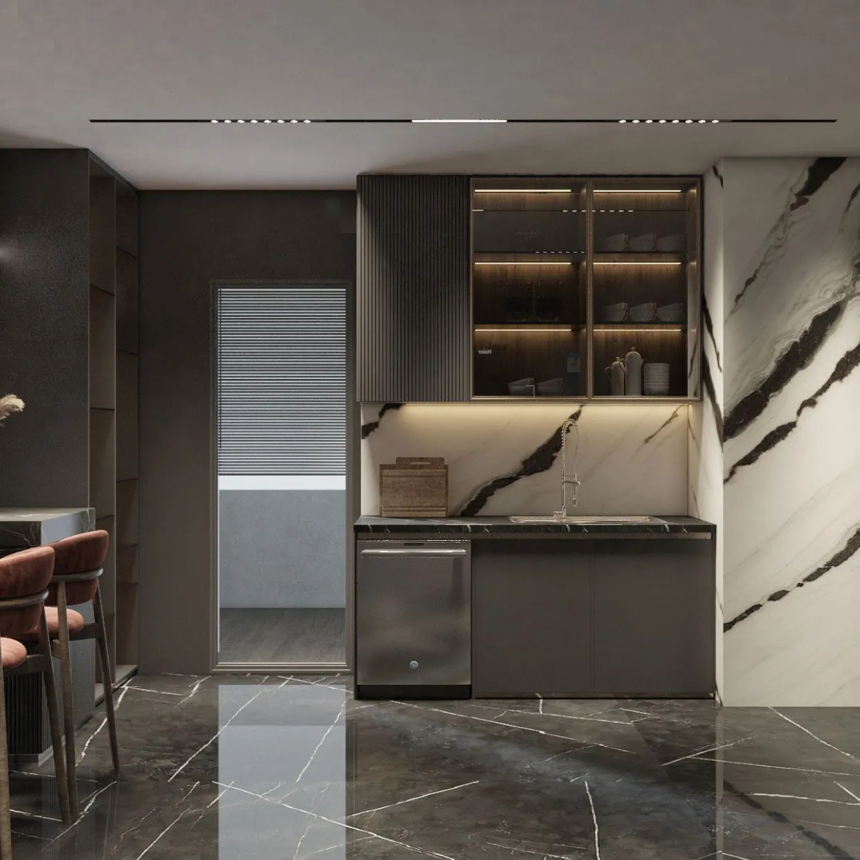 Rooted in quiet luxury and comfort, the Rehab apartment exudes a serene, collected spirit. Shadows dance gently across Nero Marquina floors, while soft lighting and warm oak tones invite stillness. The stretch ceiling subtly mirrors the room, expanding its calm. It’s a space that doesn’t speak loudly—yet says everything with intention. A refined retreat for modern living.