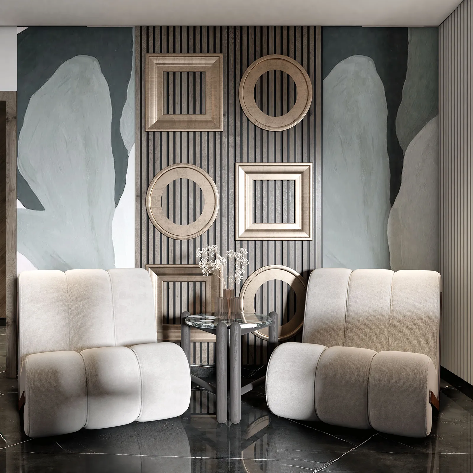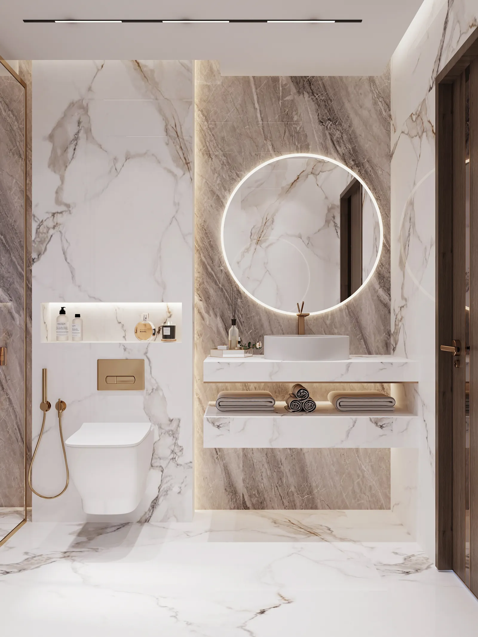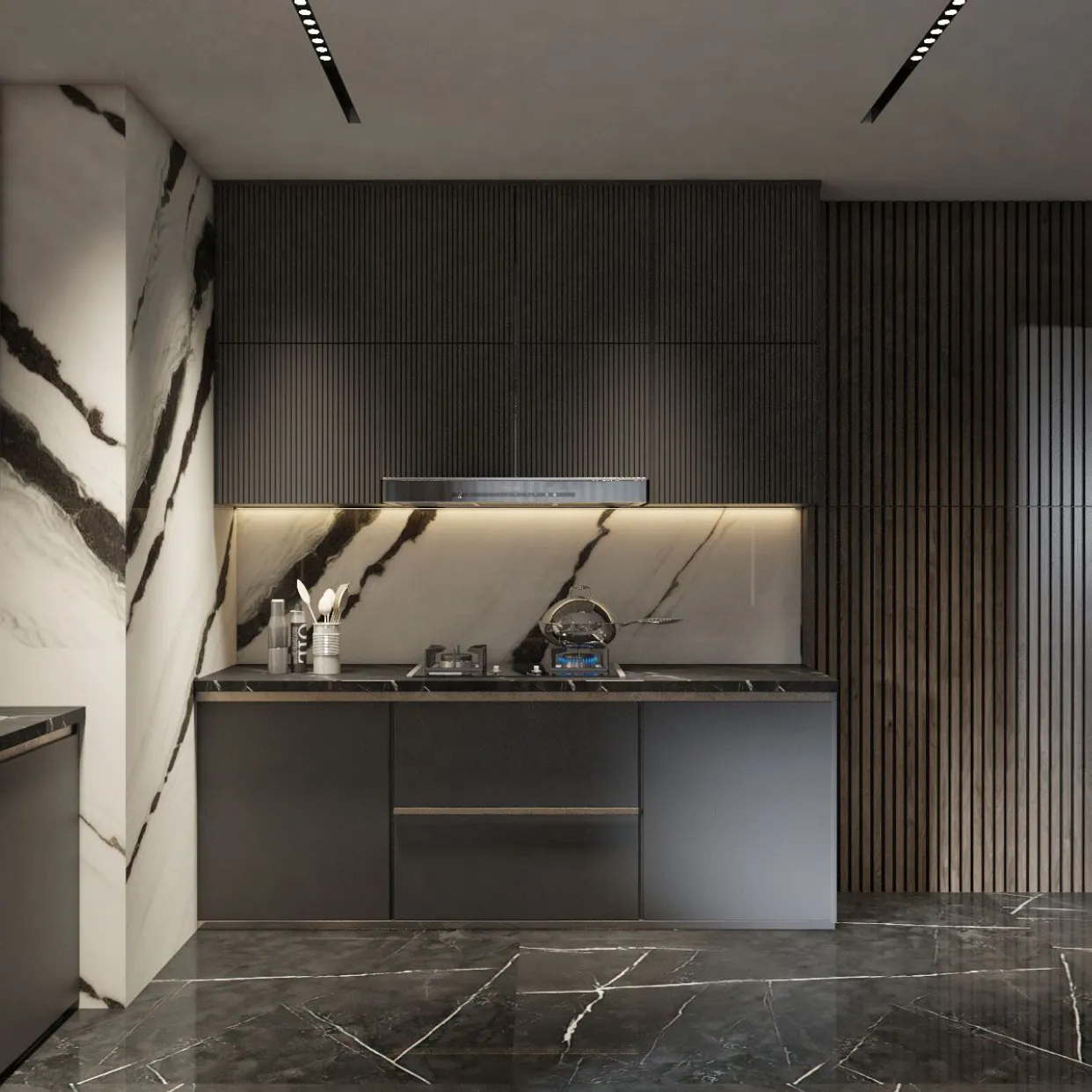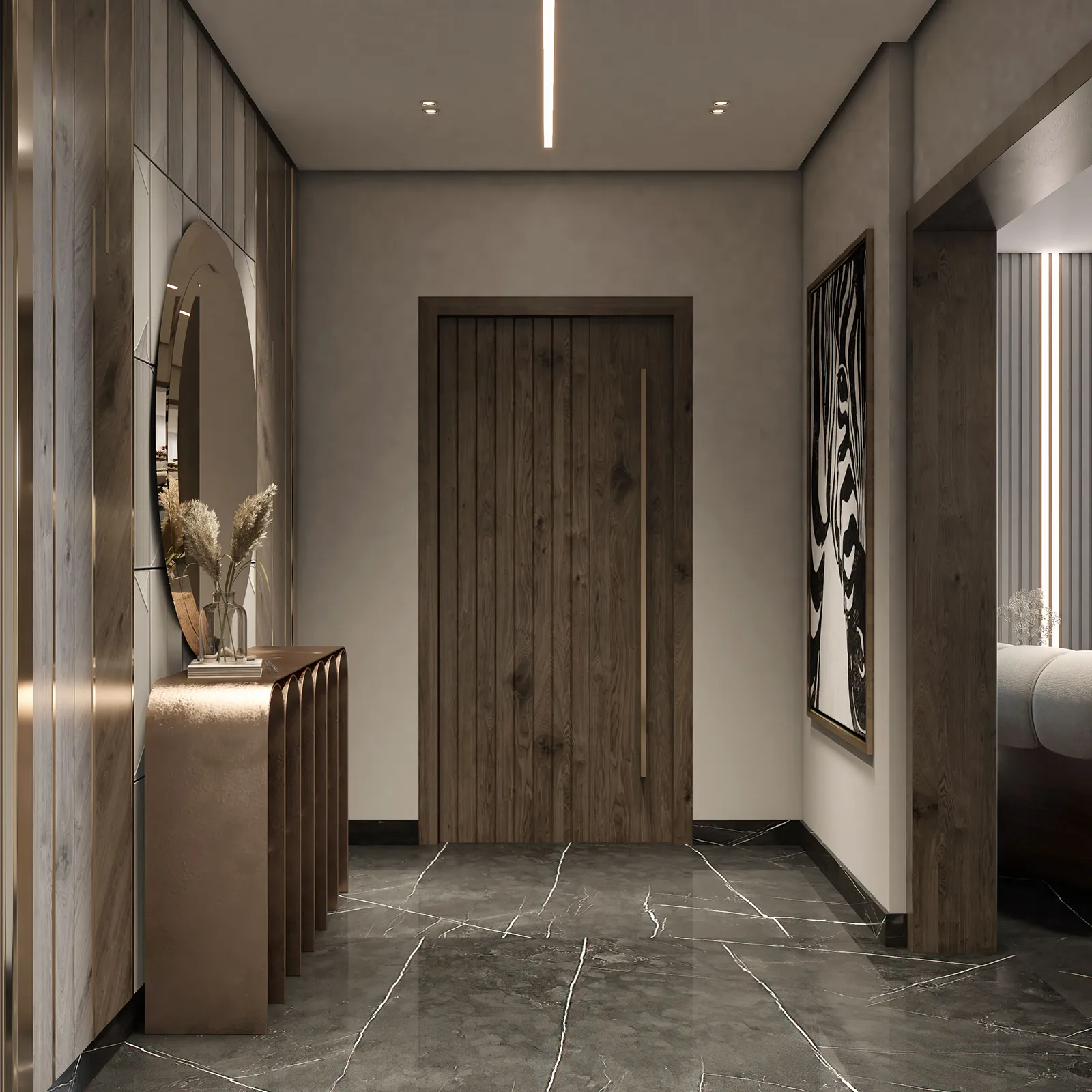 Rooted in quiet luxury and comfort, the Rehab apartment exudes a serene, collected spirit. Shadows dance gently across Nero Marquina floors, while soft lighting and warm oak tones invite stillness. The stretch ceiling subtly mirrors the room, expanding its calm. It’s a space that doesn’t speak loudly—yet says everything with intention. A refined retreat for modern living.