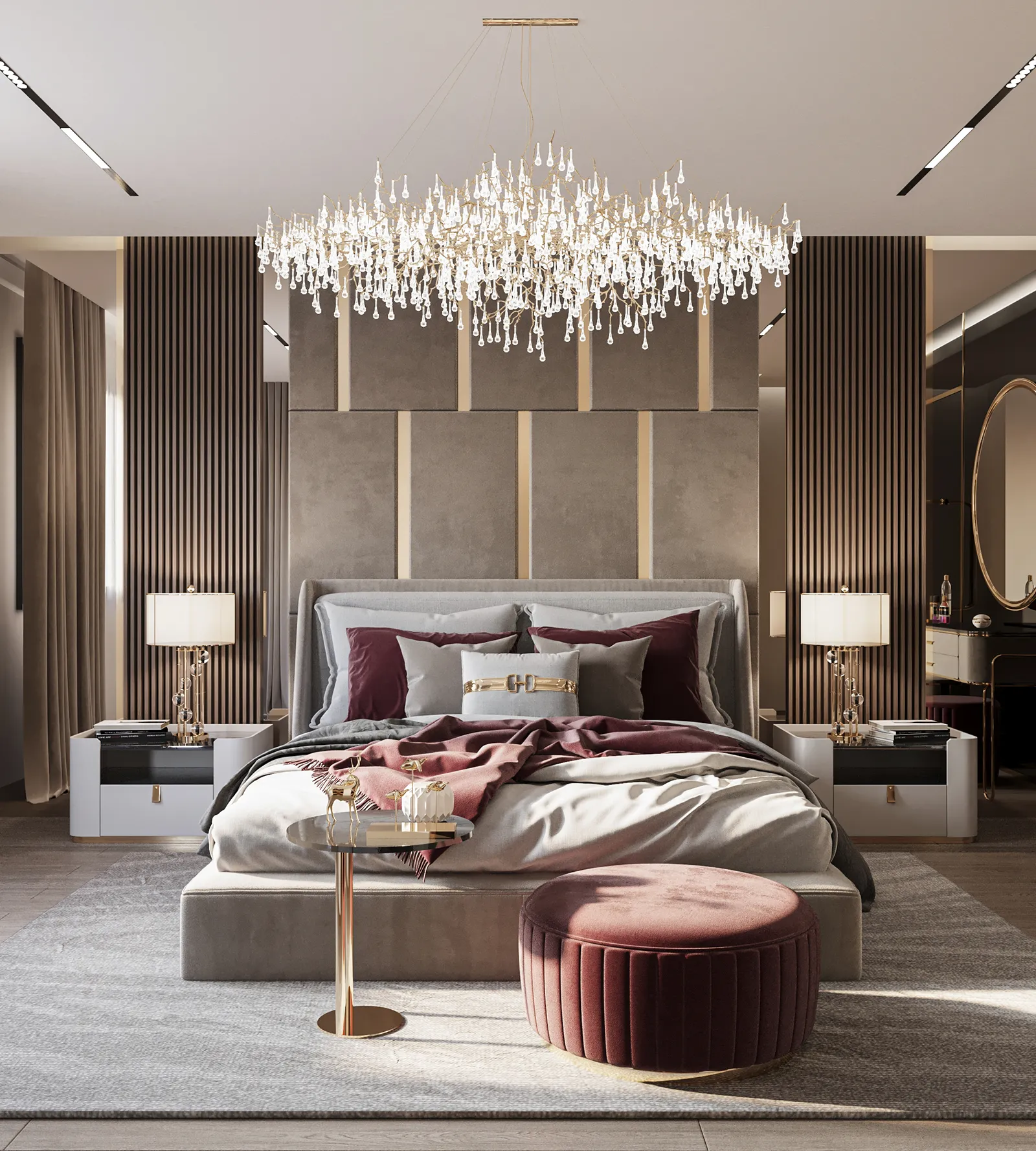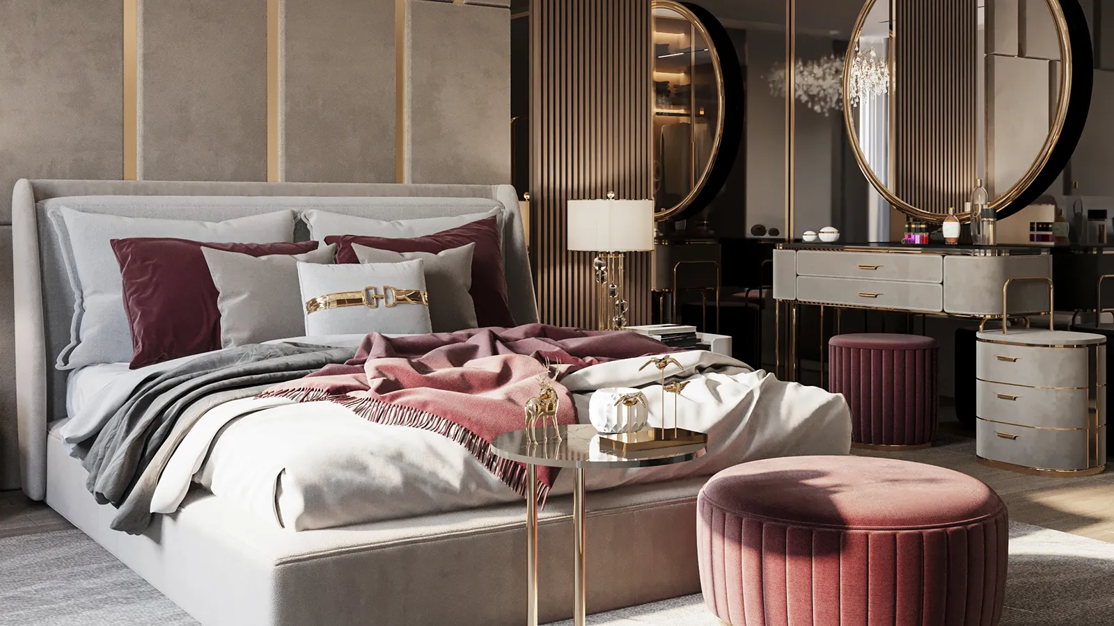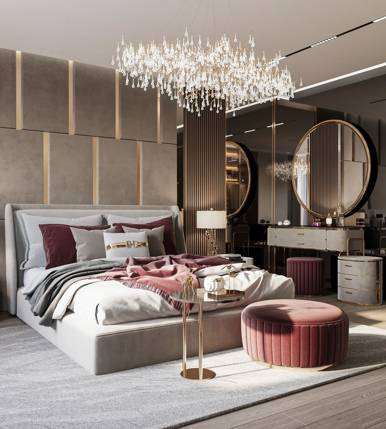 Accents : Burgundy, charcoal, and subtle gold add richness and warmth, creating a grounded yet refined atmosphere.