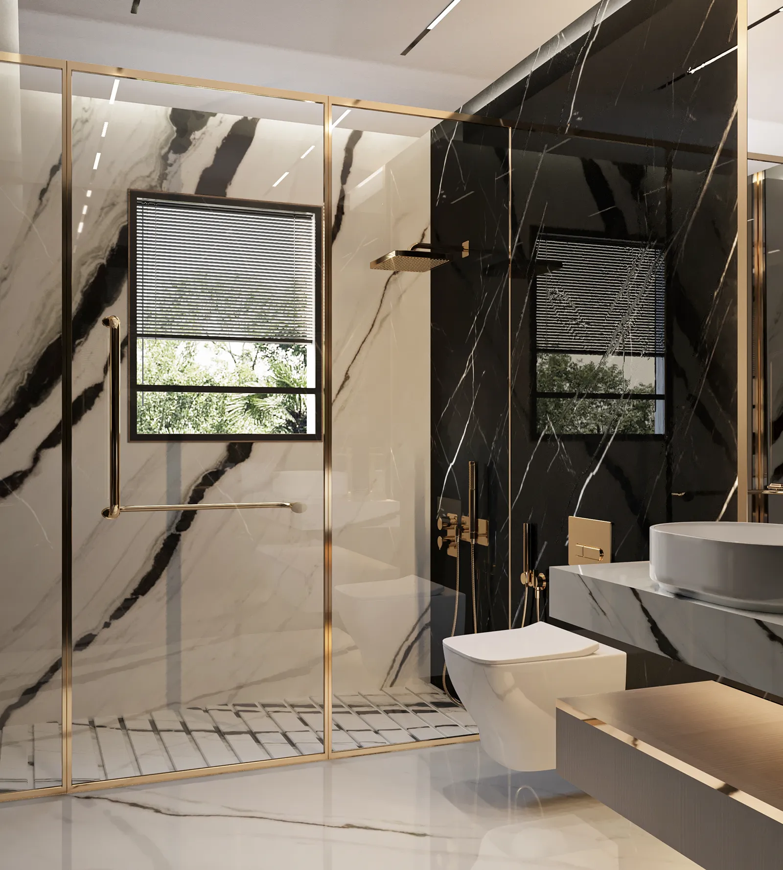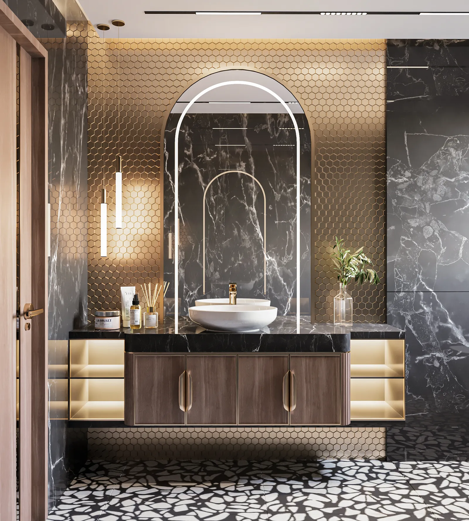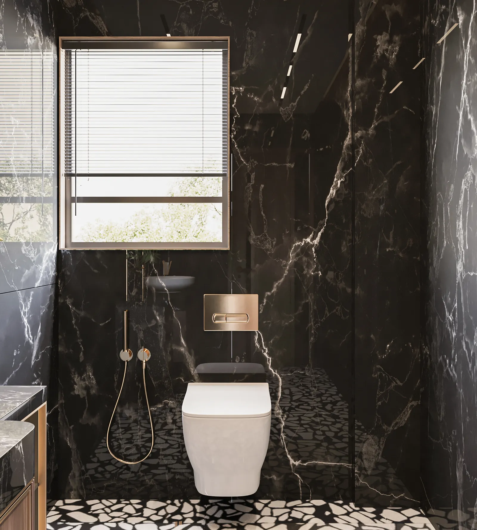 - Nero Marquina Flooring –Rich black marble with bold white veining adds depth and grounding to the space, creating a dramatic foundation that anchors the entire design.