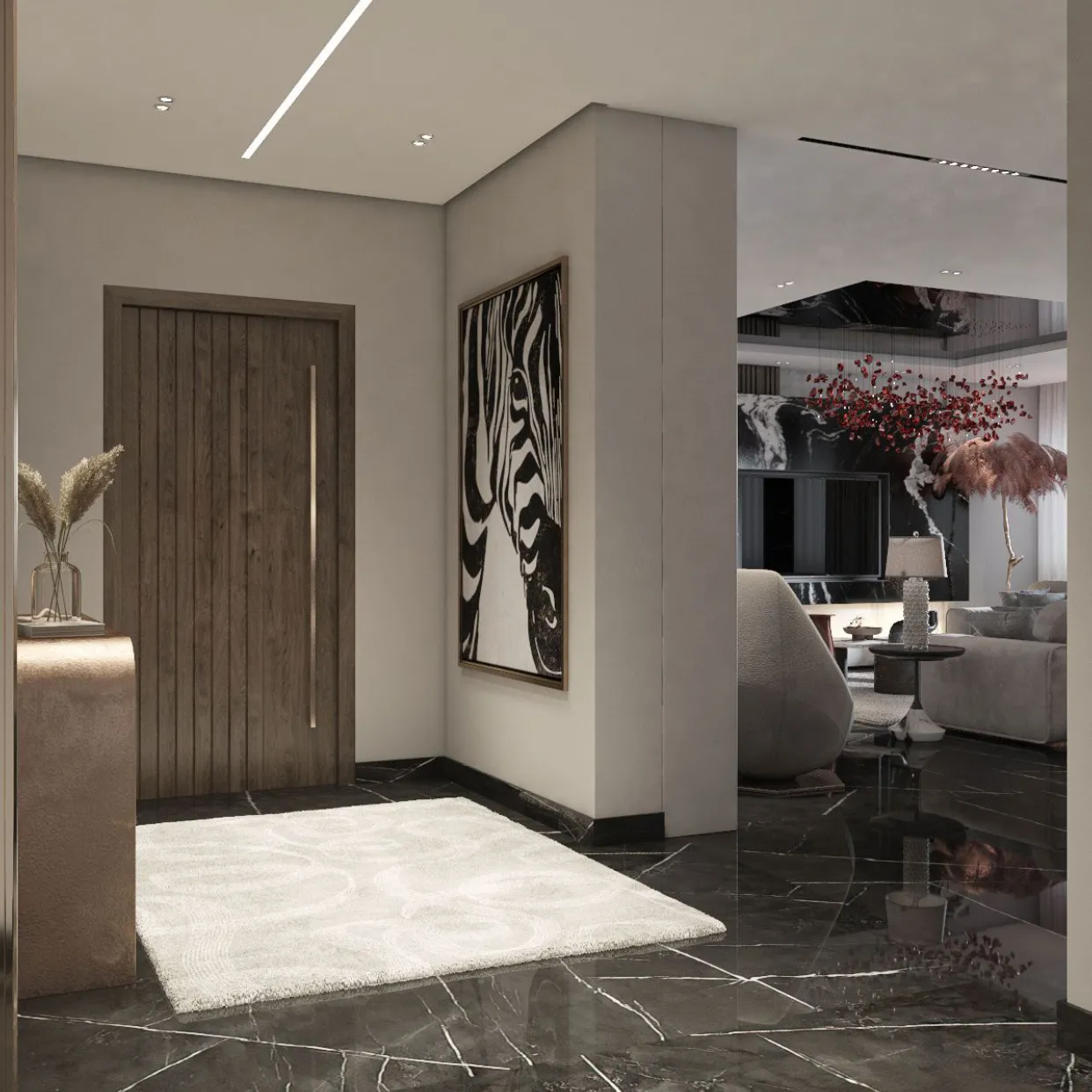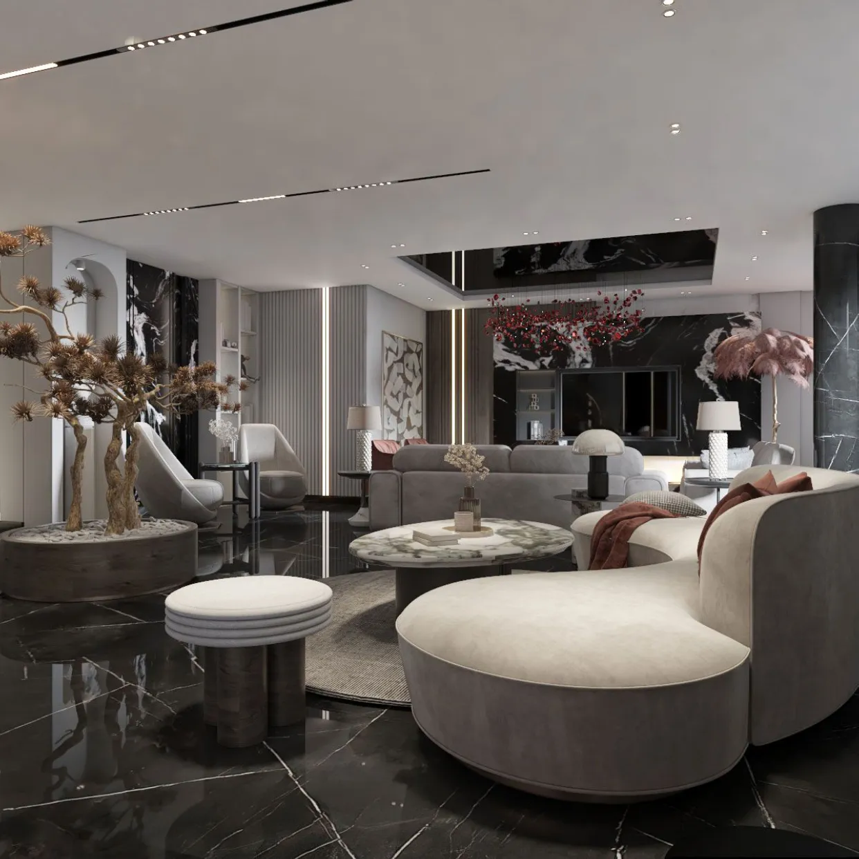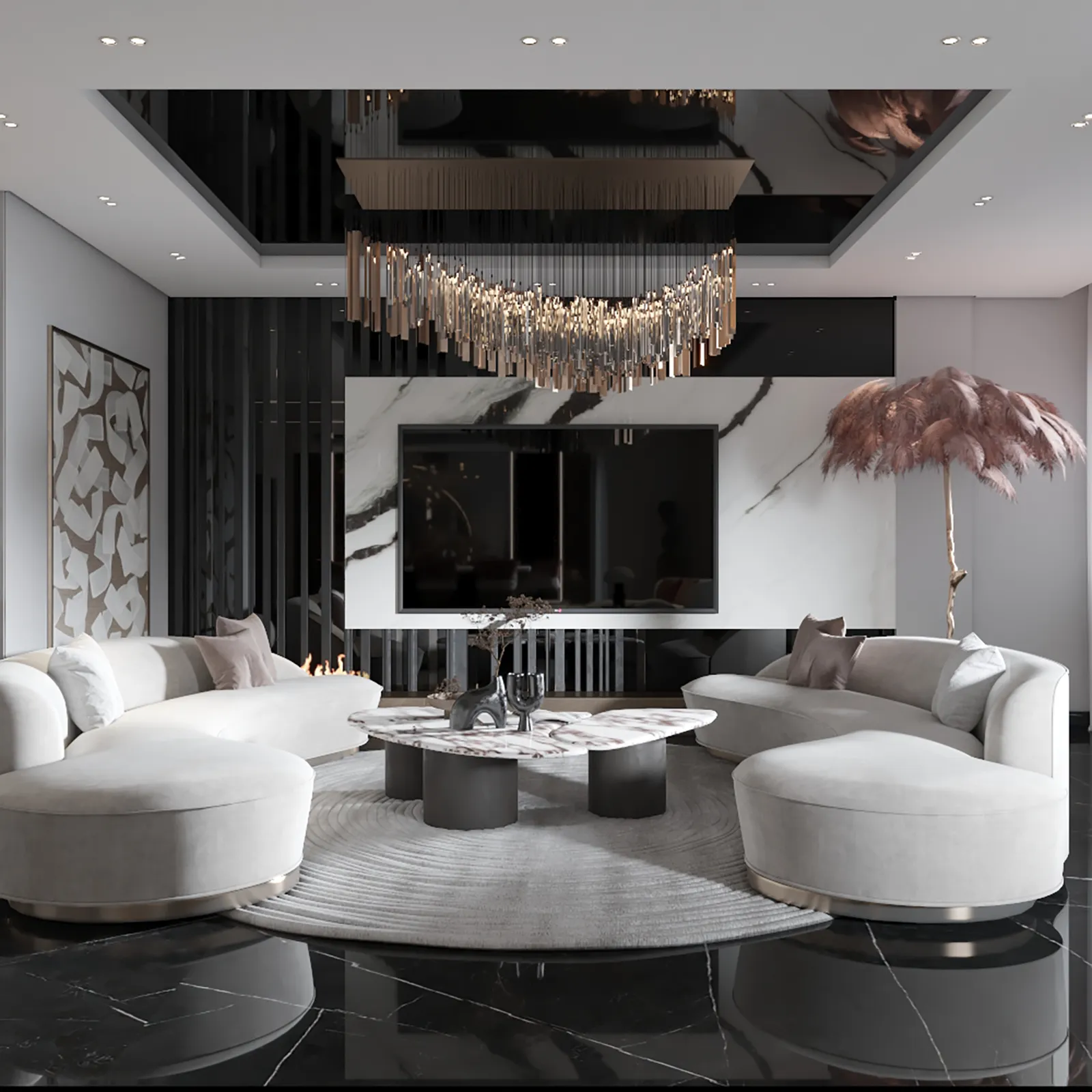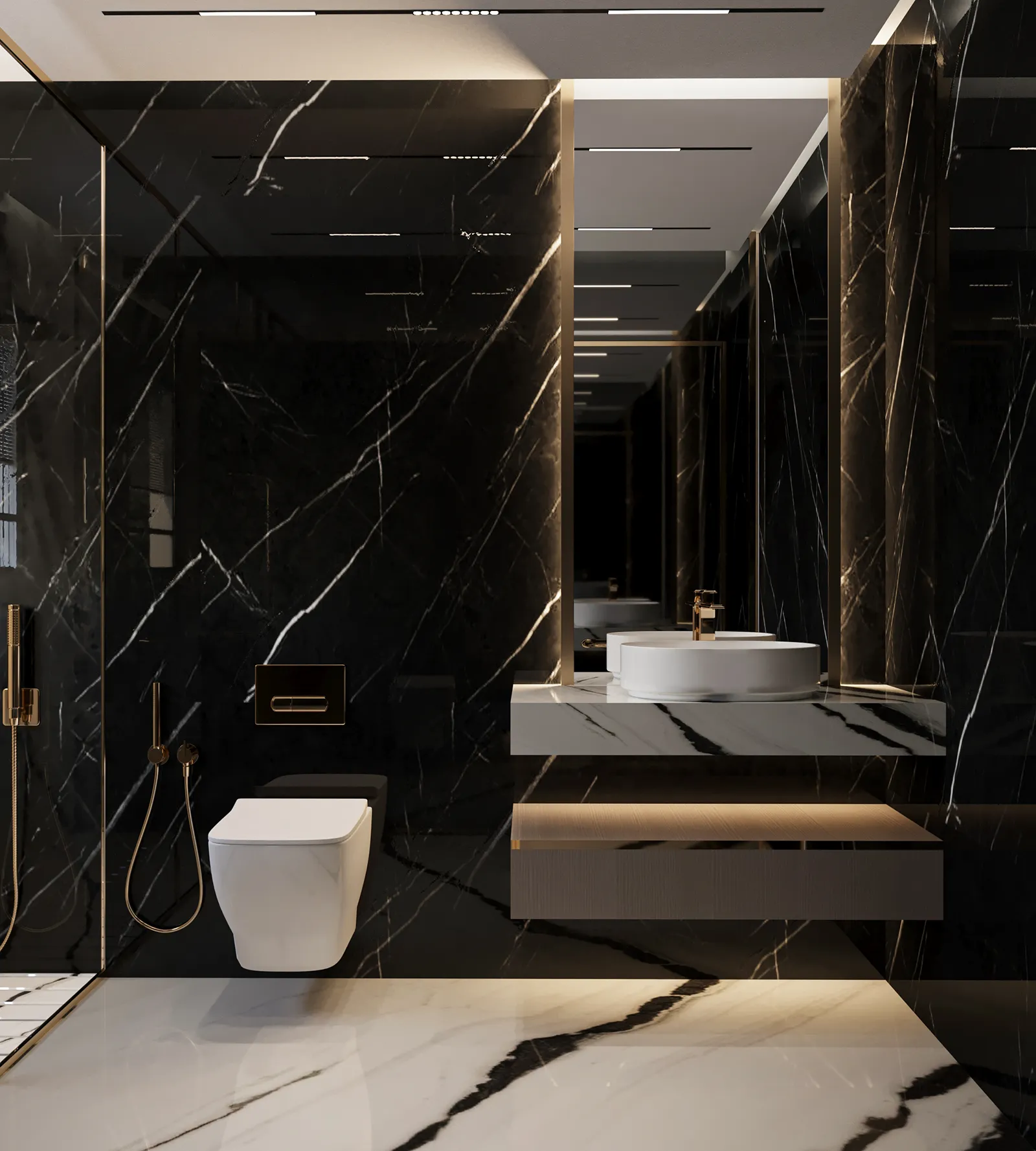 - Sleek Nero Marquina marble flooring anchors the space with depth and sophistication.