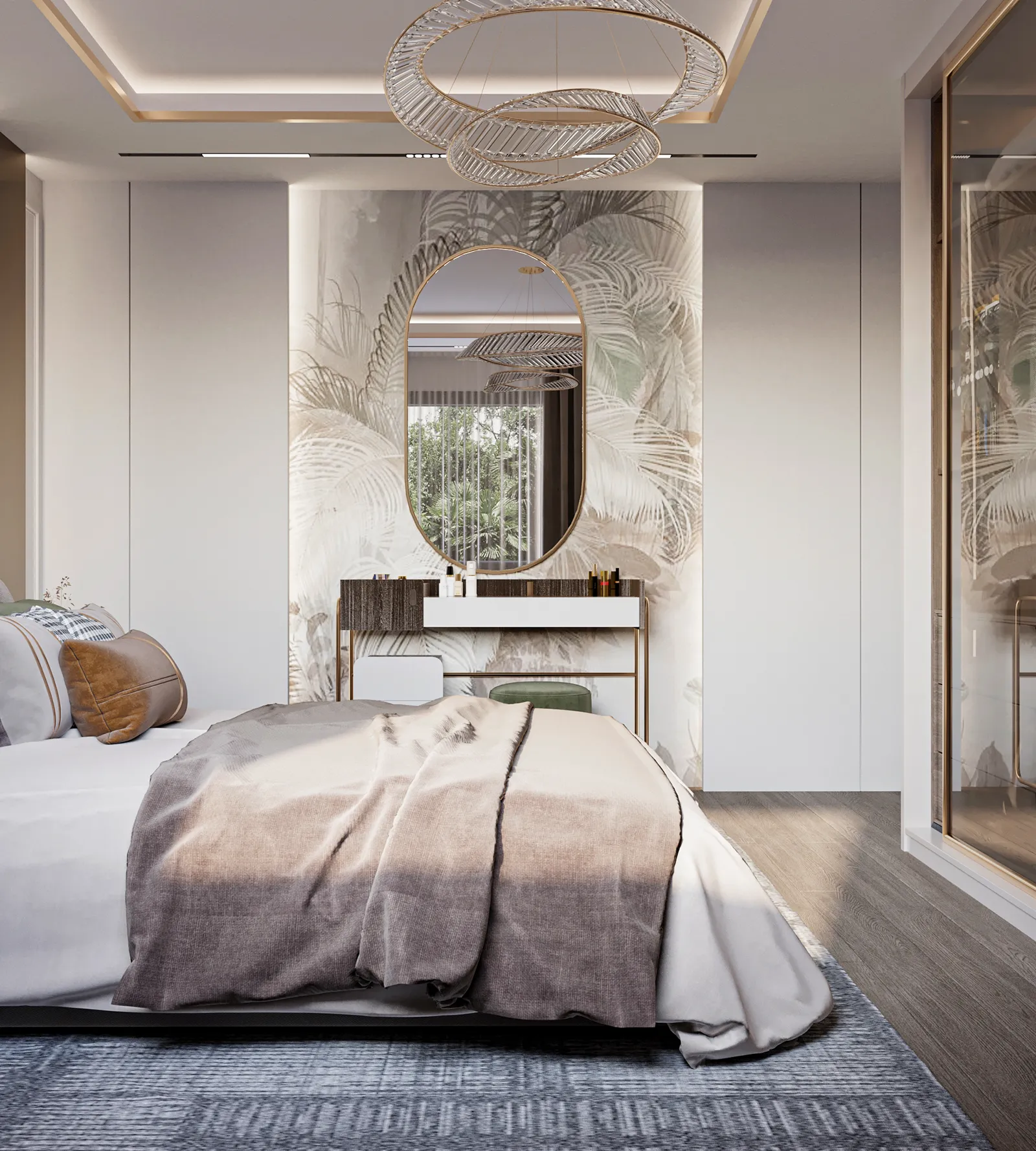 - Natural oak textures bring warmth and softness to the main suite, creating a calming retreat layered with soft textiles and gentle lighting..