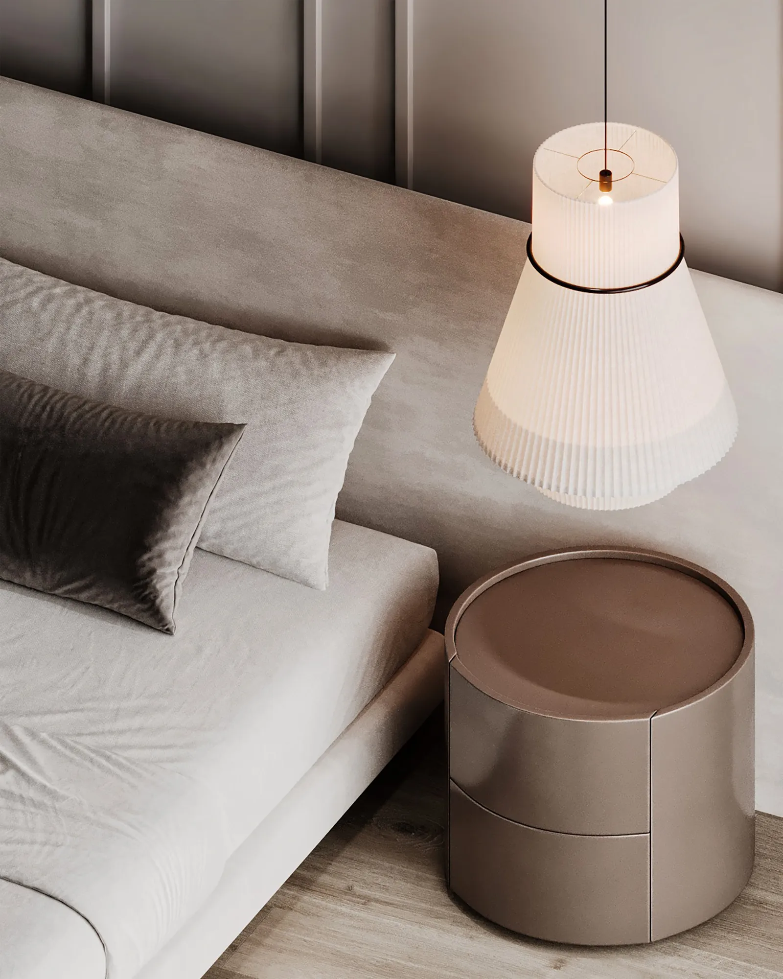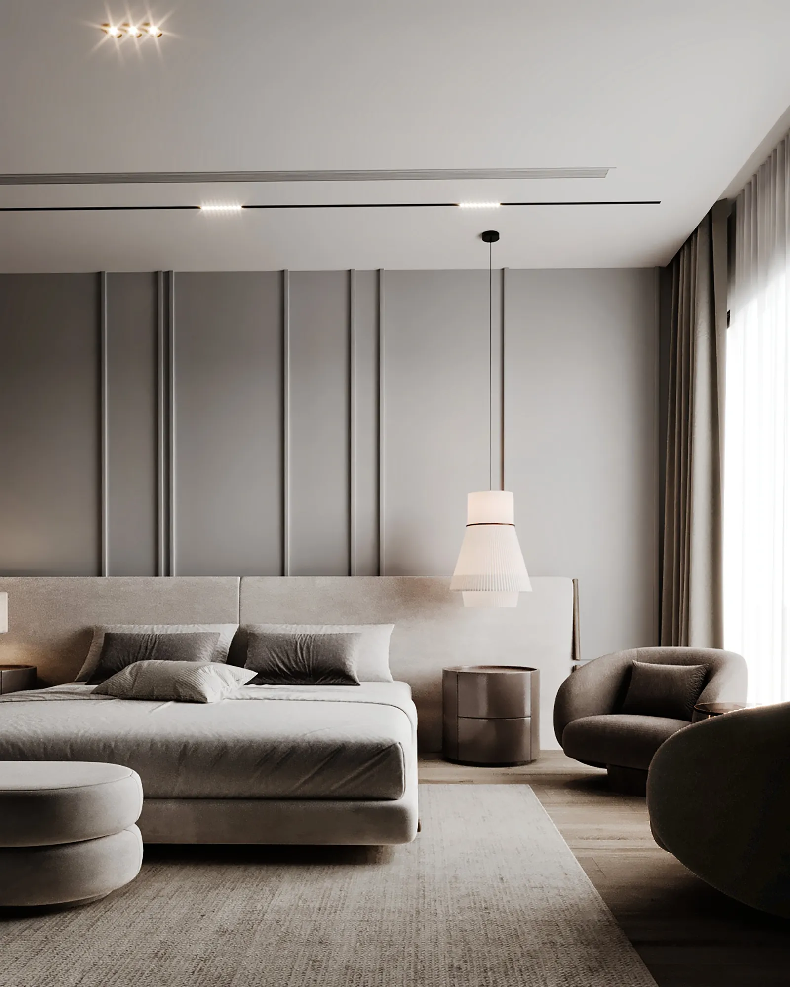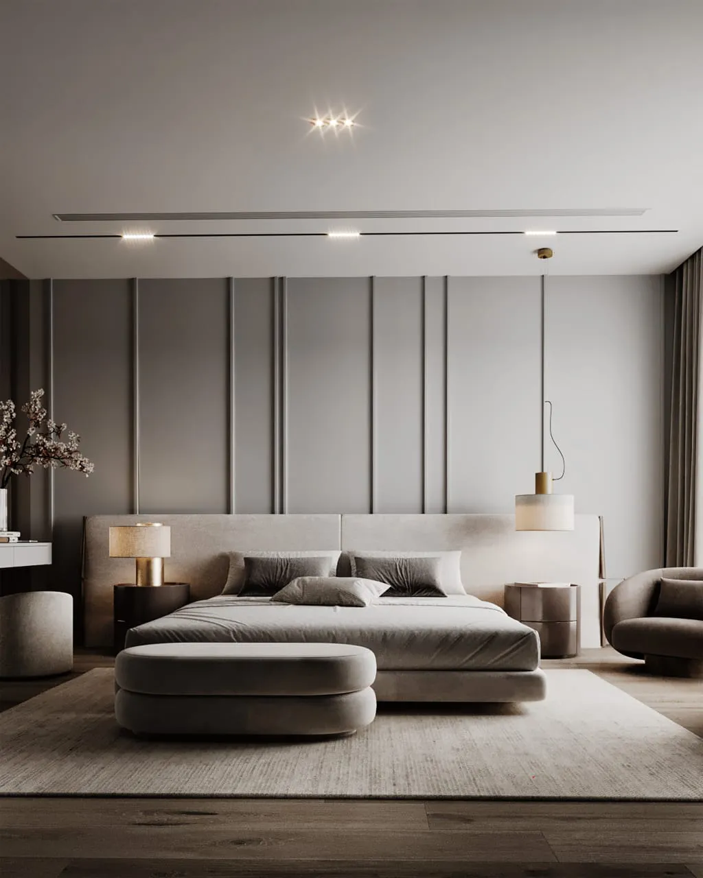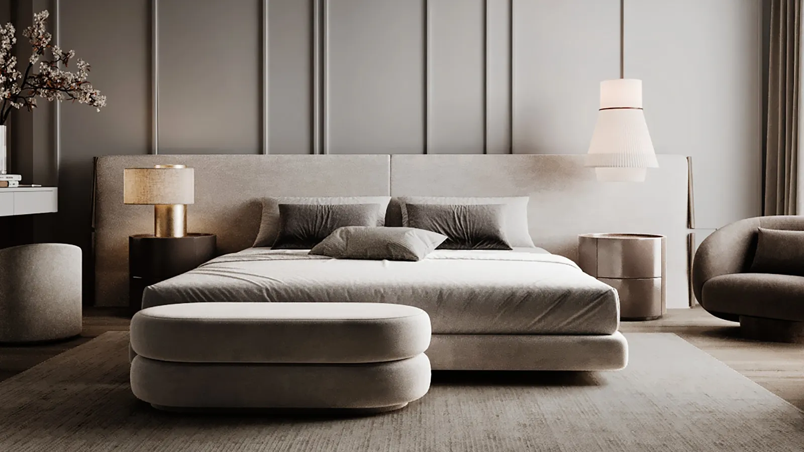- Primary Surfaces: The walls feature a beautiful, monochromatic paneling that adds subtle depth and a refined architectural rhythm. This warm gray serves as a perfect backdrop for the custom-upholstered headboard and bed frame, which are wrapped in a soft, plush fabric that invites touch.
