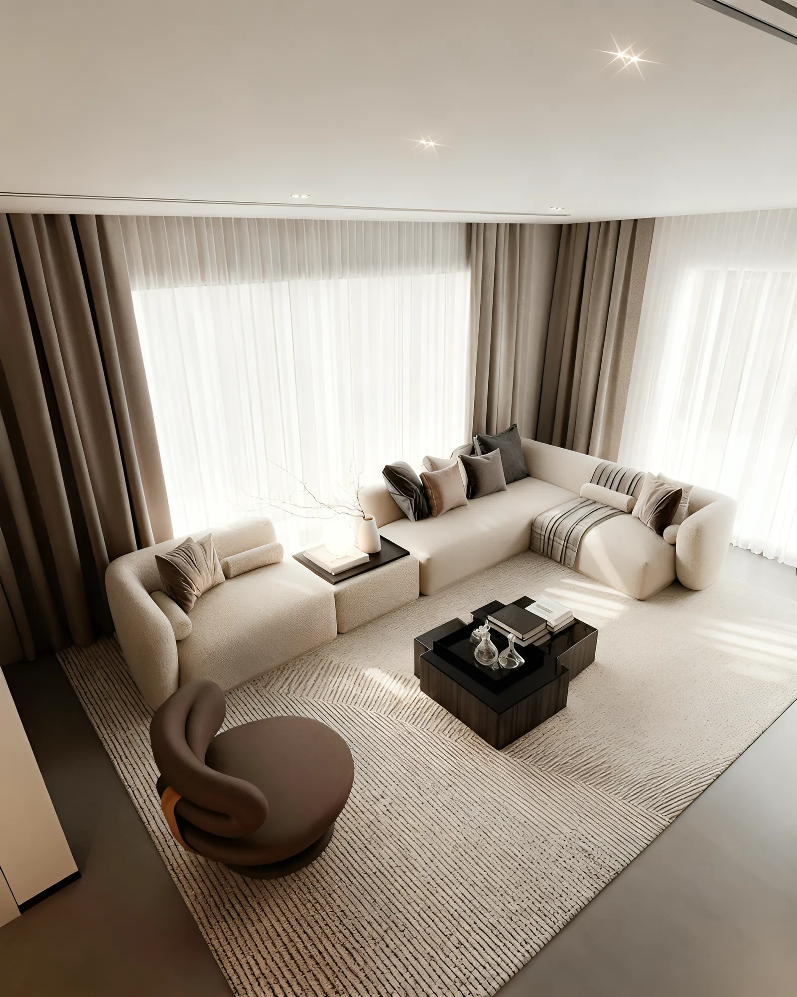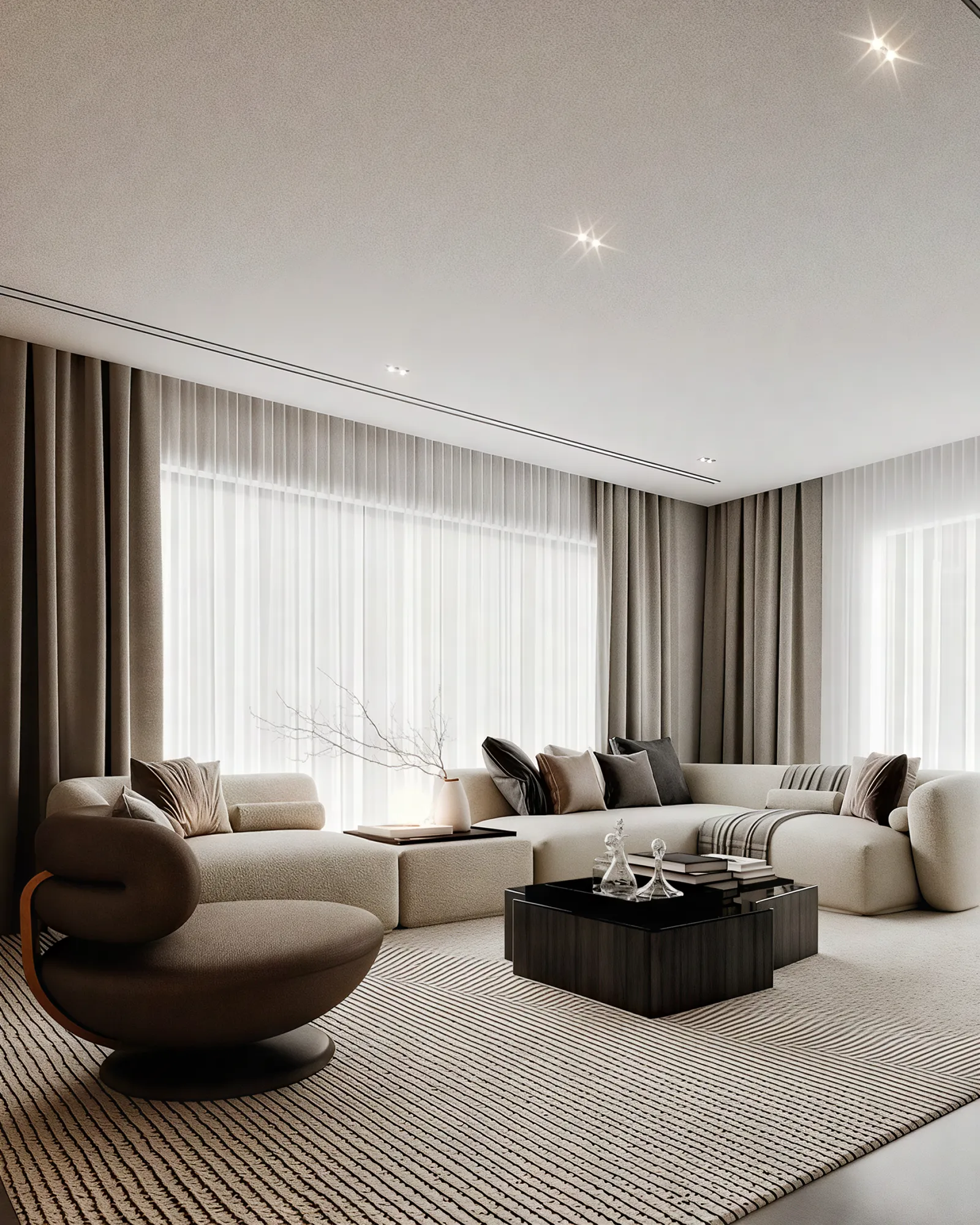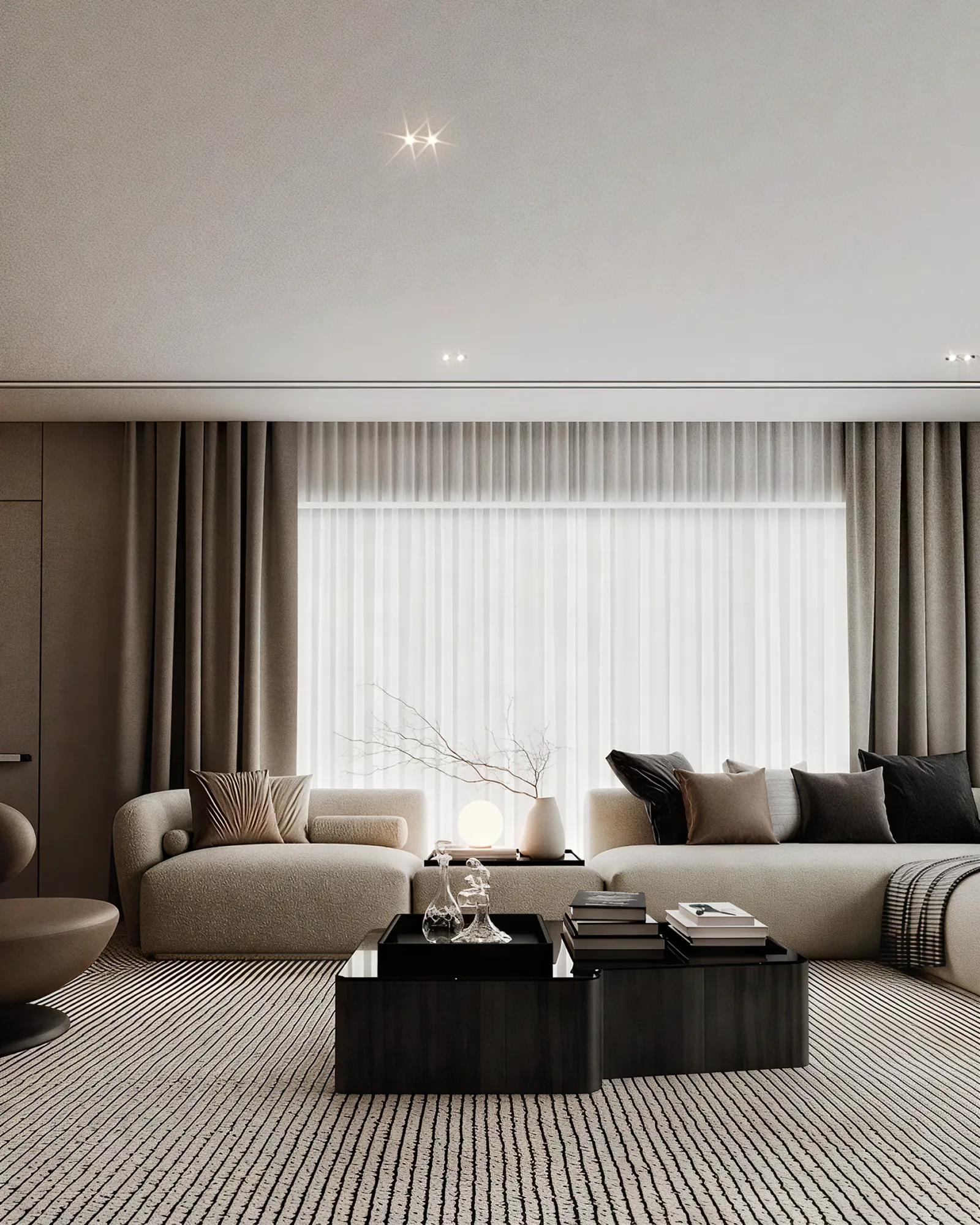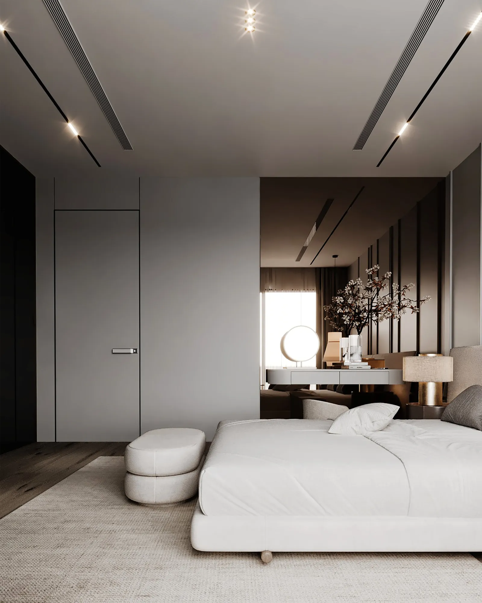 - Metals & Light: Warm metallic accents, in tones of brushed gold and bronze, are used sparingly on the side table lamps and ceiling light fixtures, providing moments of luminous warmth. The lighting itself is a design feature, with recessed LED strips and elegant pendants creating a layered glow that transforms the room by day and night.