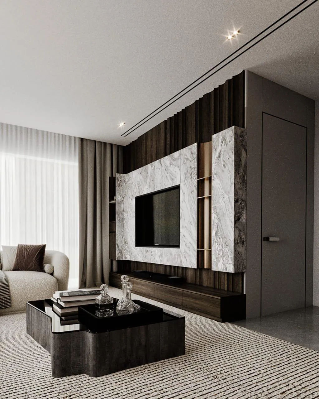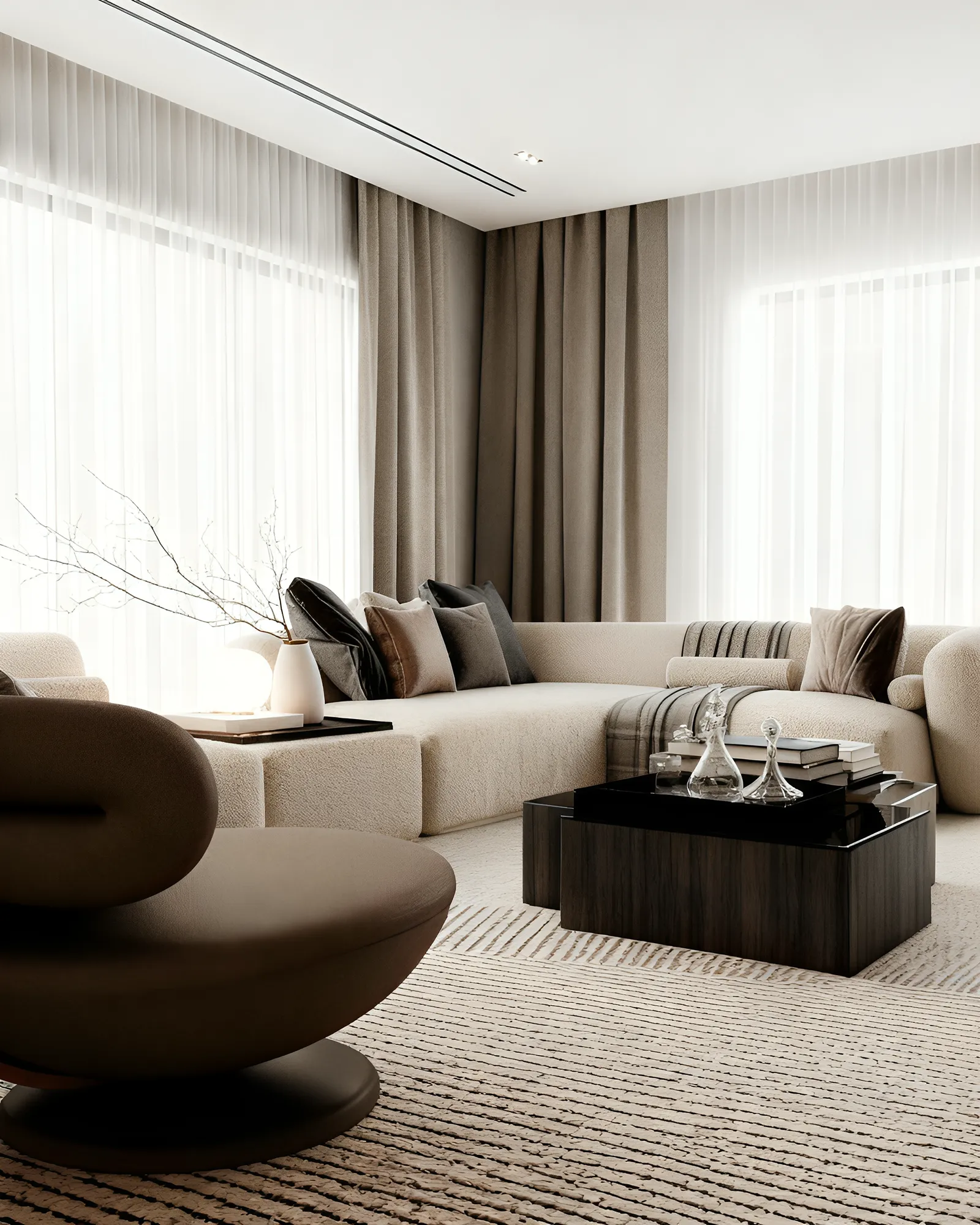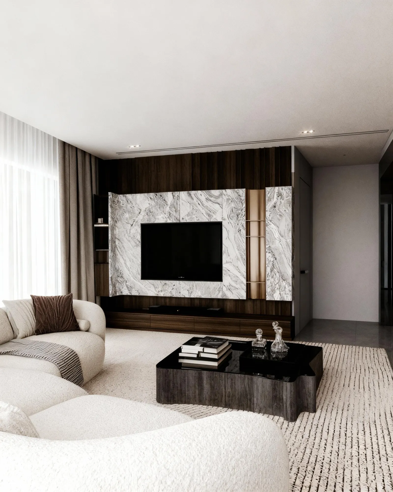 - Metals & Light: Warm metallic accents, in tones of brushed gold and bronze, are used sparingly on the side table lamps and ceiling light fixtures, providing moments of luminous warmth. The lighting itself is a design feature, with recessed LED strips and elegant pendants creating a layered glow that transforms the room by day and night.