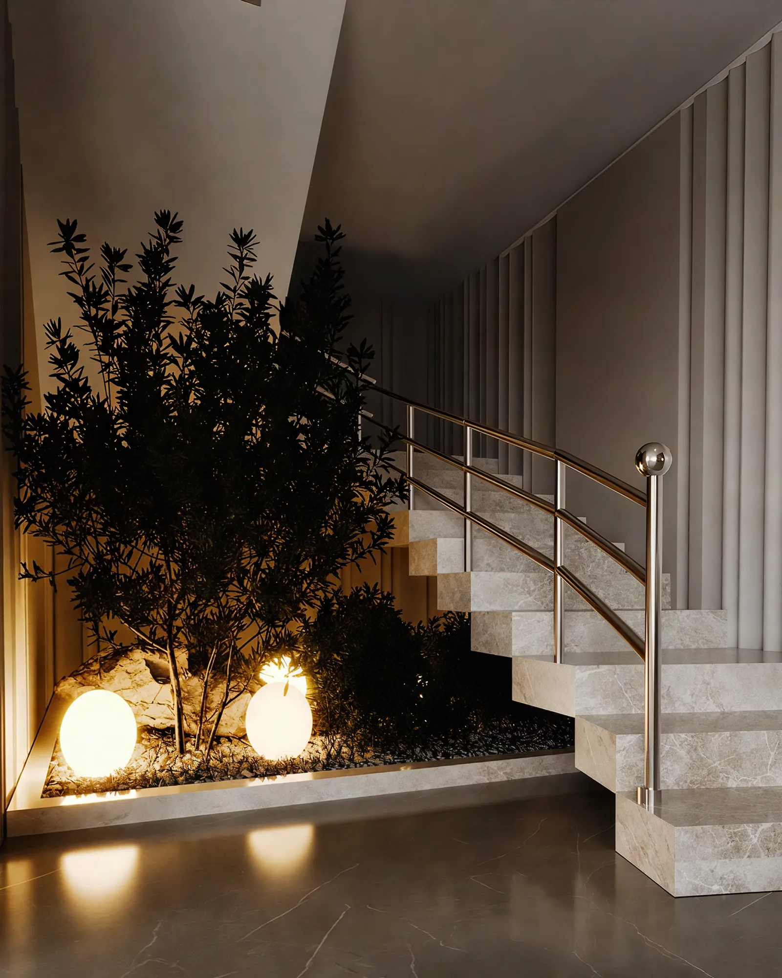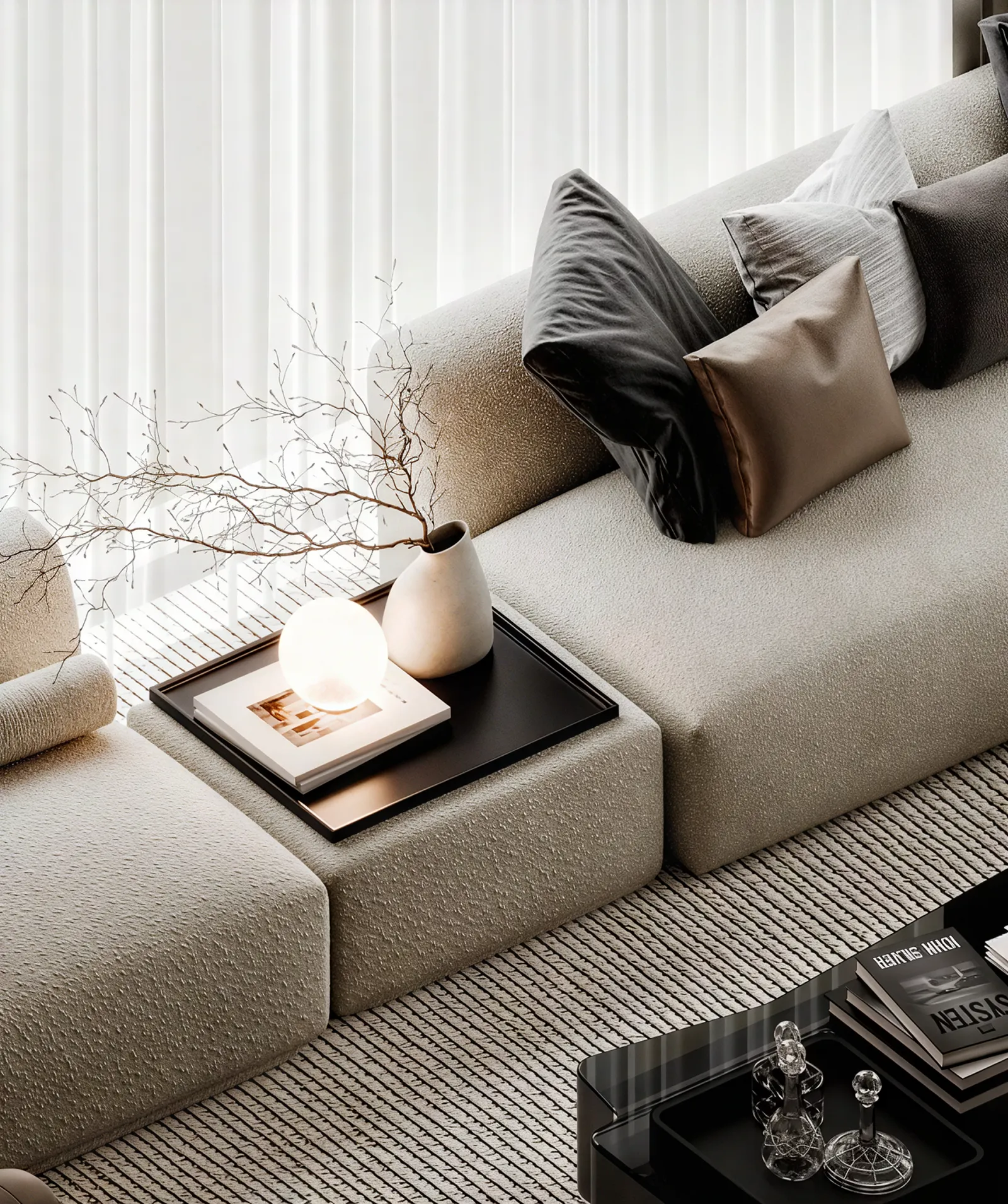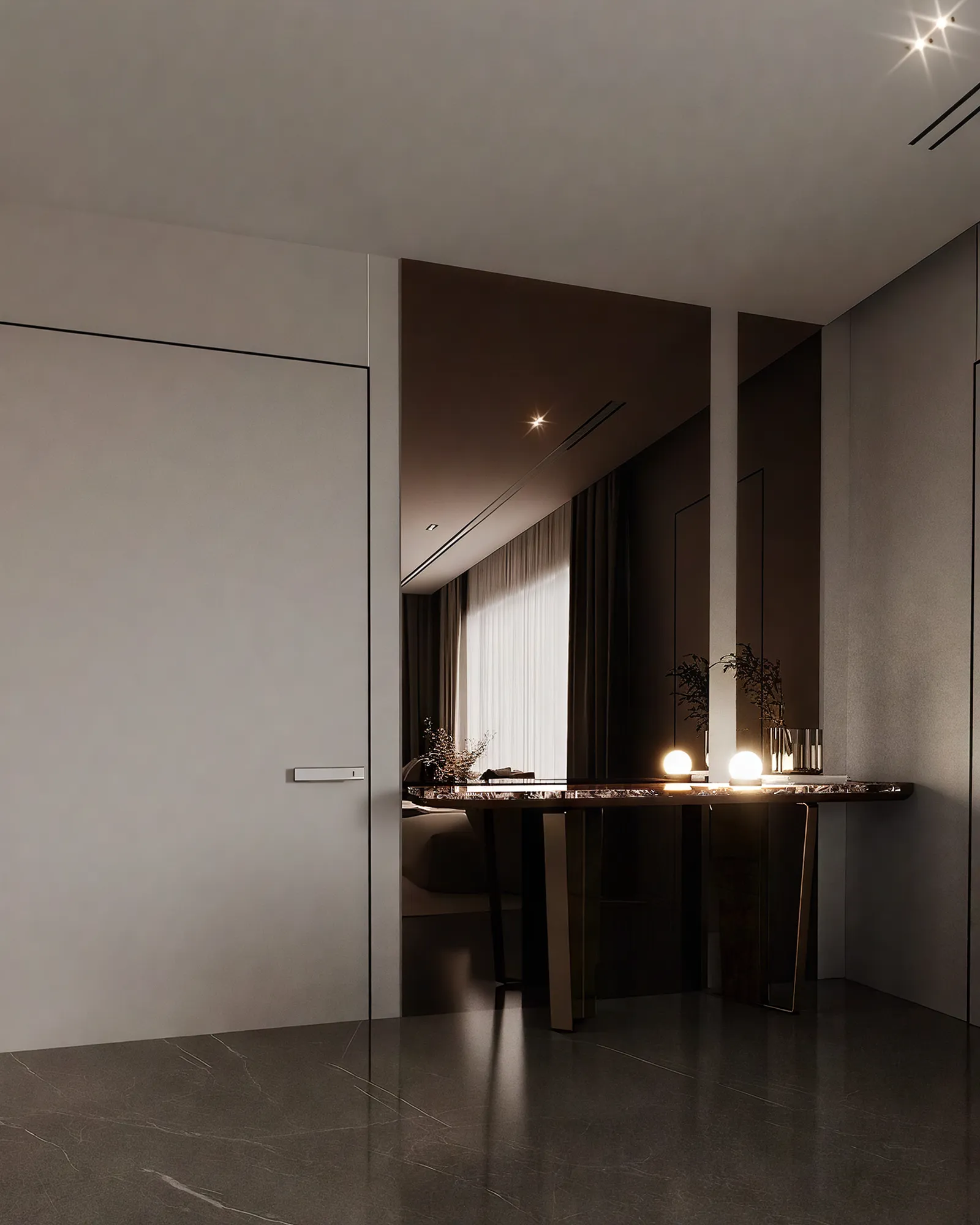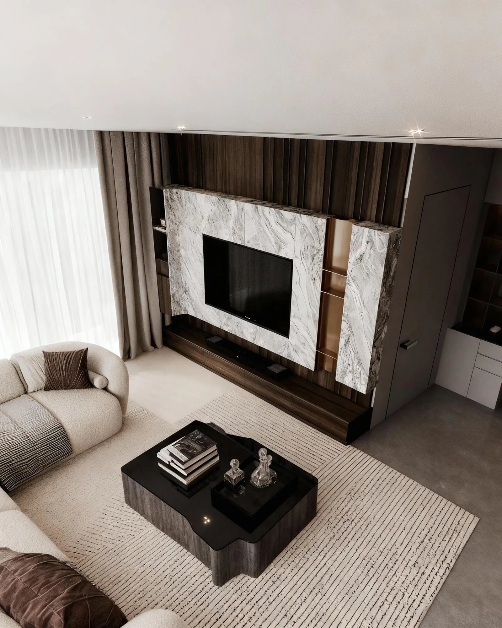 - Metals & Light: Warm metallic accents, in tones of brushed gold and bronze, are used sparingly on the side table lamps and ceiling light fixtures, providing moments of luminous warmth. The lighting itself is a design feature, with recessed LED strips and elegant pendants creating a layered glow that transforms the room by day and night.