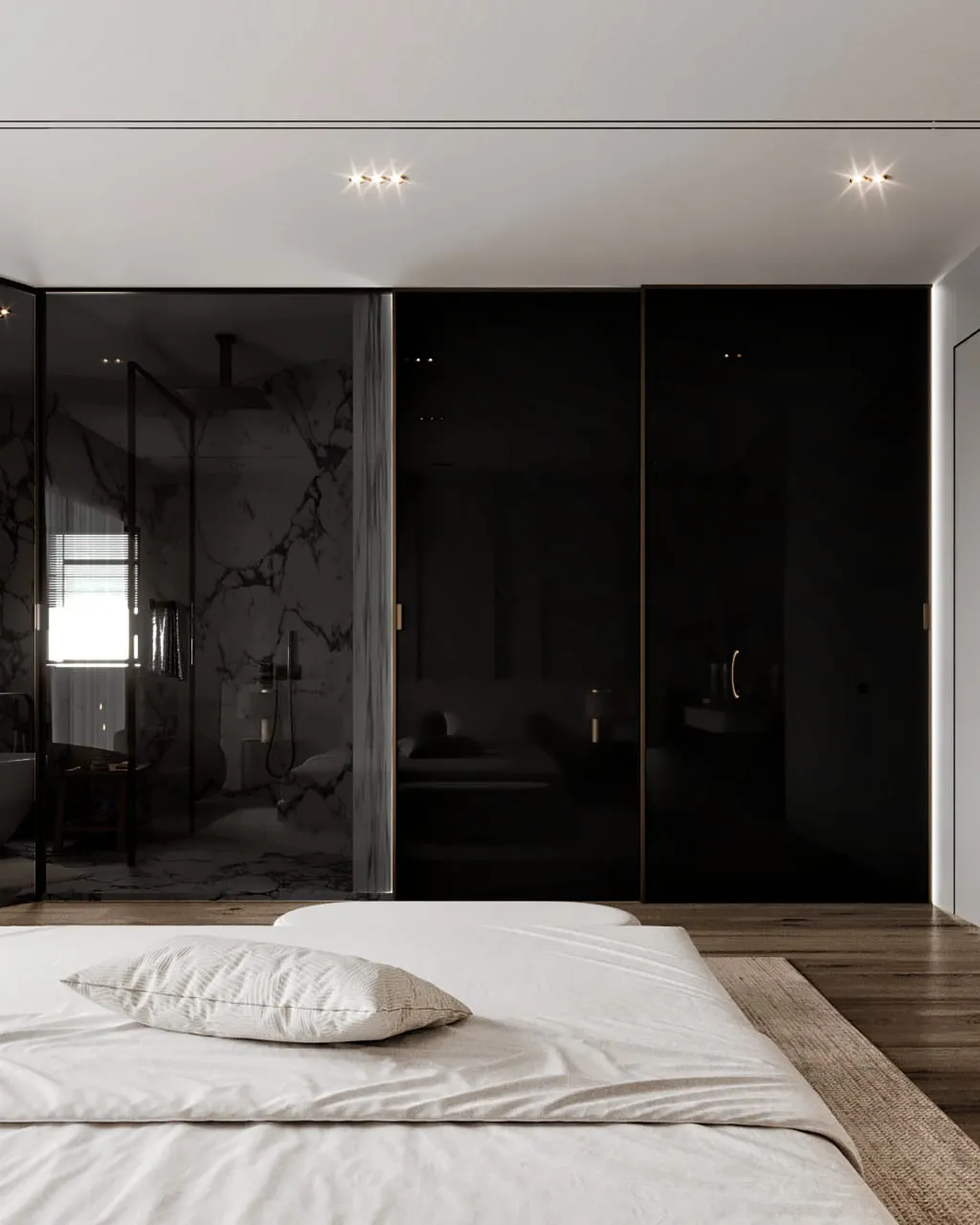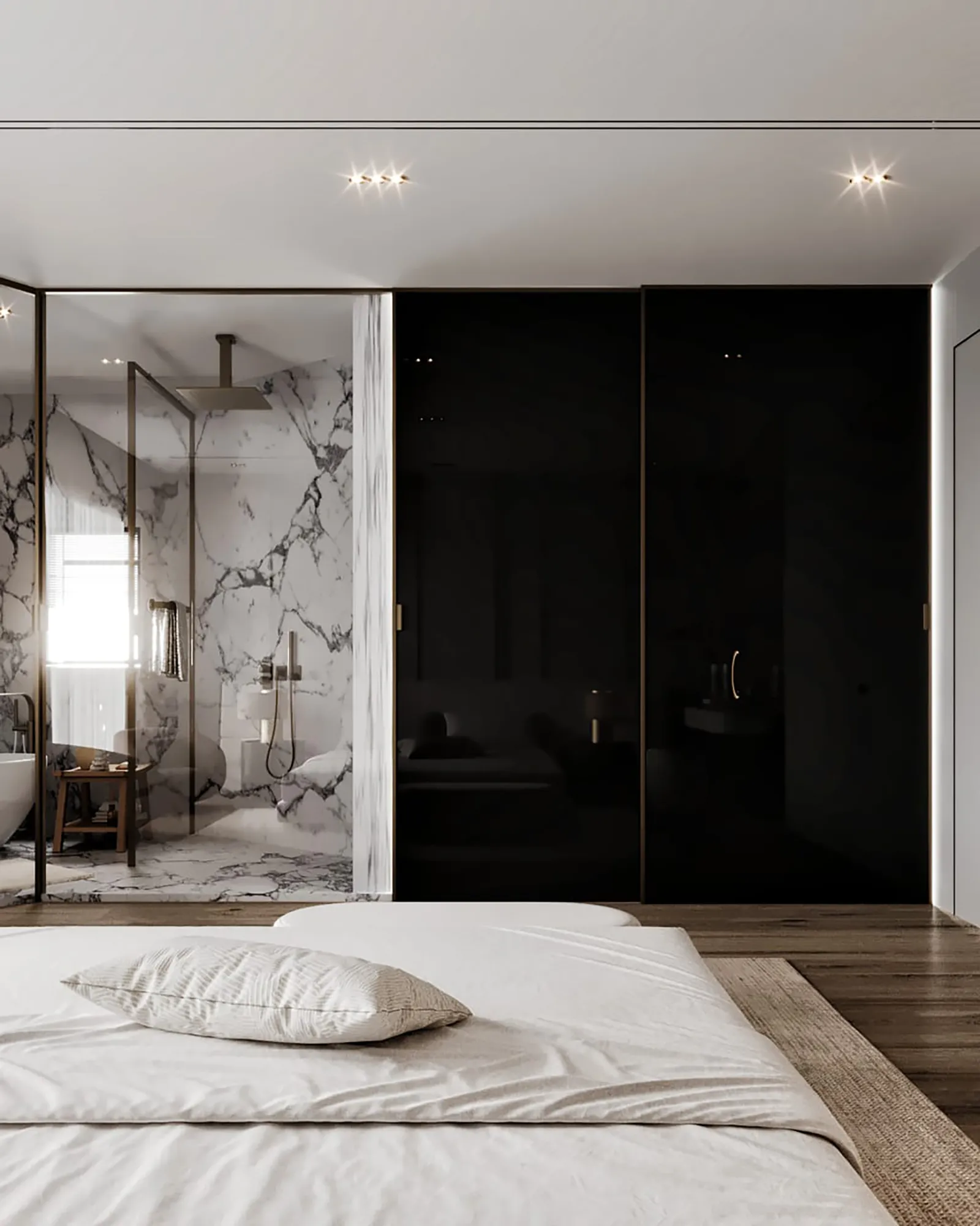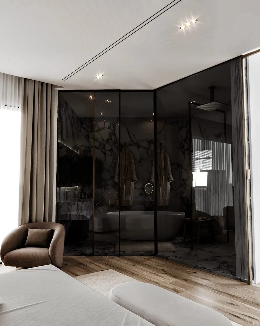 Our approach to the design was rooted in the principle of creating a harmonious, layered experience. We balanced the room’s minimalist aesthetic with a deep focus on texture and atmosphere. The bedroom itself is a study in soft elegance, with a subtle palette and plush materials that invite relaxation. The seamless integration of a new master bathroom creates a fluid, uninterrupted flow. The design intentionally uses contrast as a powerful tool, where the bedroom’s quiet serenity gives way to the bathroom’s bold, sophisticated drama, offering two distinct yet connected moods within one unified space.