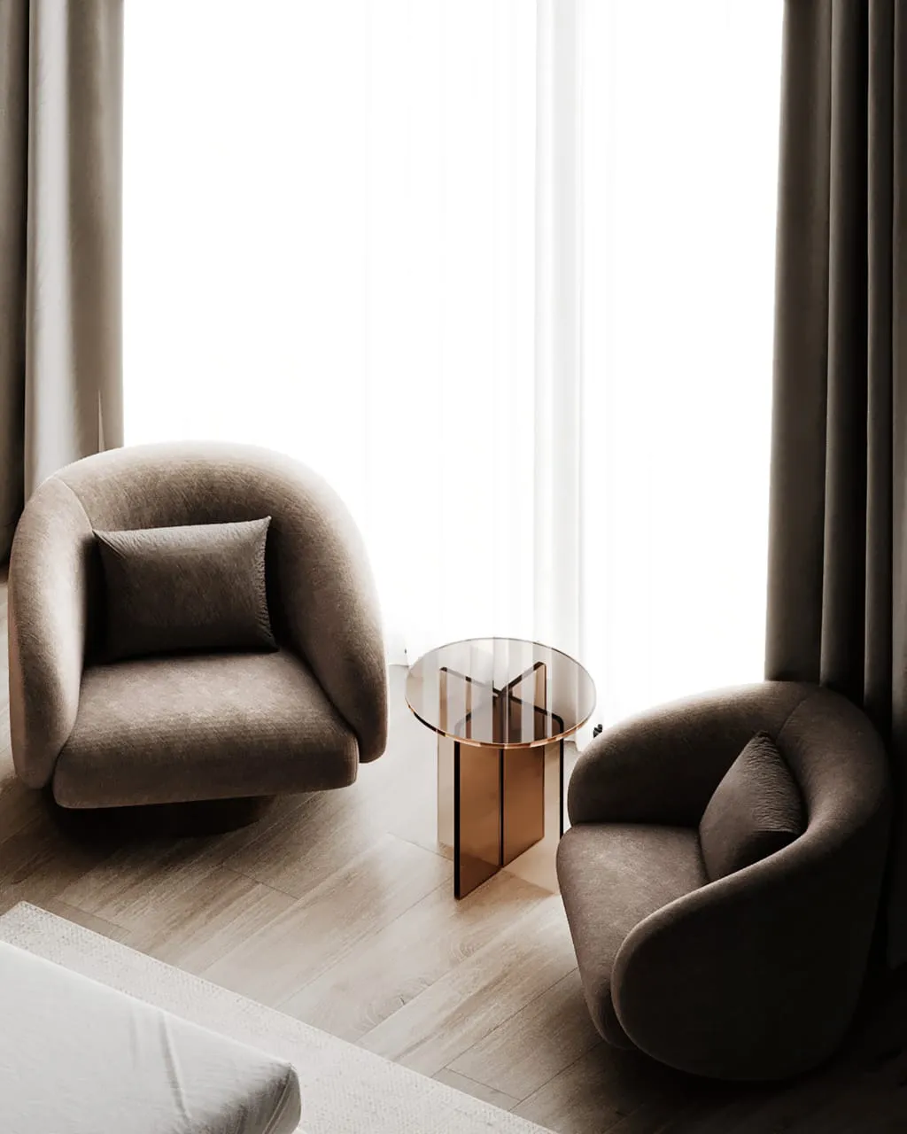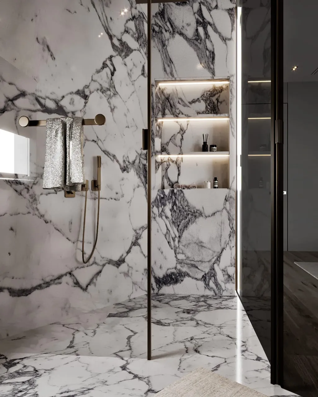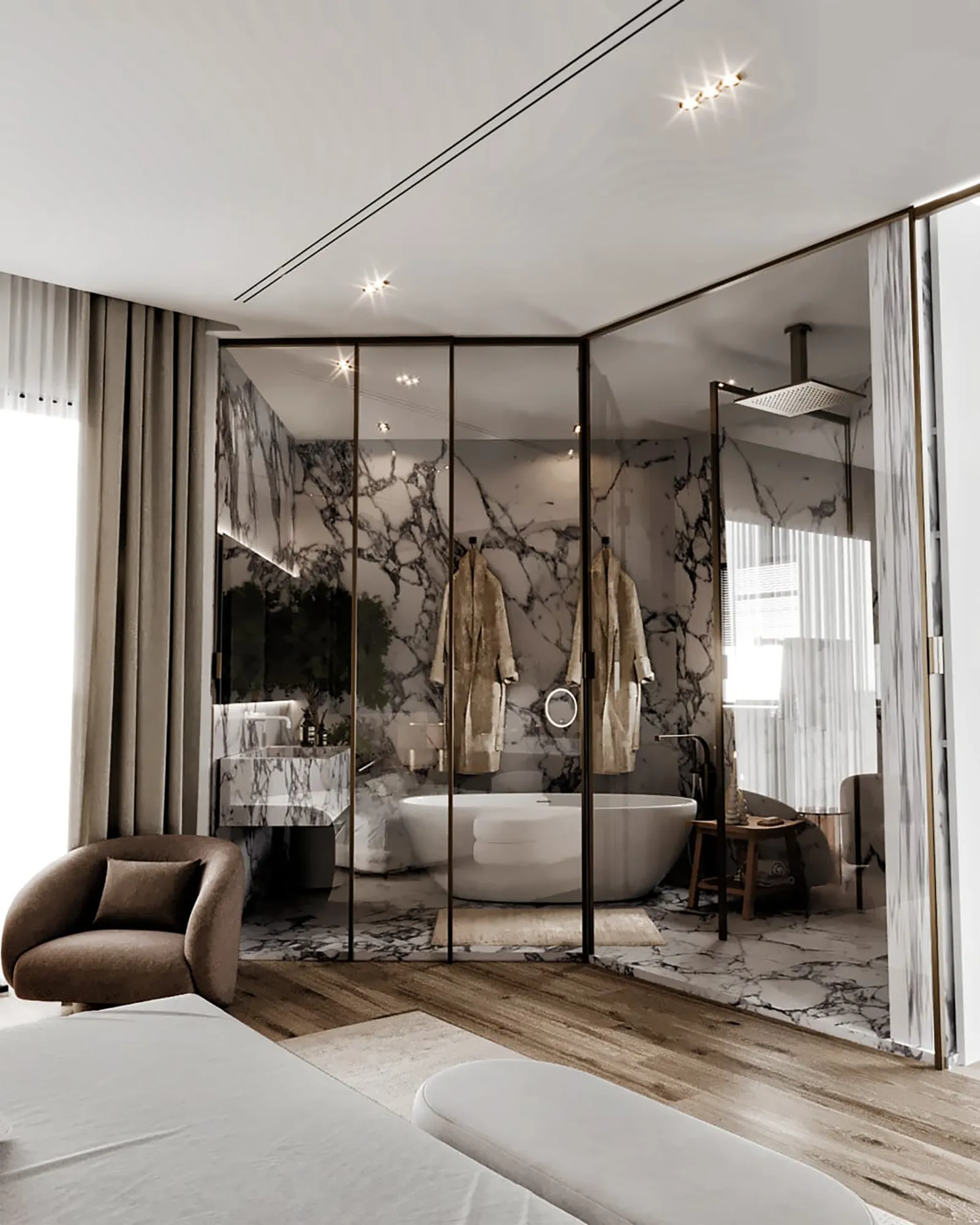 Our approach to the design was rooted in the principle of creating a harmonious, layered experience. We balanced the room’s minimalist aesthetic with a deep focus on texture and atmosphere. The bedroom itself is a study in soft elegance, with a subtle palette and plush materials that invite relaxation. The seamless integration of a new master bathroom creates a fluid, uninterrupted flow. The design intentionally uses contrast as a powerful tool, where the bedroom’s quiet serenity gives way to the bathroom’s bold, sophisticated drama, offering two distinct yet connected moods within one unified space.