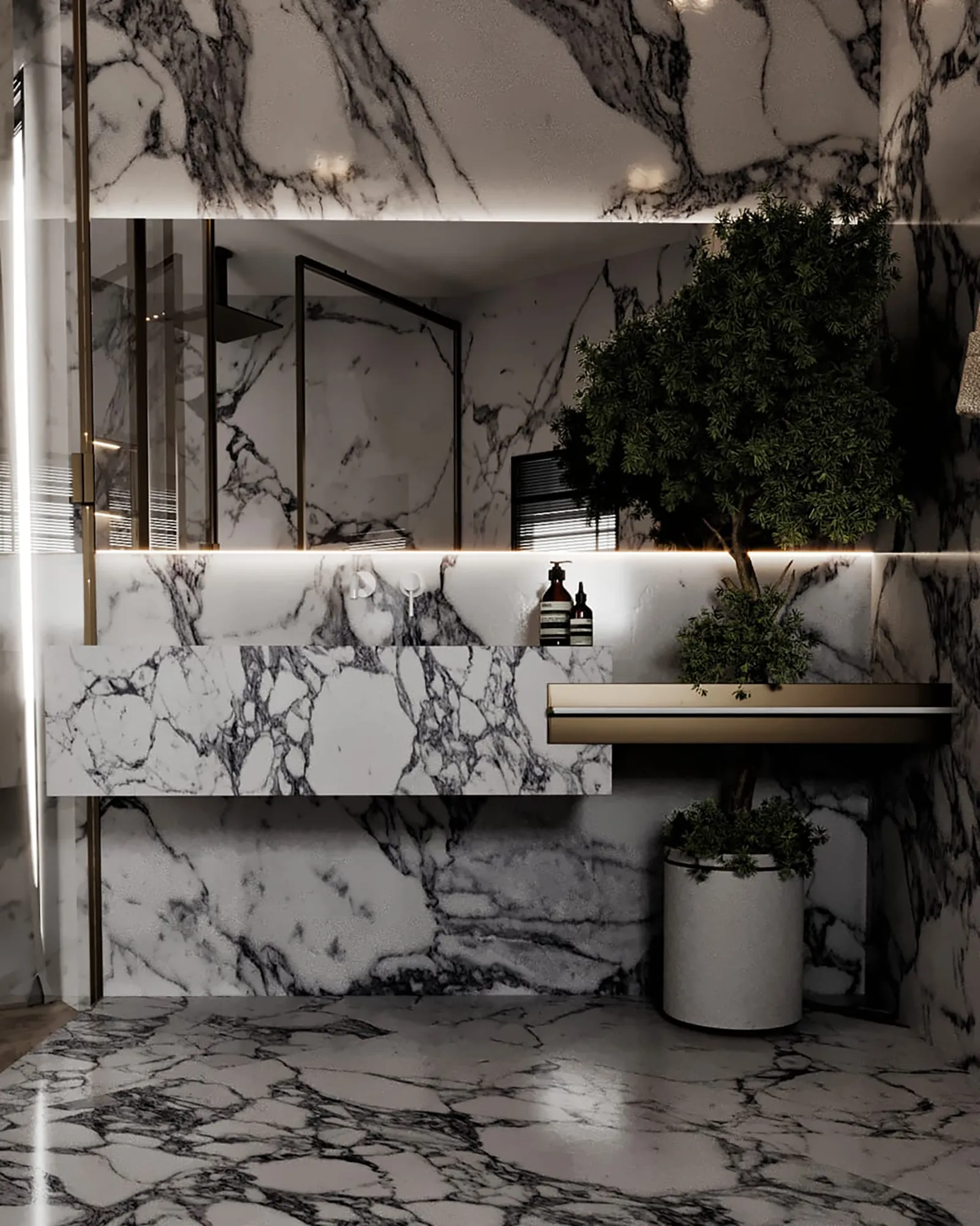 - Accents: The dramatic use of black in the tinted glass and tiling adds a powerful, grounding element that defines the new bathroom space. This dark contrast is balanced by the luminous warmth of gold and bronze