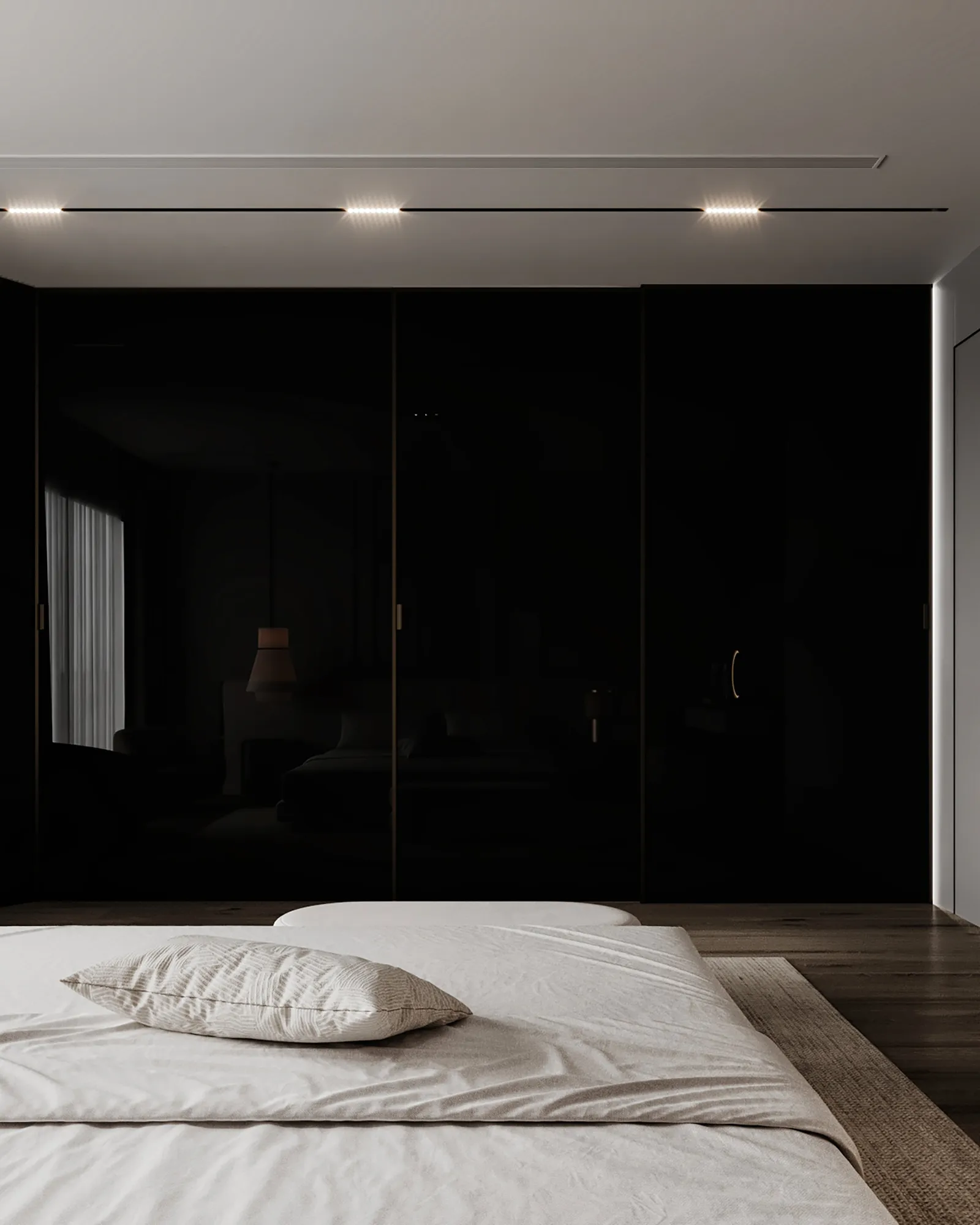 The concept for this project began with a single purpose: to sculpt a private sanctuary of ultimate calm. We envisioned a master bedroom that transcends its function, becoming a luxurious retreat where the client could find quiet and rest. The ambition was to transform a standard space into a unified, elegant suite, blending a serene atmosphere with elements of dramatic, refined luxury. This is a space where every detail is designed to soothe the senses and provide a complete escape.