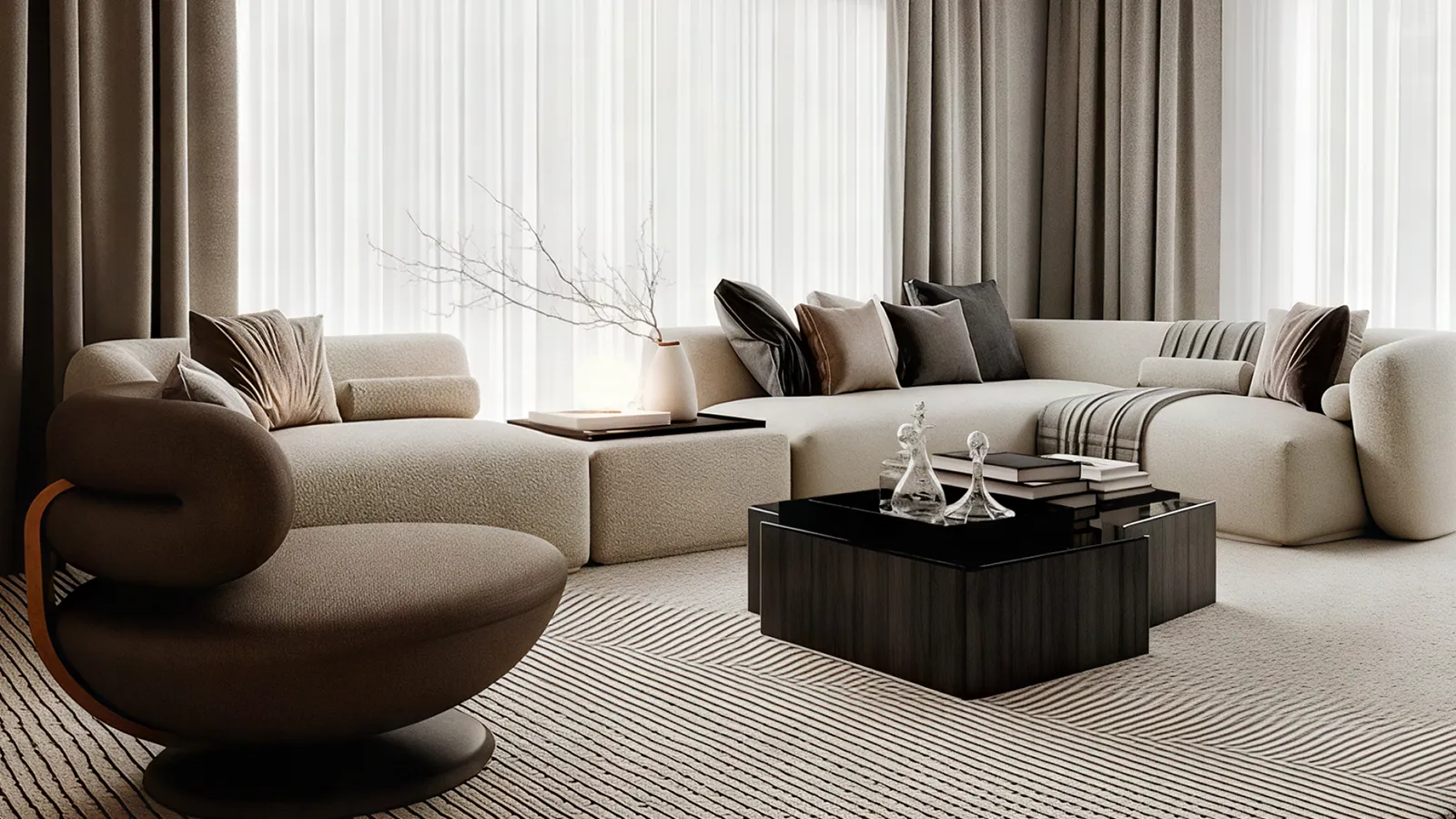The color palette is a story of quiet sophistication, where muted neutrals are punctuated by bold, elegant statements.