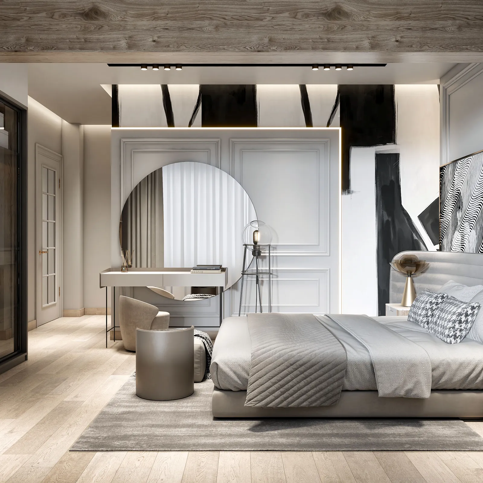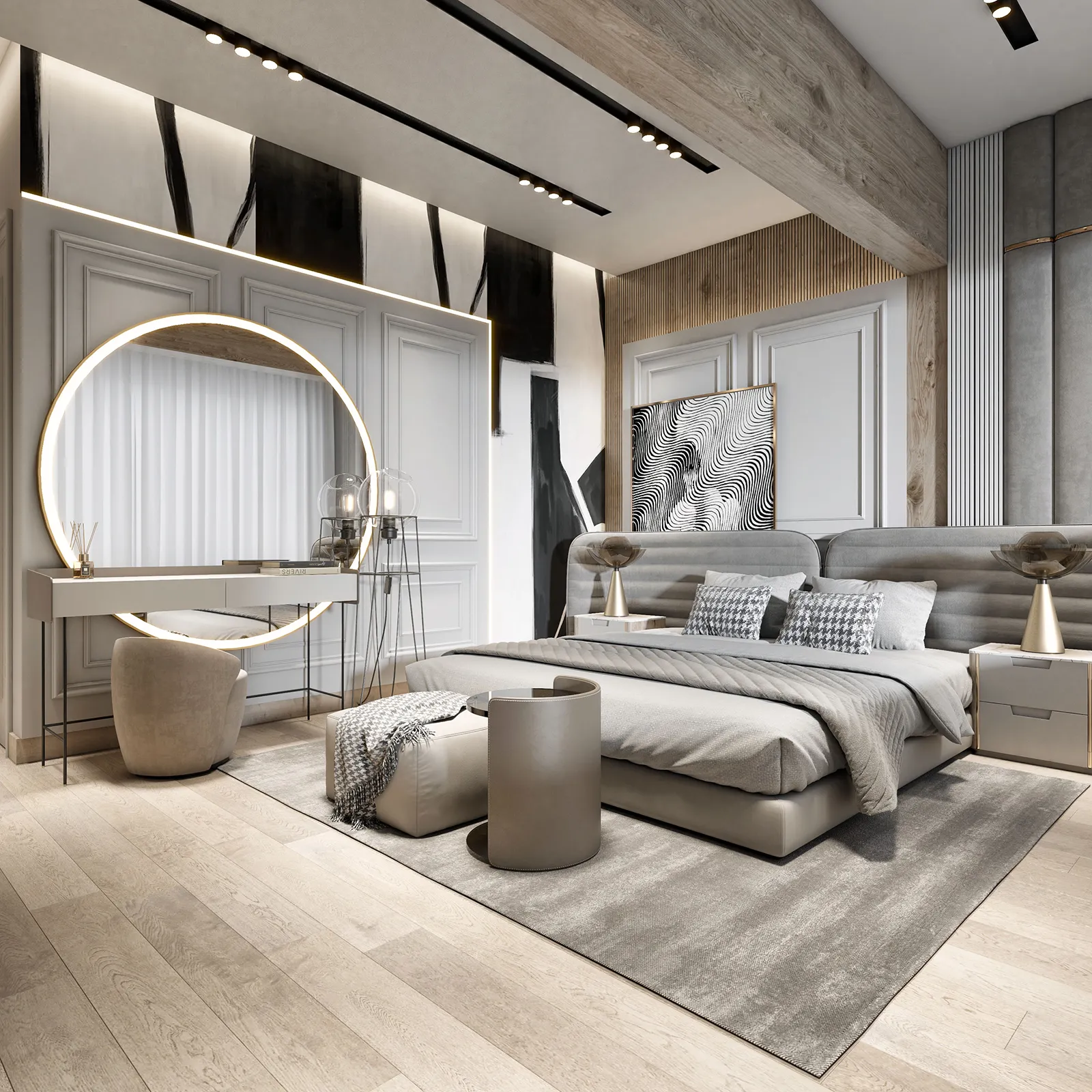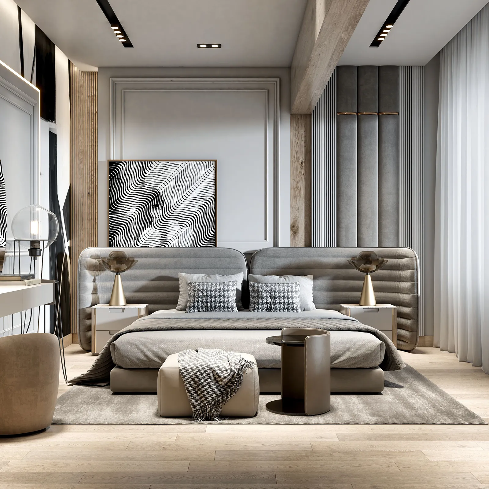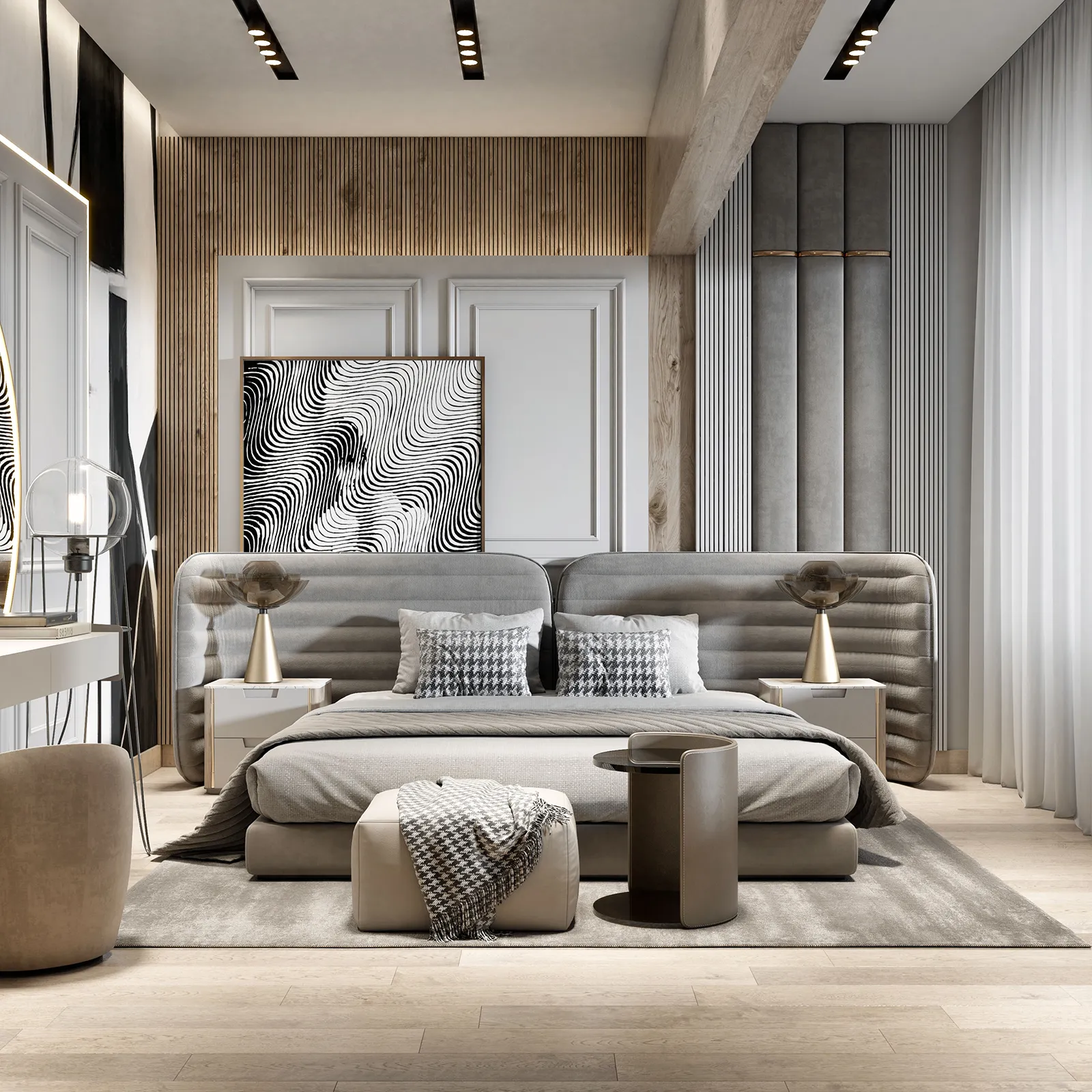 Primary Surfaces: The walls are a calming, cool gray, brought to life with ornate, white decorative moldings that lend a traditional, aristocratic feel. This is starkly contrasted by bold feature walls in a dark, heavily veined marble and deeply textured, fluted wood paneling, which add a powerful, modern edge.
