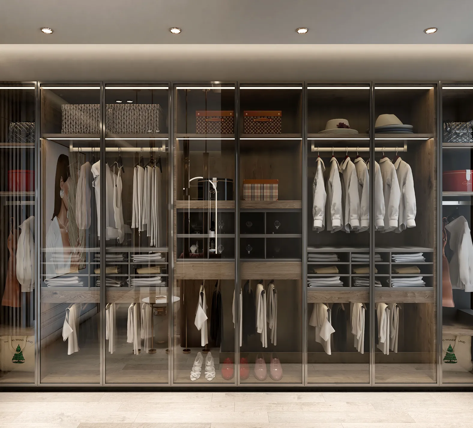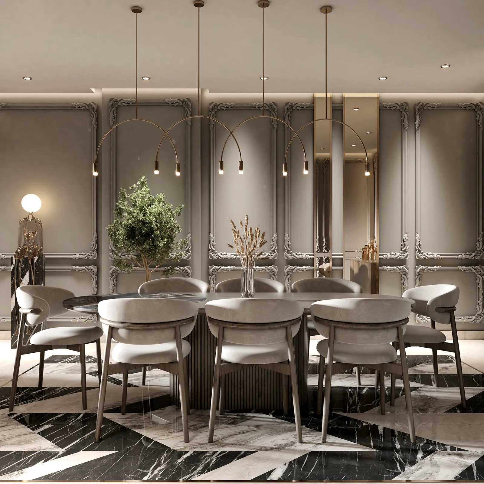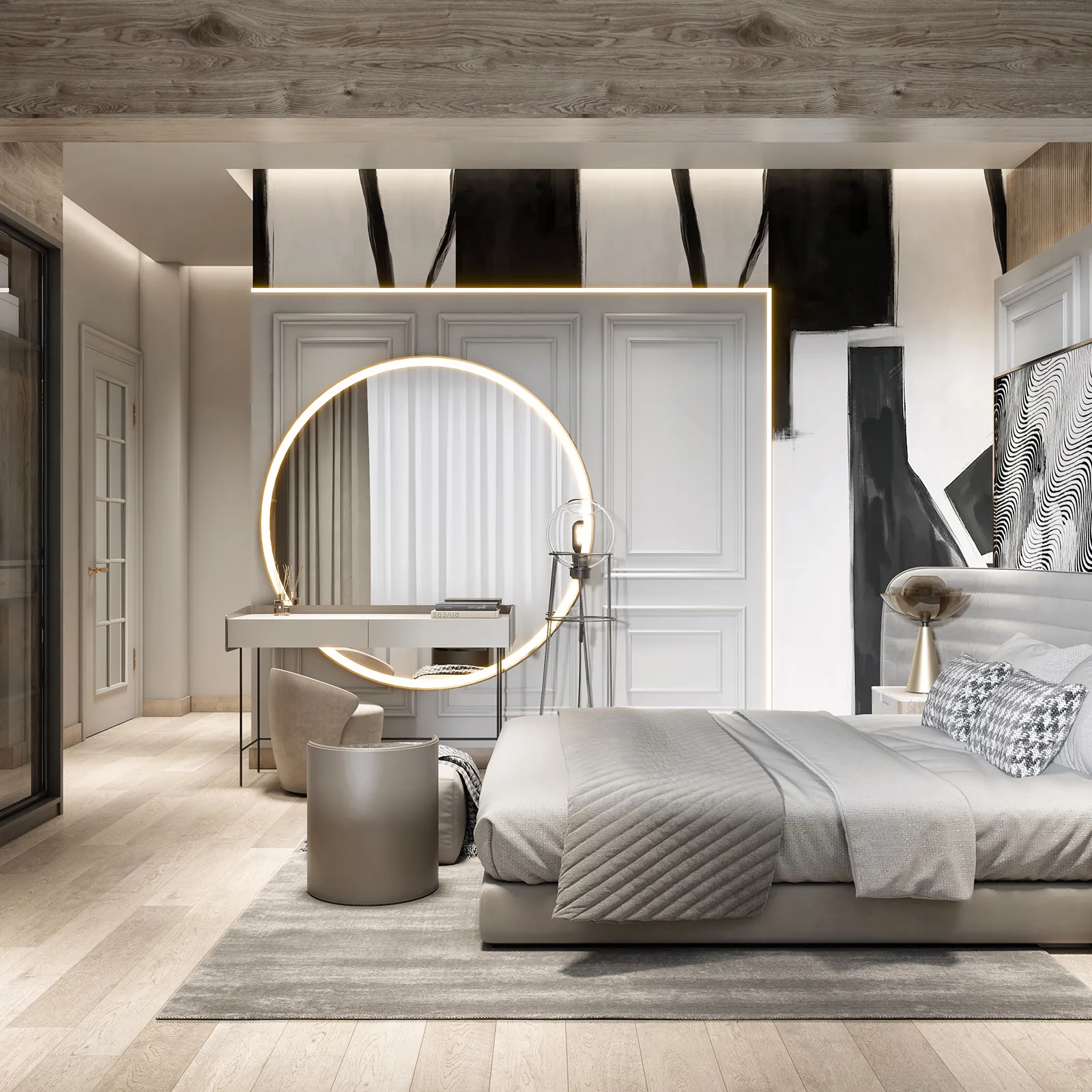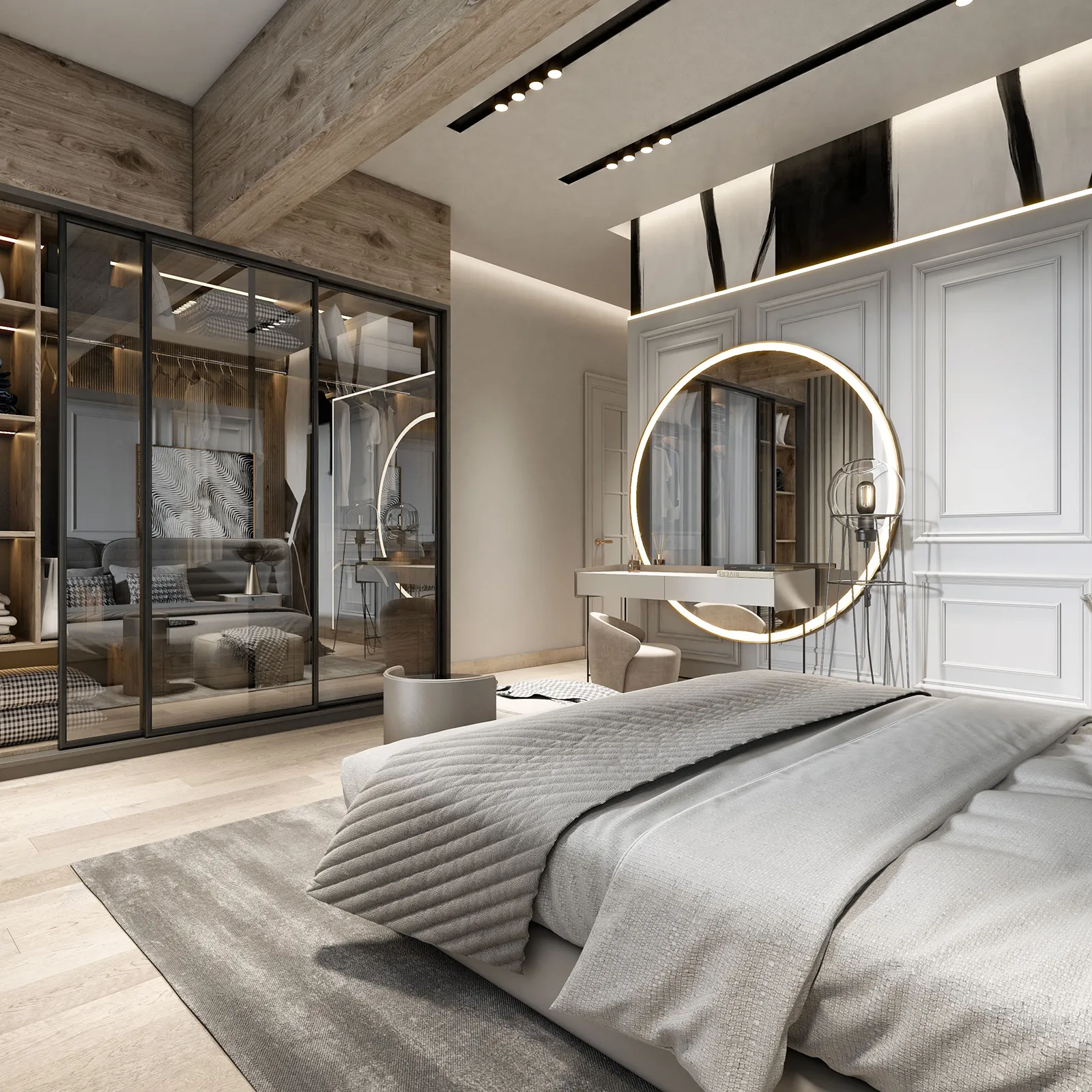 Primary Surfaces: The walls are a calming, cool gray, brought to life with ornate, white decorative moldings that lend a traditional, aristocratic feel. This is starkly contrasted by bold feature walls in a dark, heavily veined marble and deeply textured, fluted wood paneling, which add a powerful, modern edge.