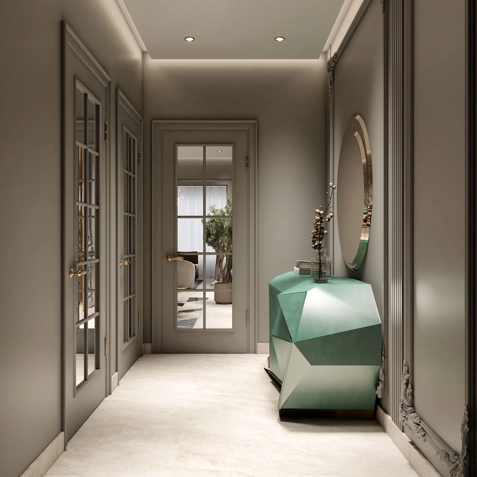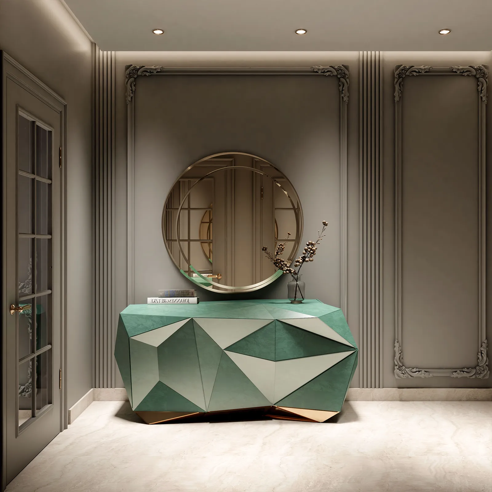 - Accents: A rich, unexpected jade green is used on the console, providing a dramatic splash of color that feels both luxurious and fresh. The entire scheme is finished with the warmth of brushed gold and brass in the mirror frames, lighting, and furniture details.