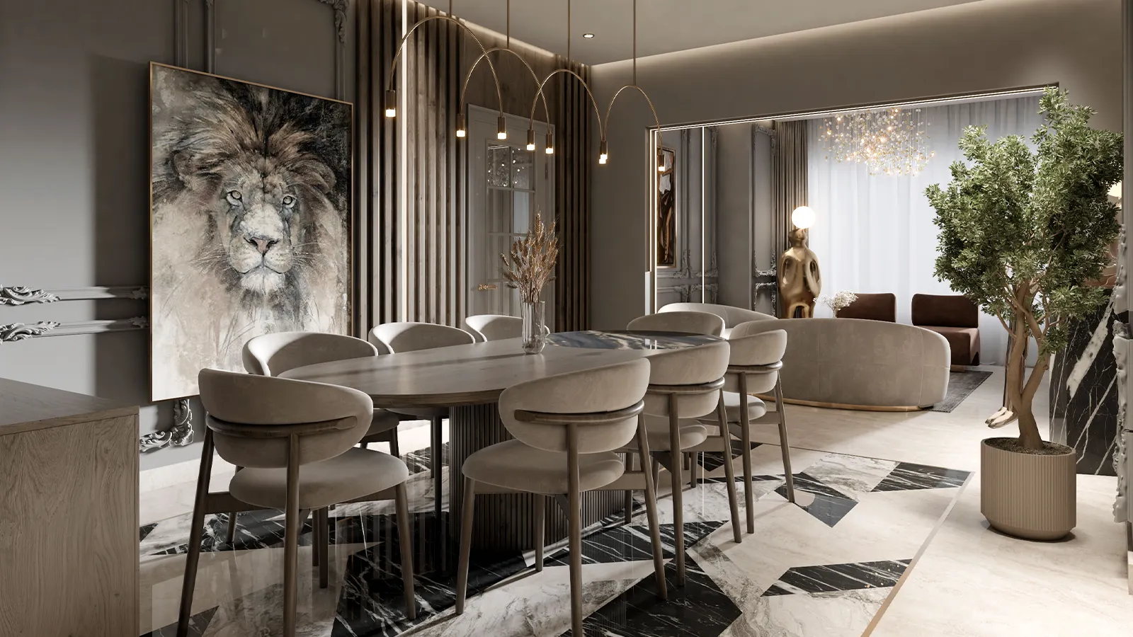 Furniture & Details: A singular, geometric console in a striking jade green lacquer with gold accents serves as a sculptural art piece in the entryway. In the dining room, a round table with a fluted wooden base is paired with elegant, minimalist chairs. The entire space is brought to life with curated art, from the powerful lion painting to a bold, contemporary sculpture.