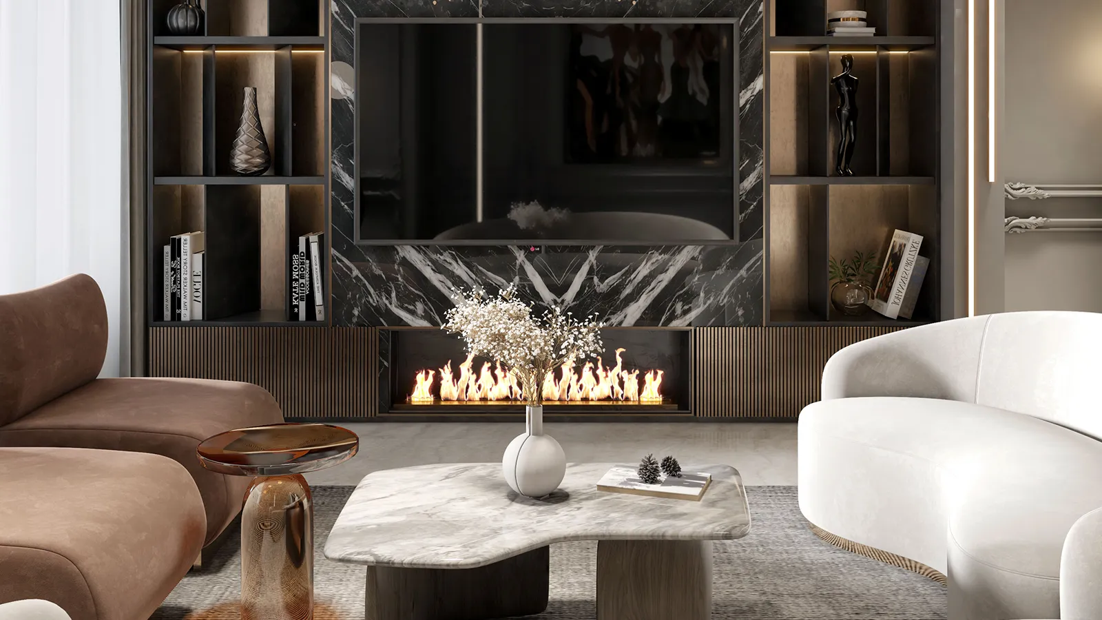 Primary Surfaces: The walls are a calming, cool gray, brought to life with ornate, white decorative moldings that lend a traditional, aristocratic feel. This is starkly contrasted by bold feature walls in a dark, heavily veined marble and deeply textured, fluted wood paneling, which add a powerful, modern edge.