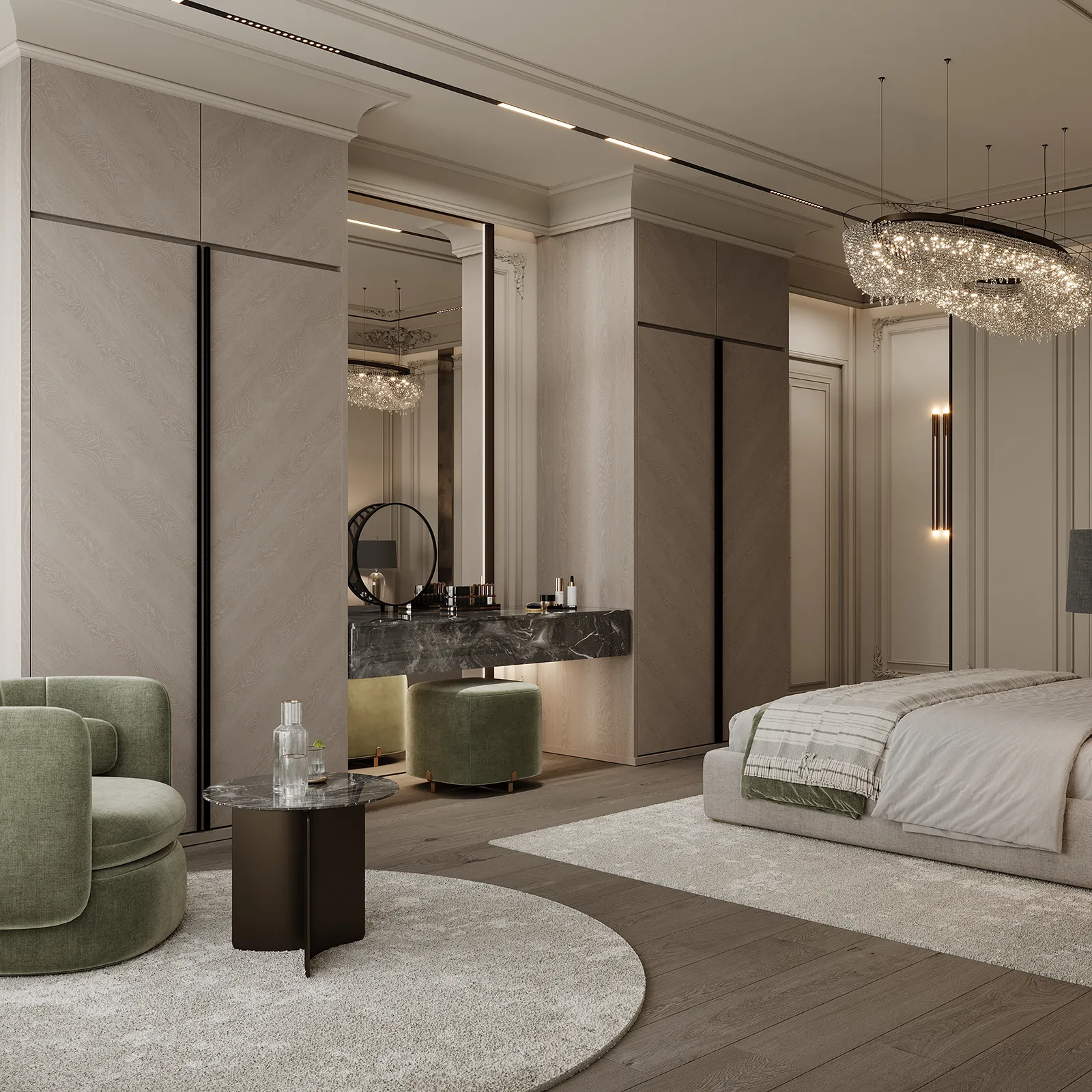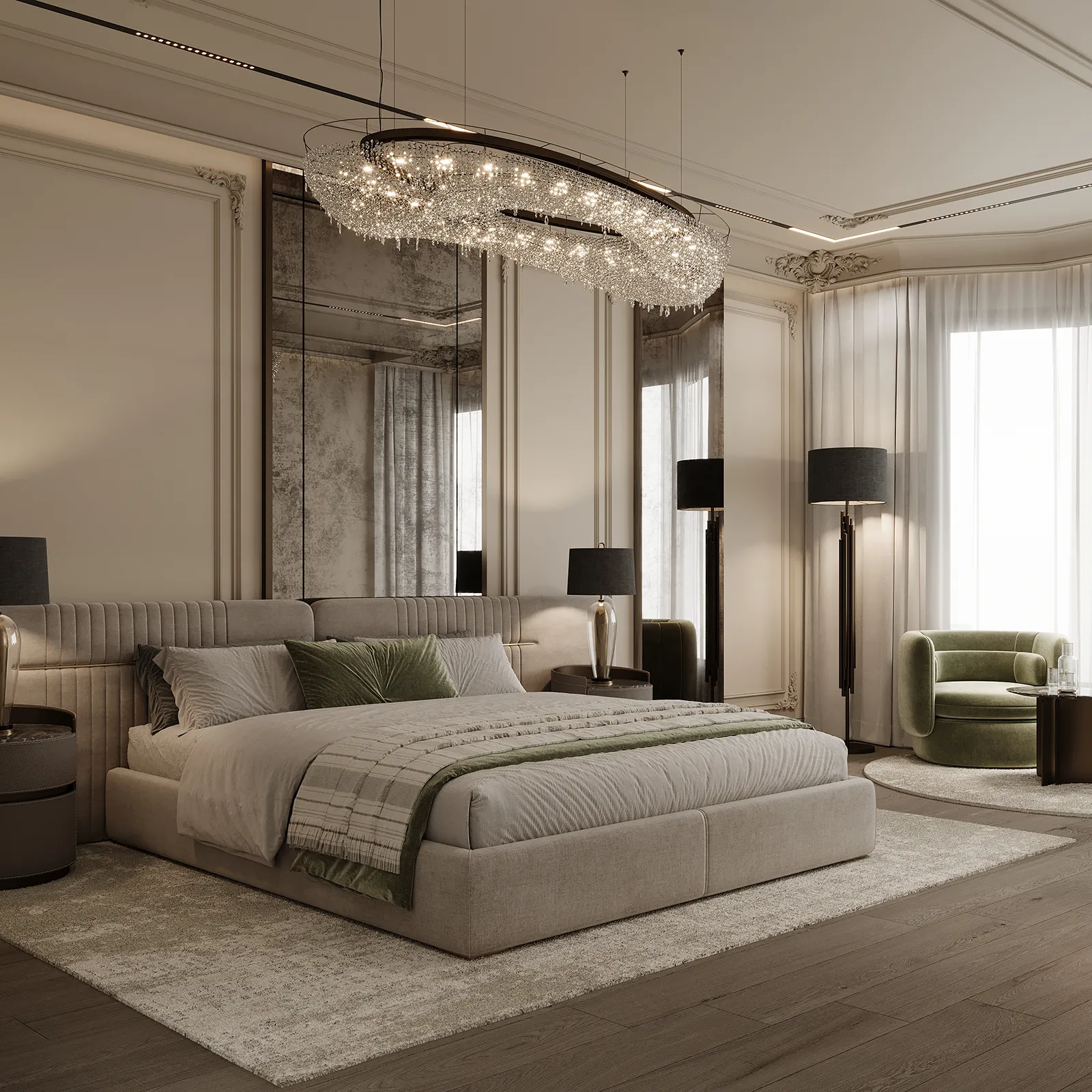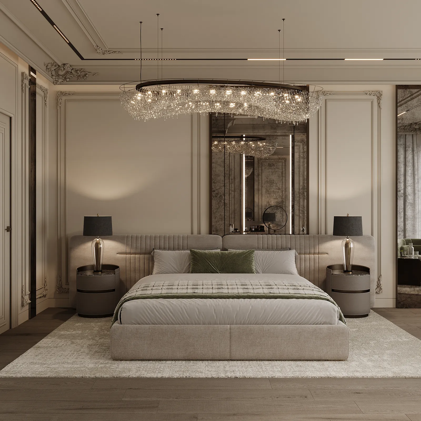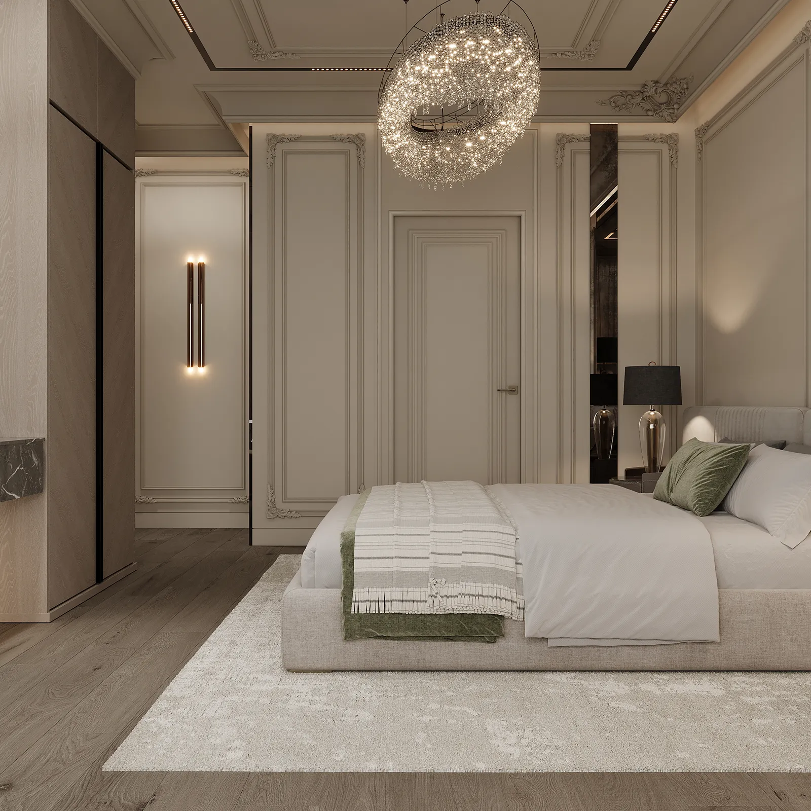 While the public areas celebrate this classical sophistication, the private bedrooms transition into serene, modern retreats designed for rest. Every detail, from the curated furniture to the custom finishes, was tailored to the client’s stature and lifestyle. The result is a quiet yet powerful expression of refined taste—a perfect French-inspired sanctuary on the Nile for a global citizen to call home.