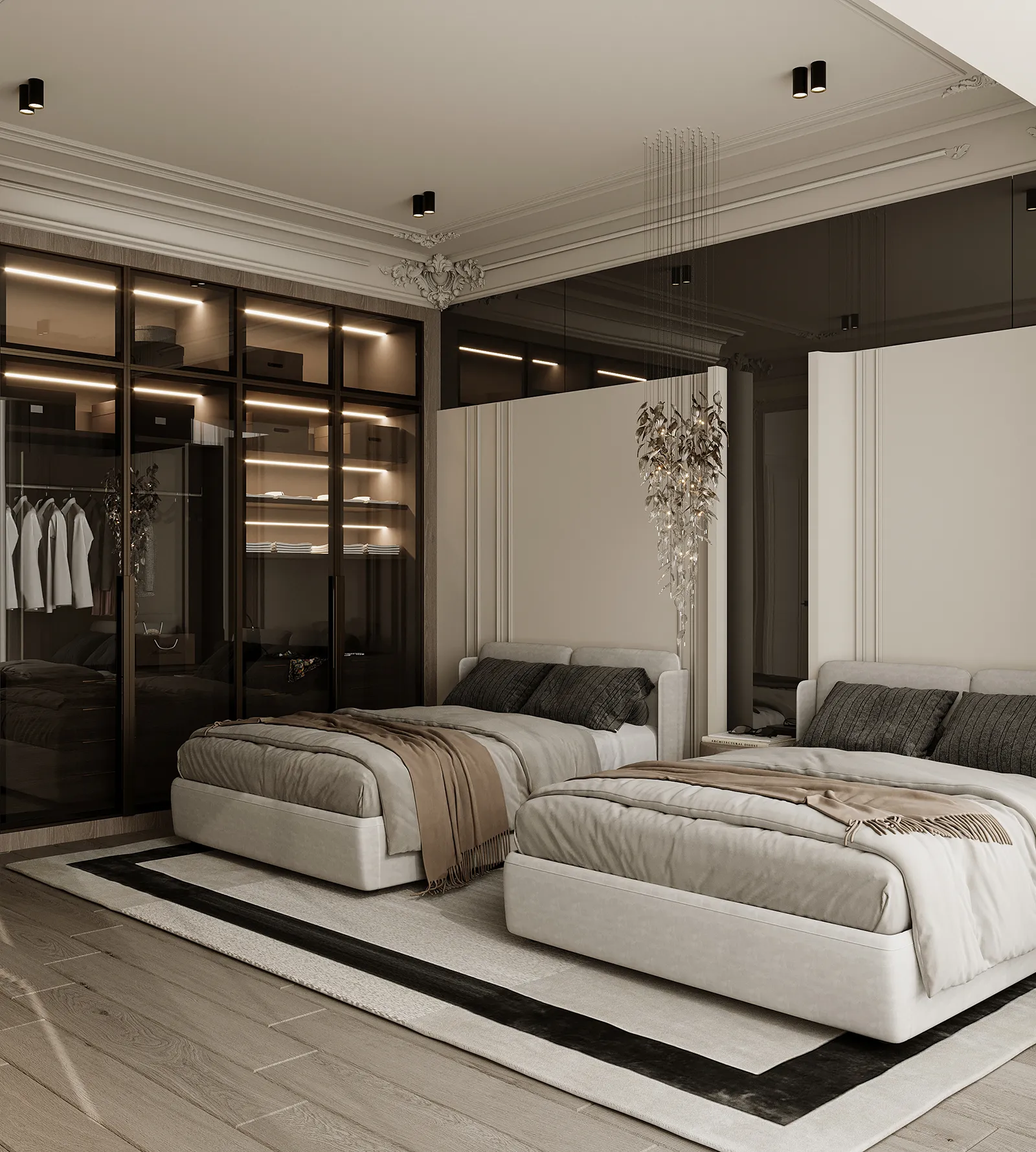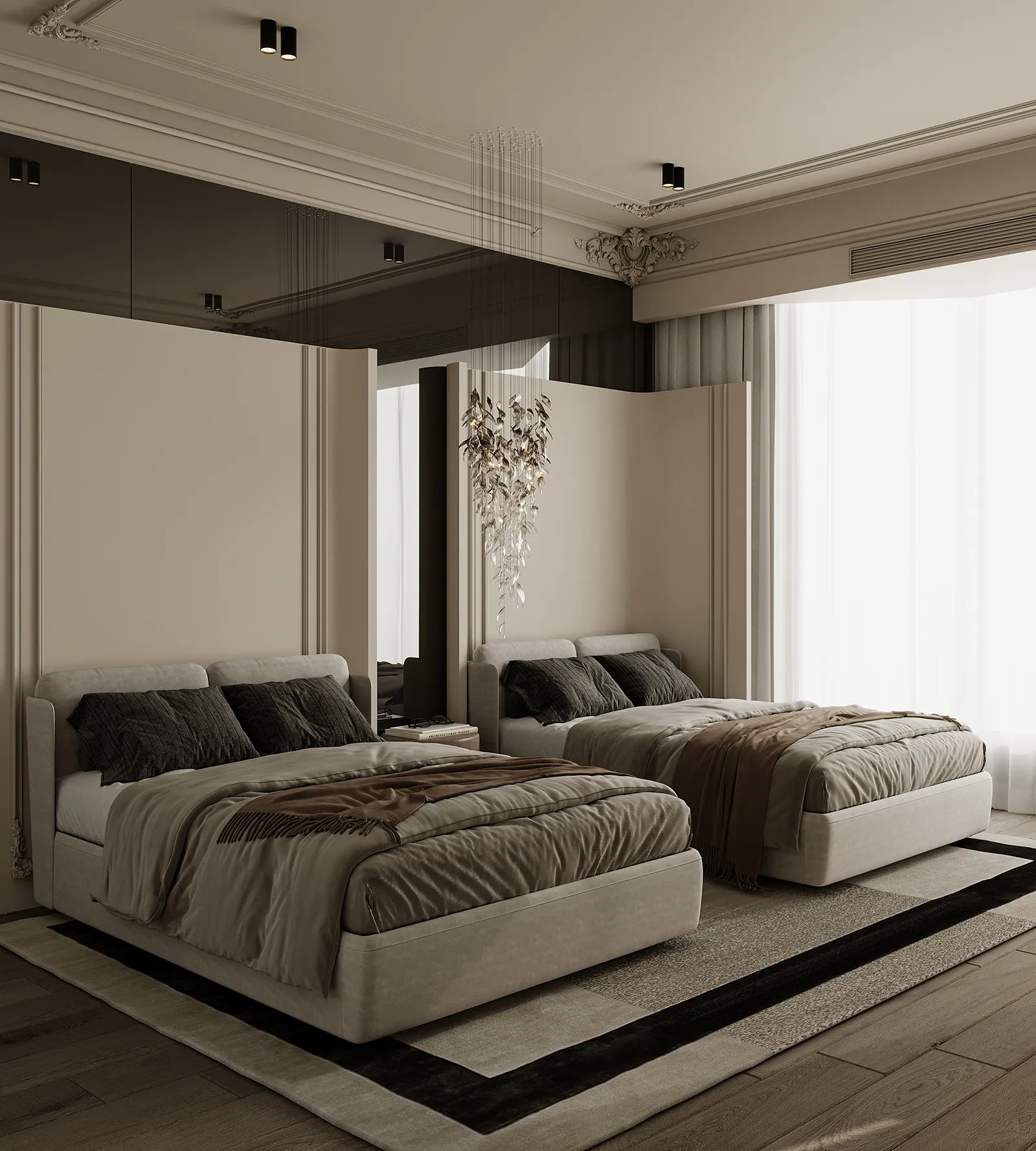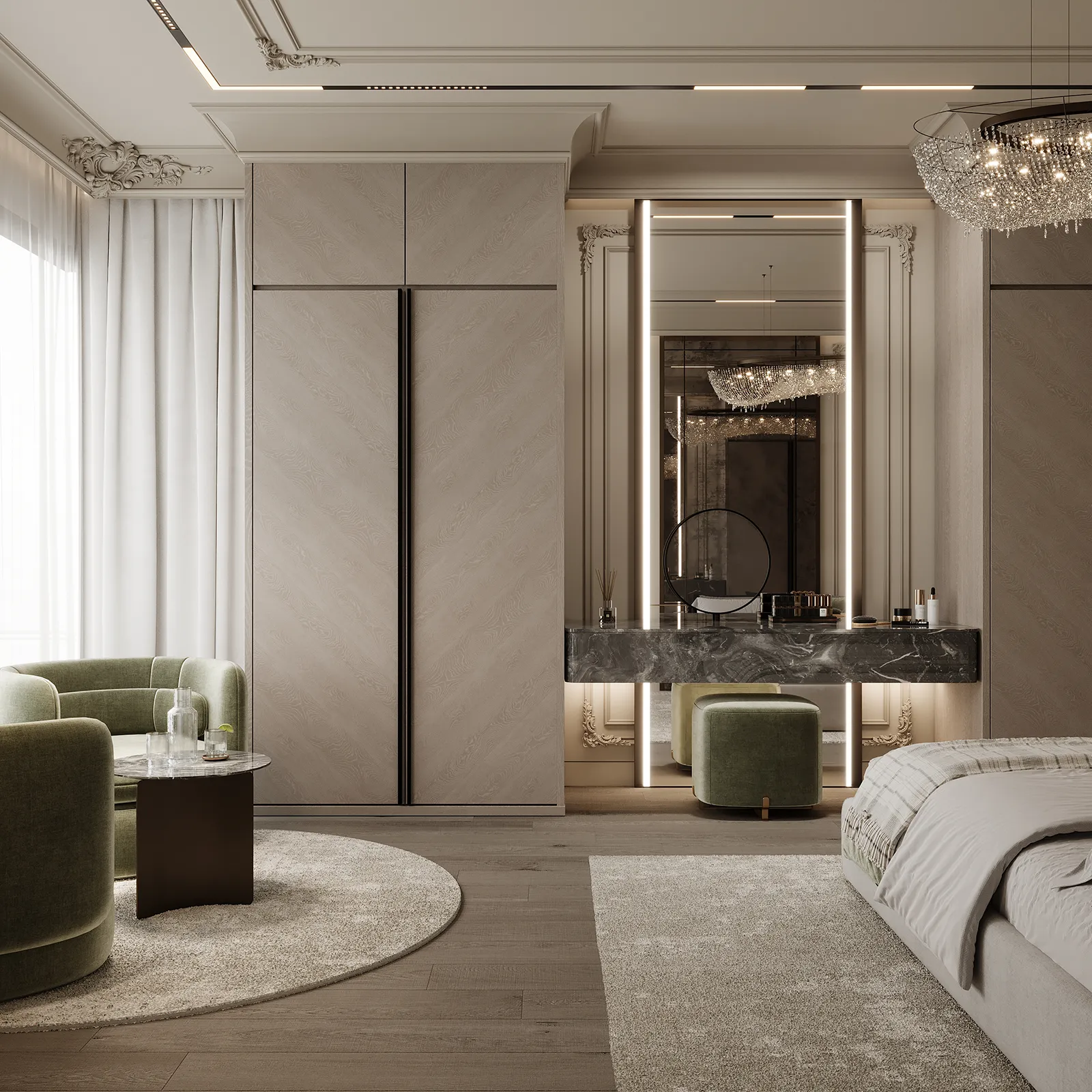 While the public areas celebrate this classical sophistication, the private bedrooms transition into serene, modern retreats designed for rest. Every detail, from the curated furniture to the custom finishes, was tailored to the client’s stature and lifestyle. The result is a quiet yet powerful expression of refined taste—a perfect French-inspired sanctuary on the Nile for a global citizen to call home.