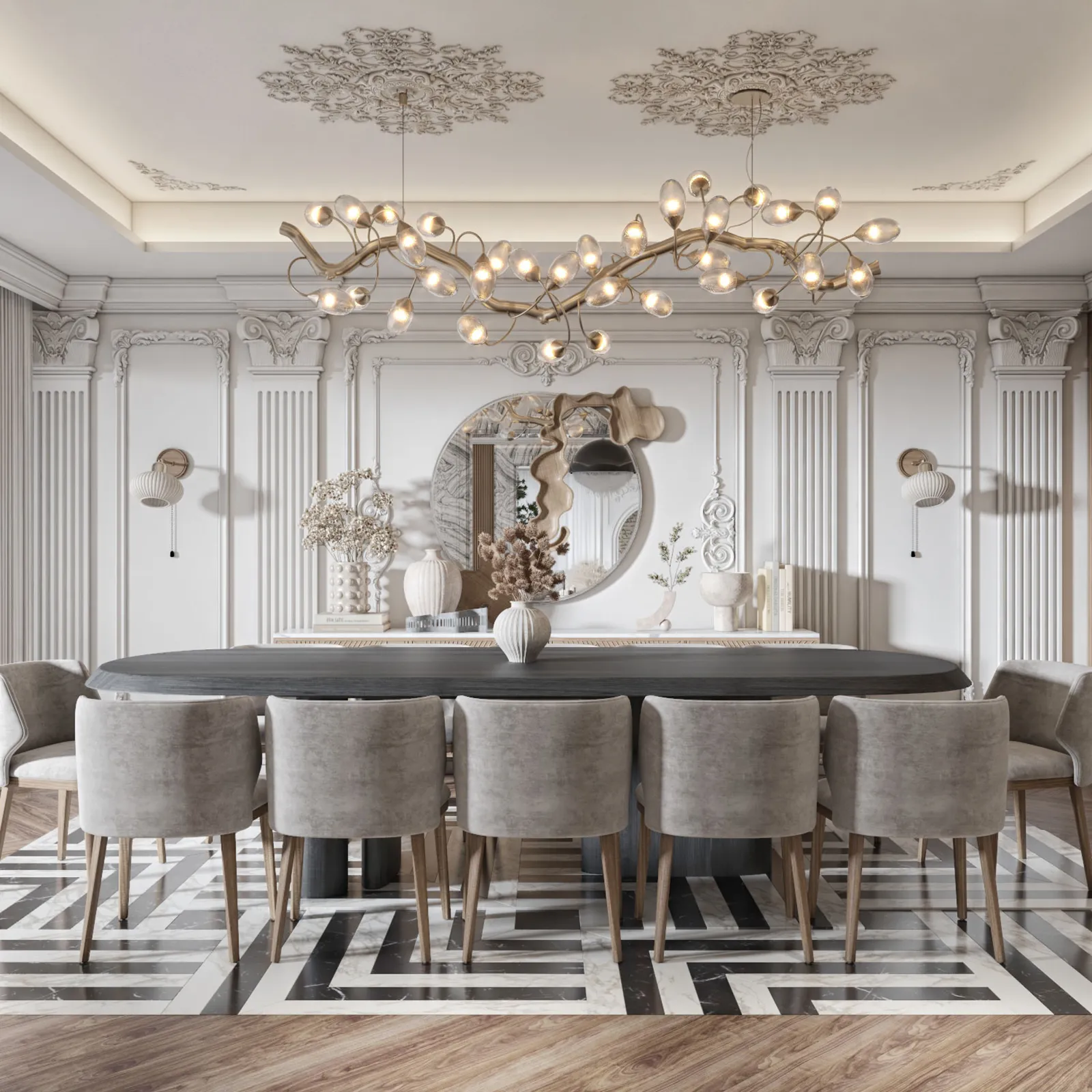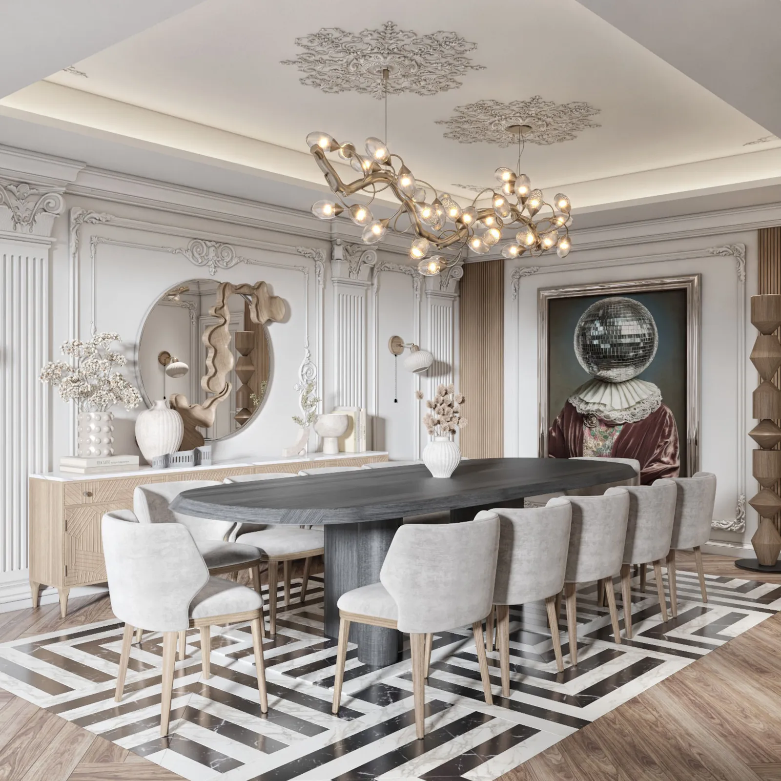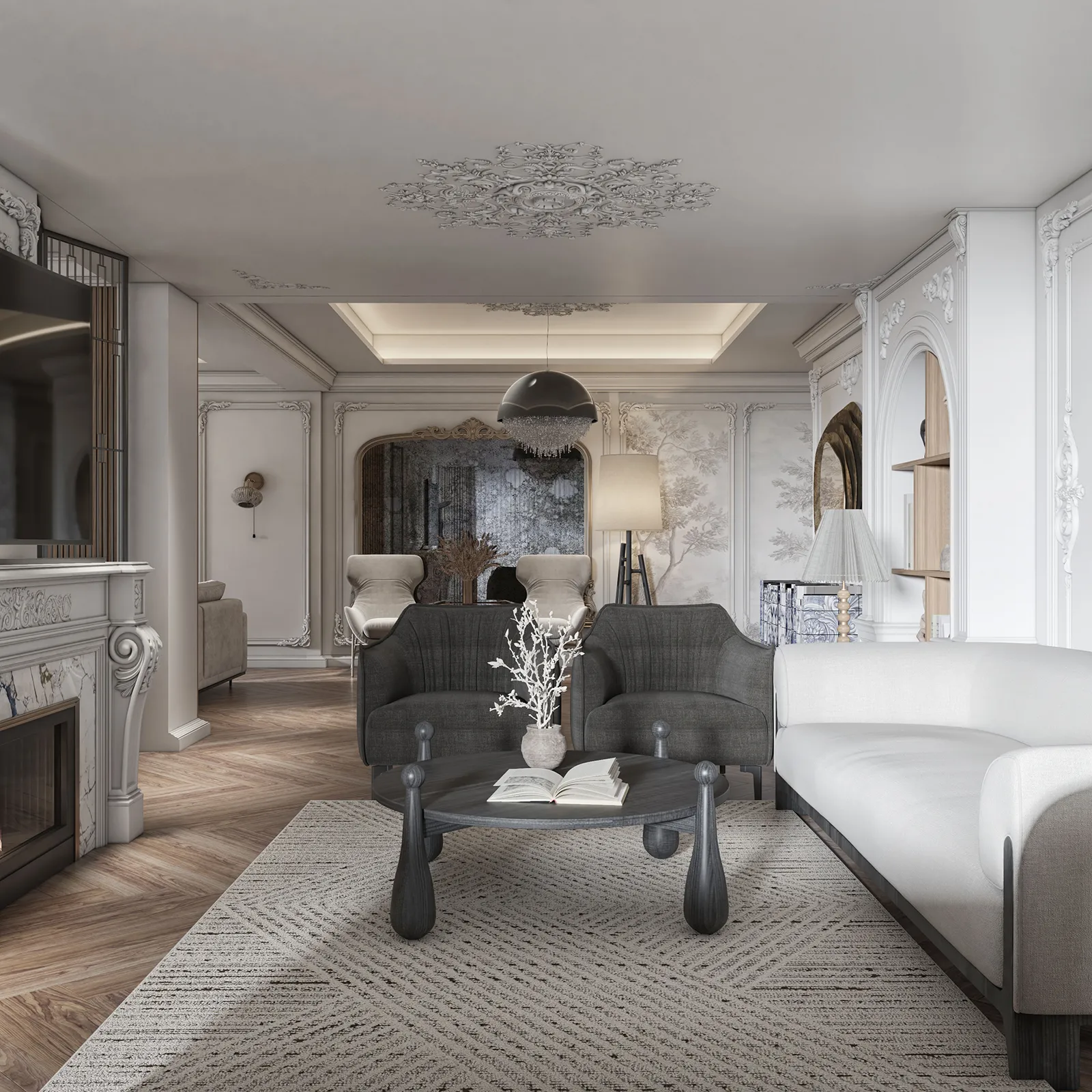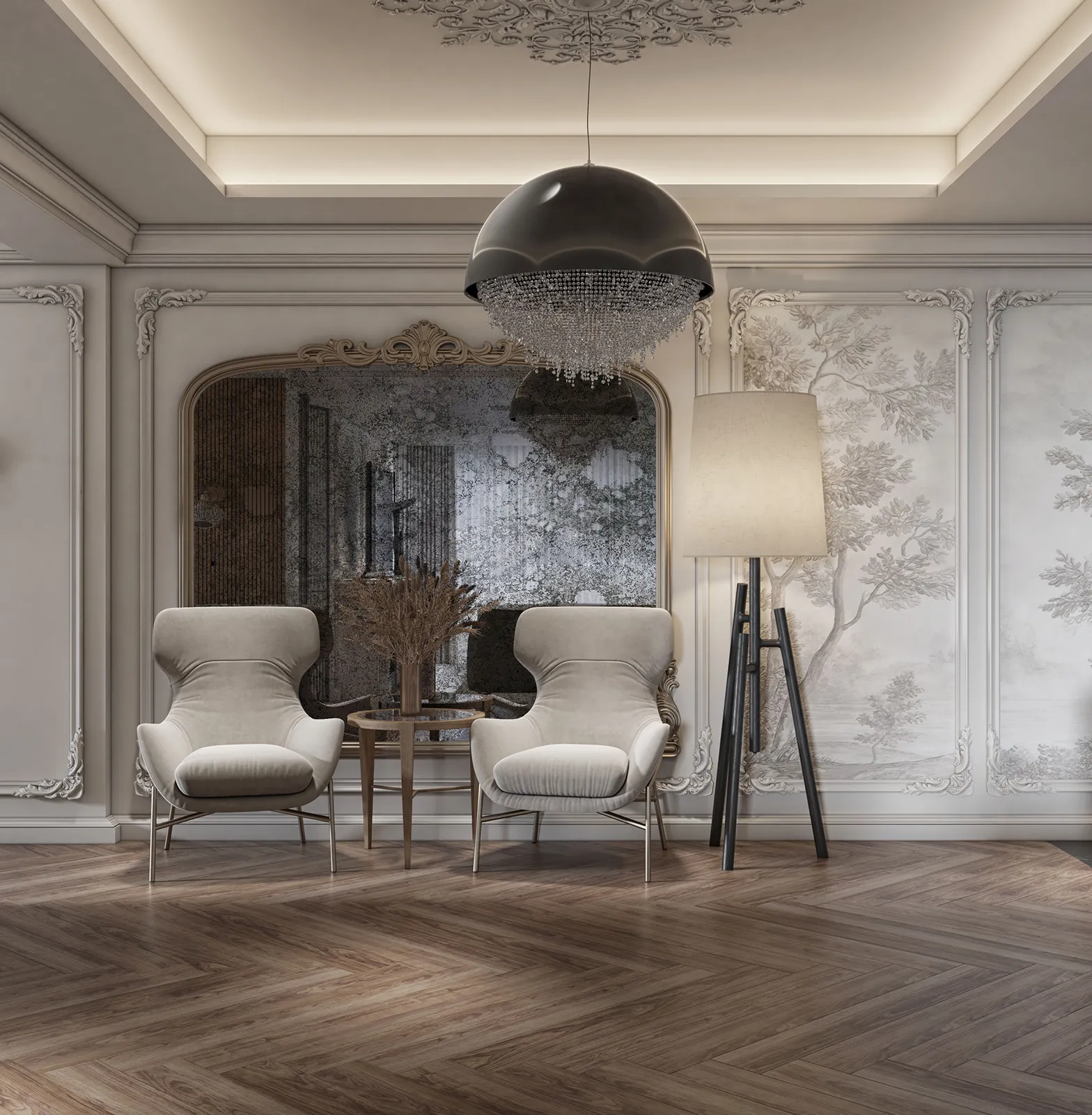 - A refined interplay between traditional wall panels and contemporary geometry.
