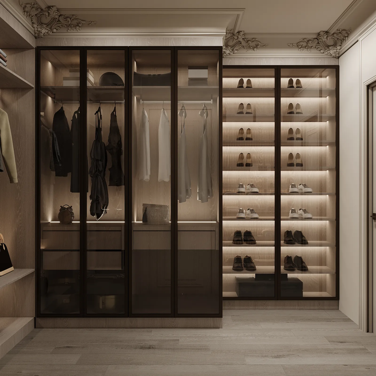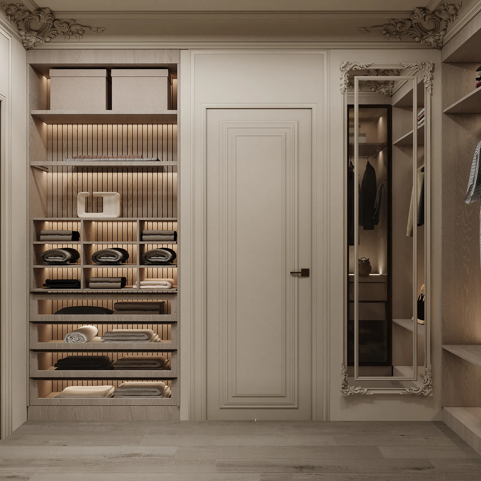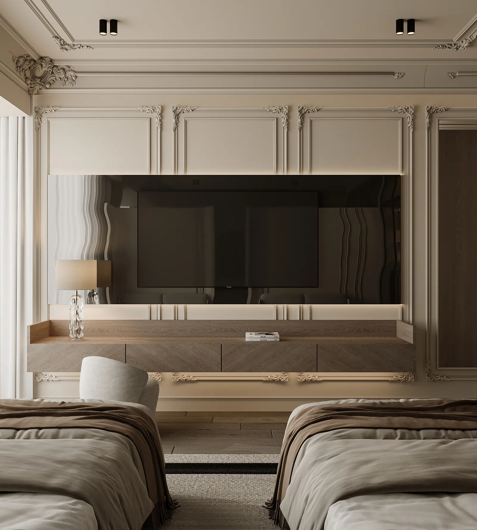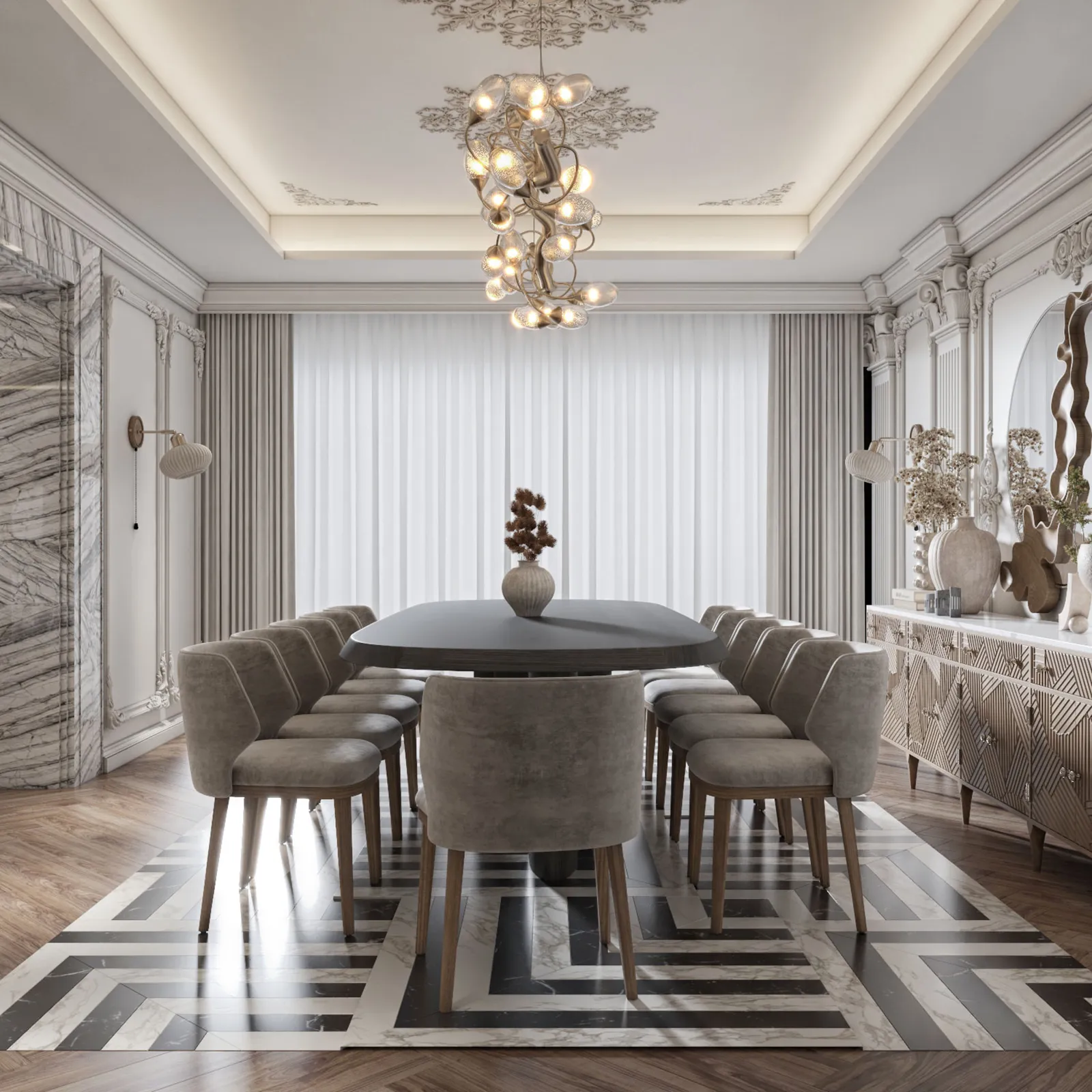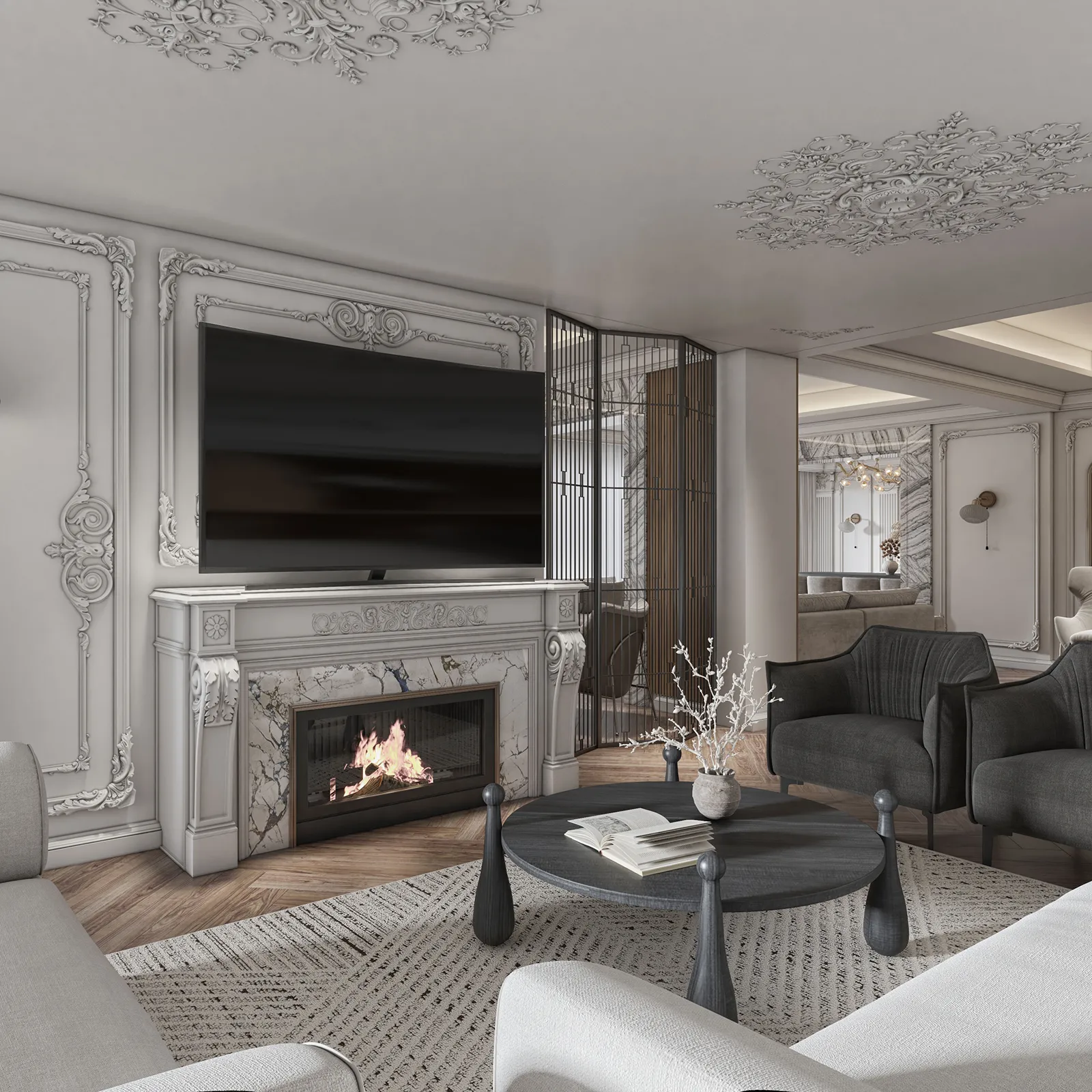 - A refined interplay between traditional wall panels and contemporary geometry.