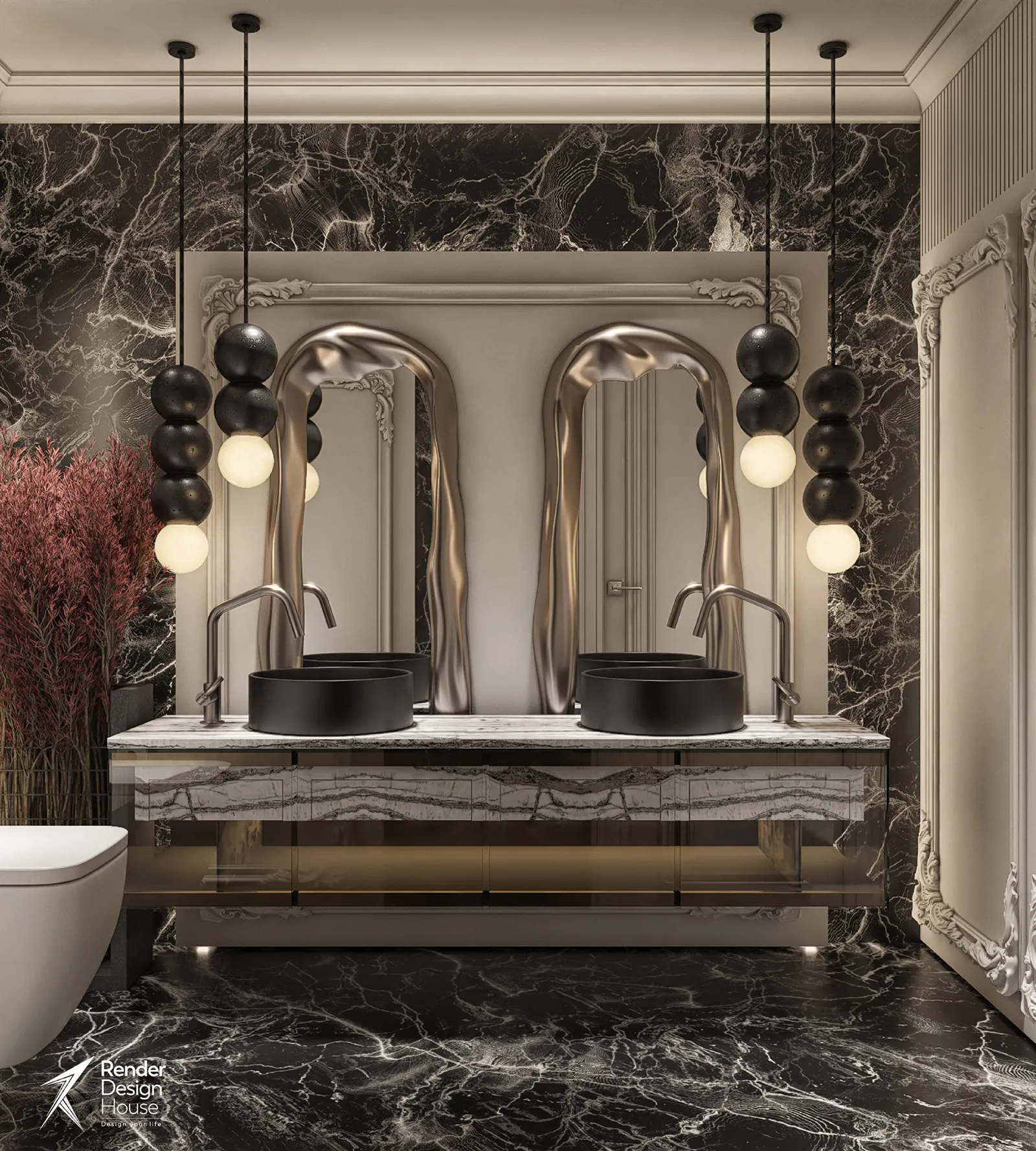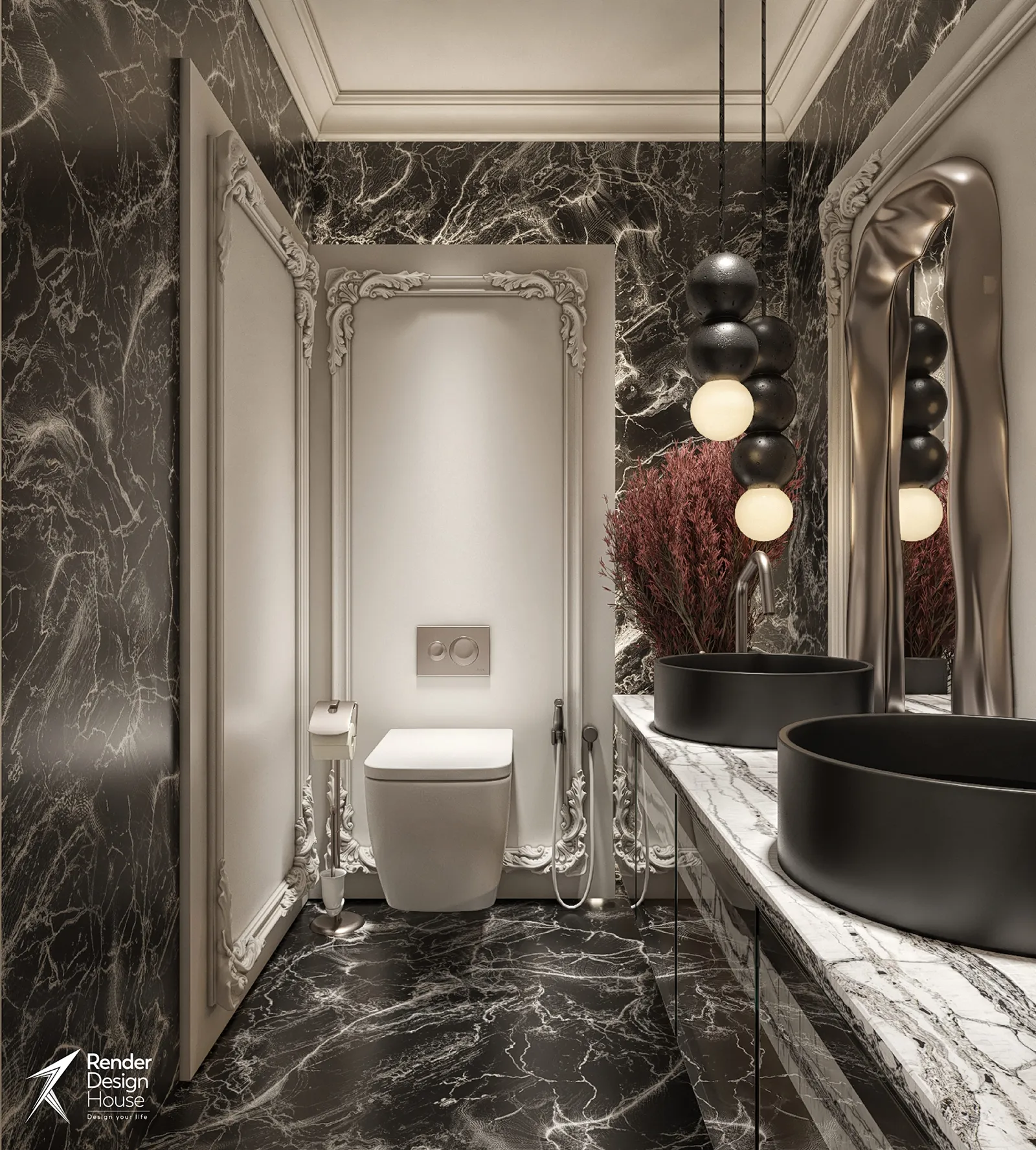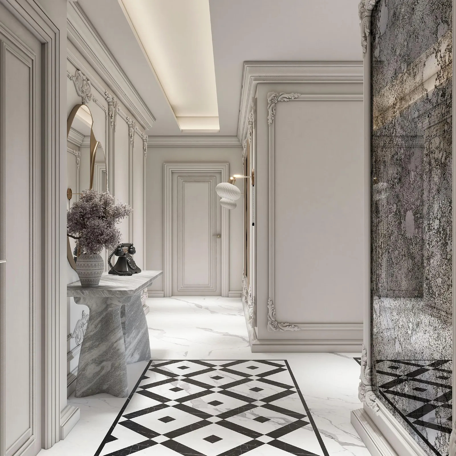 The story begins in the reception area, designed to feel like a classical European apartment. A striking black-and-white marble floor sets a grand stage, complemented by intricate plaster moldings and the soft glow of ceiling coves. This classical grandeur is balanced with modern comfort, creating a space that is both impressive and welcoming.