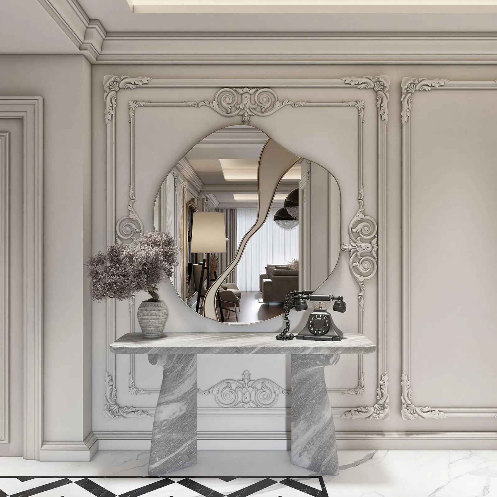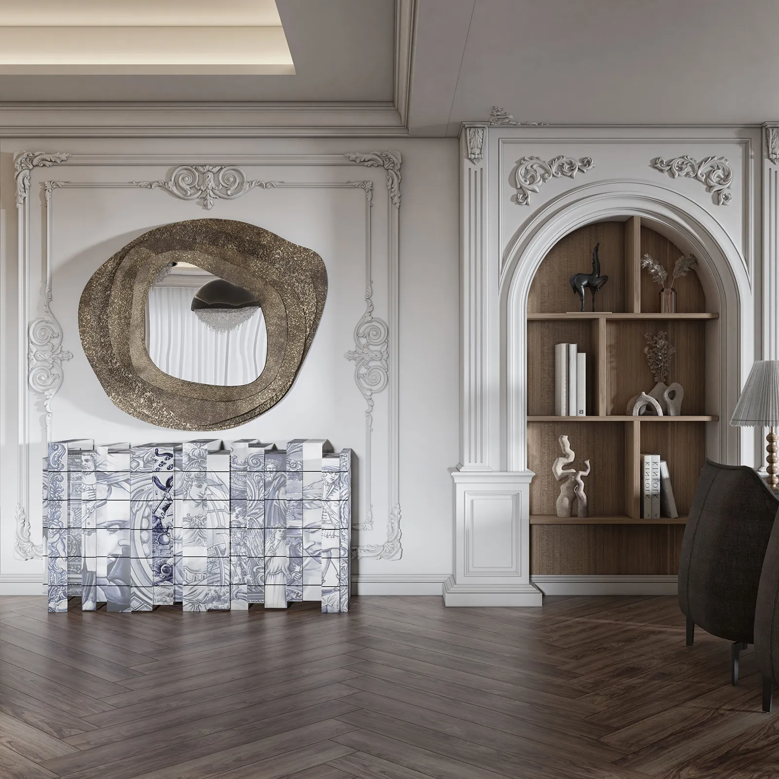 - Statement pieces blending vintage mirror panels with lustrous gold detailing