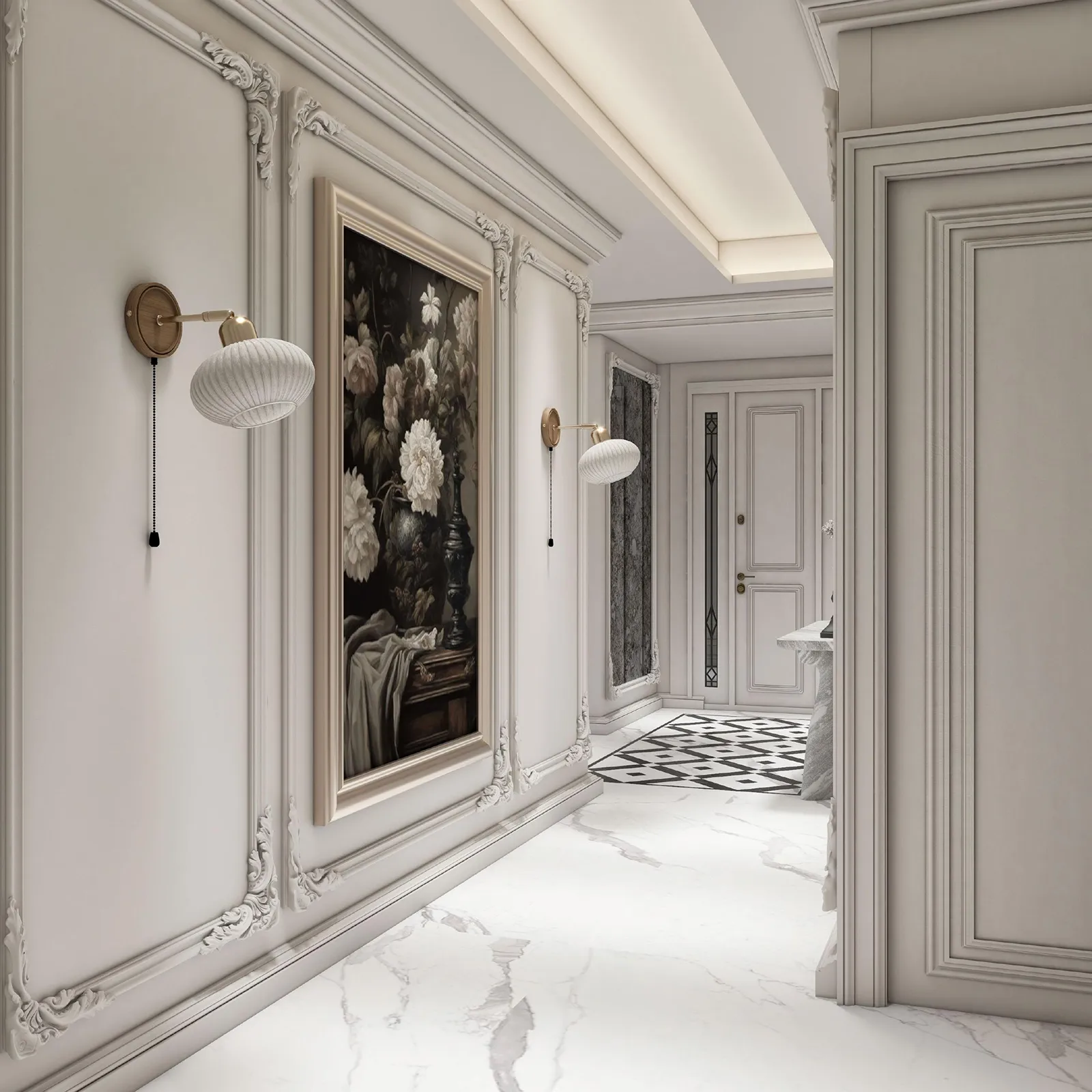 - Intricate neoclassical wall moldings and paneling that add depth and character.