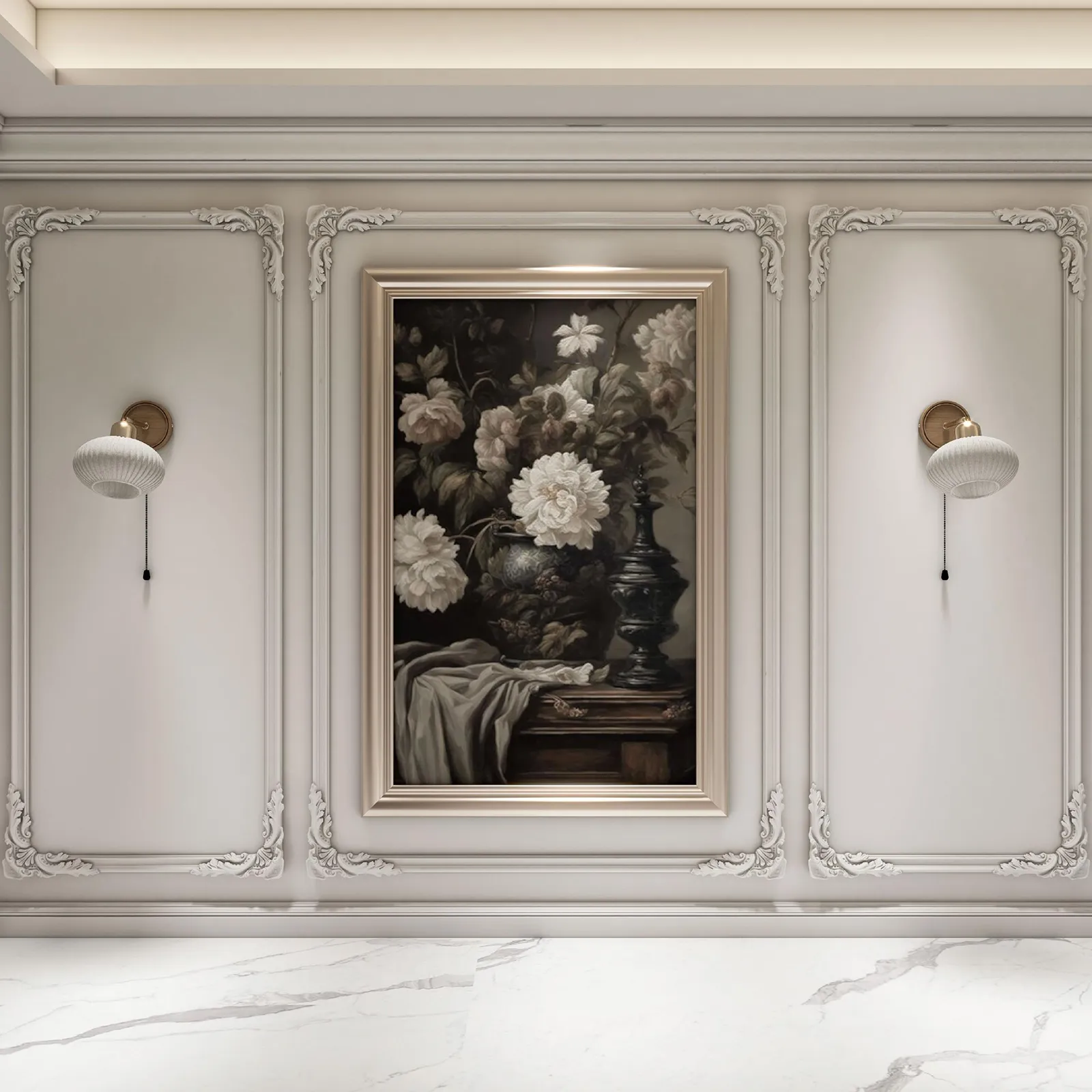 - A large, classical floral artwork that serves as a focal point, adding a touch of timeless beauty.