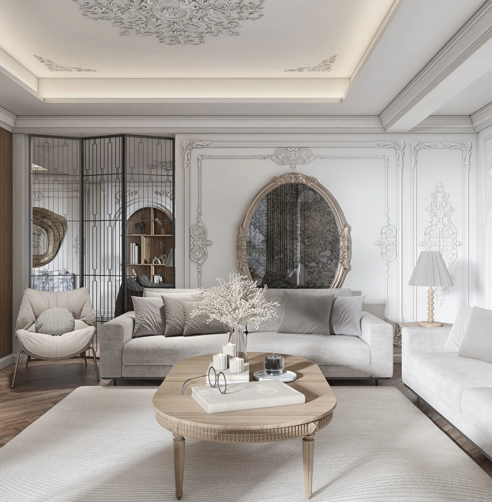 The palette is a refined symphony of crisp whites, warm off-whites, and tonal greys, all enriched by touches of polished gold, antique mirrors, and deep walnut. Rich materials like white marble, fluted mirrors, and velvet upholstery add layers of texture and warmth.